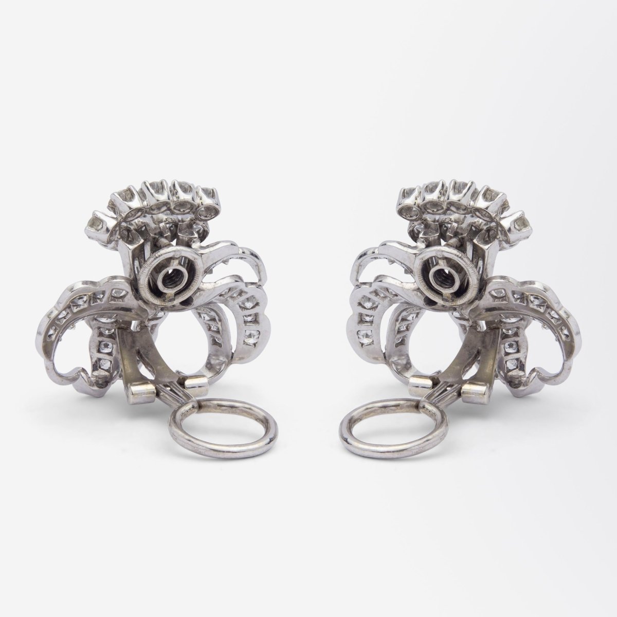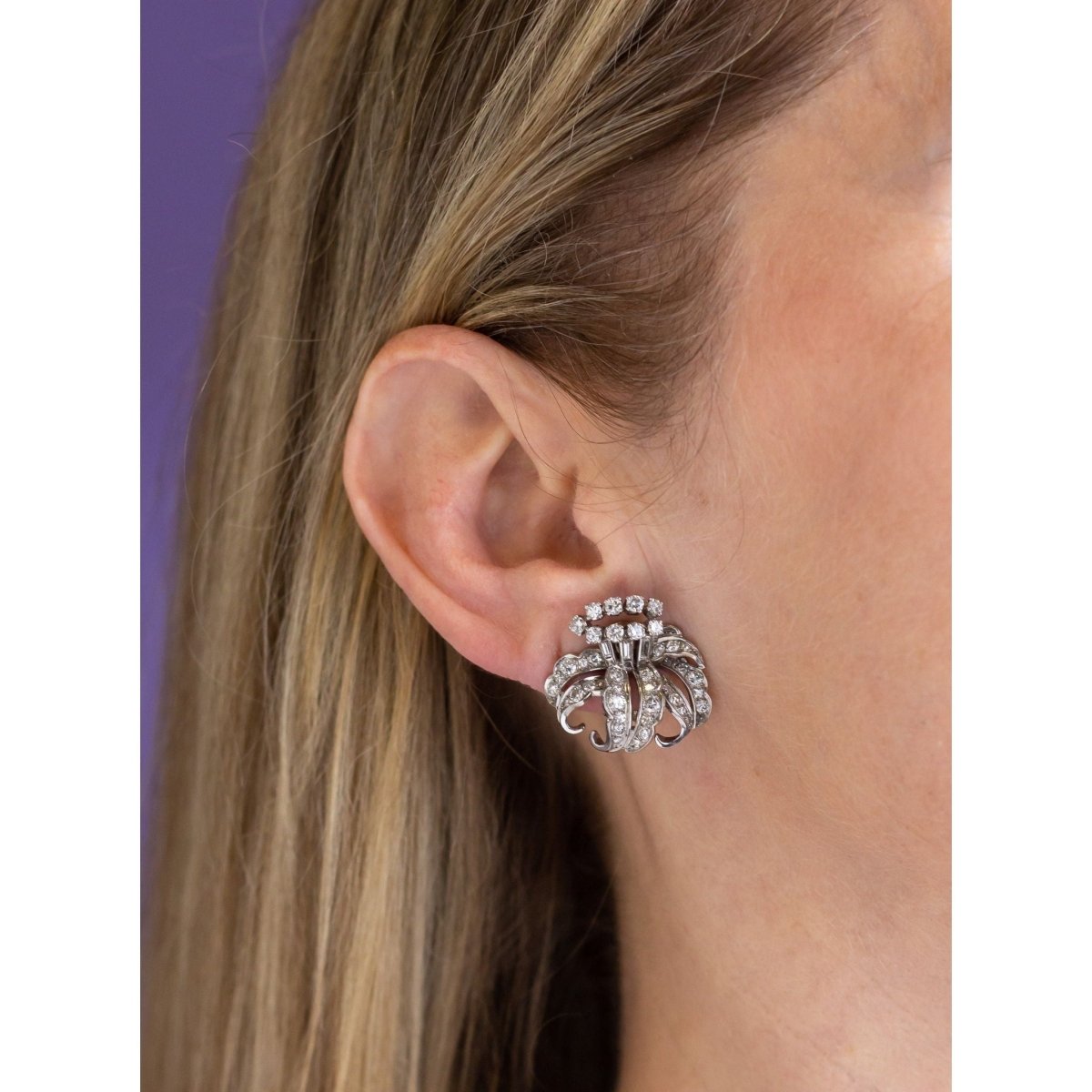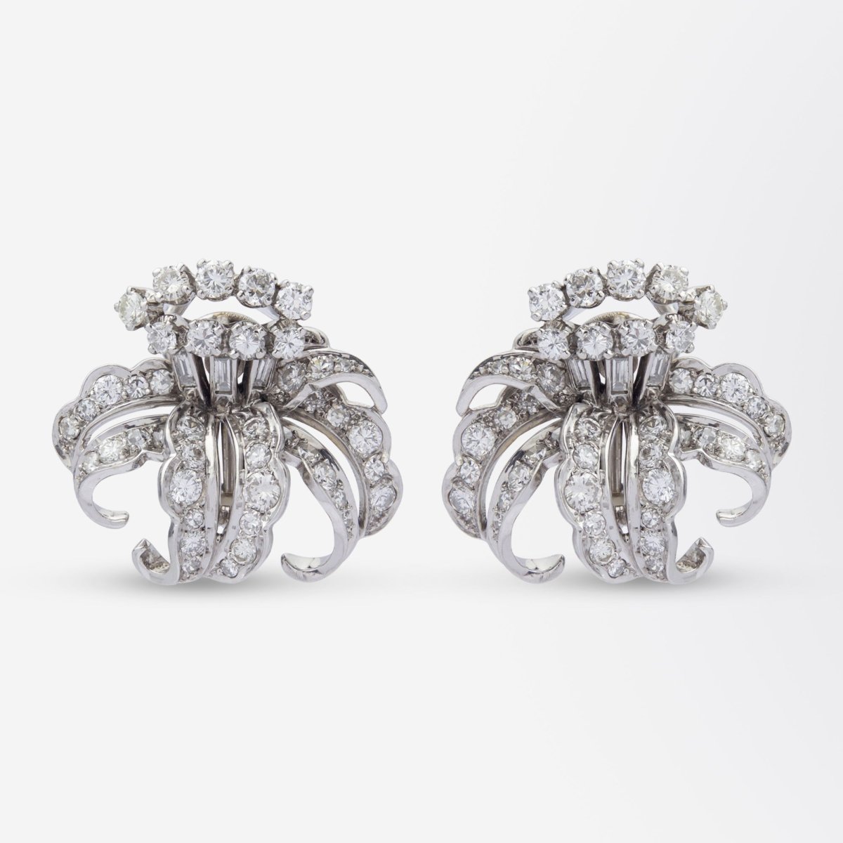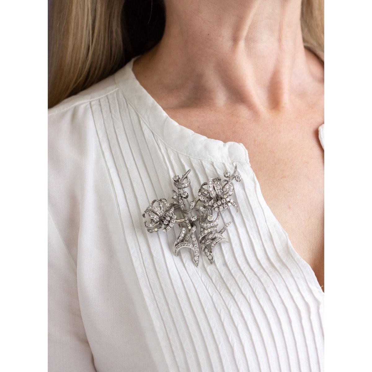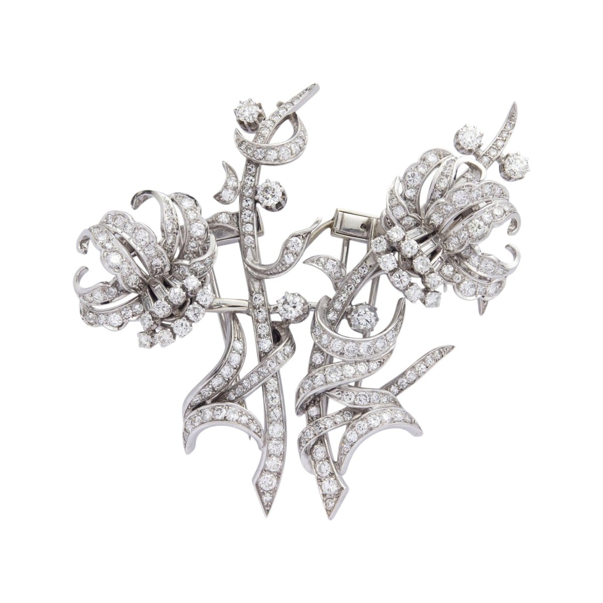A very fine and versatile French platinum brooch pin with detachable dress pins and ear-clips. The floral spray pin is stamped with French assay marks for both platinum and 18 karat gold. Designed to be worn in three ways, the pair of dress clips mount onto a frame to allow them to be worn as one large brooch pin, alternatively the central orchids can be detached and worn as clip earrings. Entirely set with modern brilliant cut and baguette cut diamonds, this piece certainly shines bright. The diamonds in the piece are all of G/H colour and VS-SI clarity and have been claw or mille grain set. The closure to the rear is a hinged pin and and has a sliding tube clasp for security. The piece dates to the 1950s and is a beautiful example of the 'cocktail' jewellery that was produced in that period, especially in France.