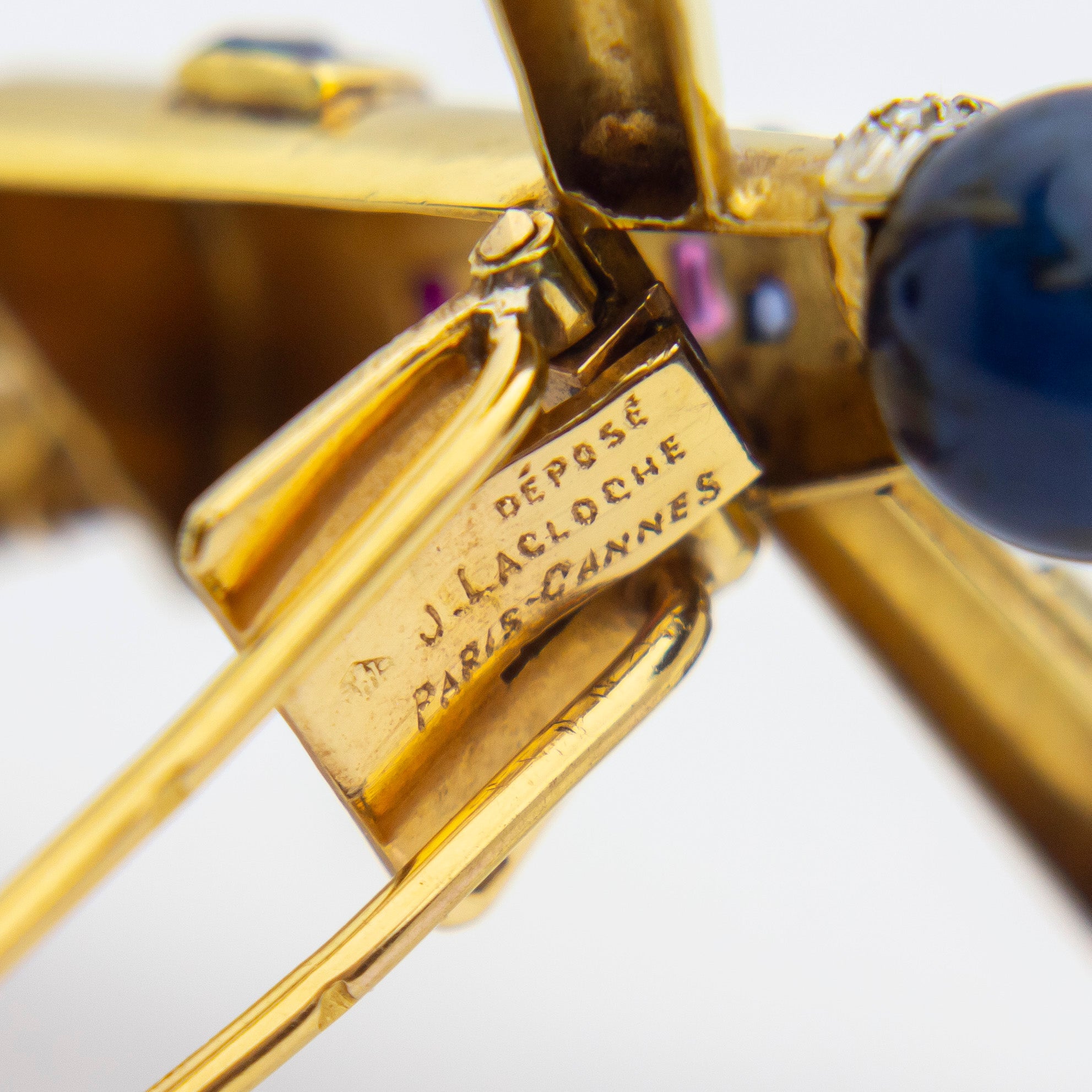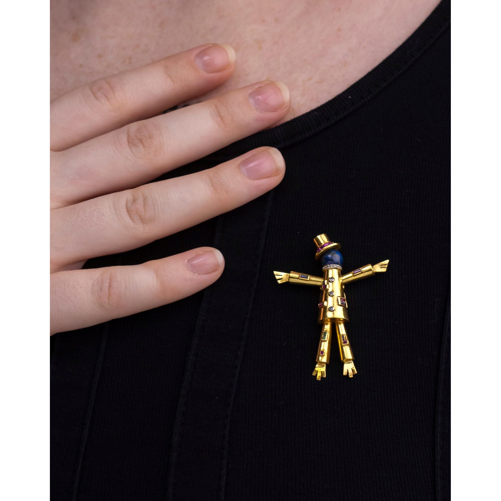 This whimsical brooch pin was made by Jacques Lacloche in France and is what we we define as a piece of 'Retro' period jewellery. The petit pin has been crafted from 18 karat yellow gold in the form of a field scarecrow, and then set with rubies, emeralds, sapphires, diamonds and a single piece of lapis lazuli. The clothes of the scarecrow are set with an array of tiny baguette cut and calibre cut rubies, sapphires and emeralds along with three diamond 'buttons' on his coat that has a very fine diamond collar. The scarecrow's head is a round orb of lapis and he has a tiny yellow gold hat further set with rubies. To the rear the brooch is secured to a garment with a hinged double pin which is fully signed for 'J Lacloche' who are the period this piece was made had outlets in Paris and Cannes. There are several small gold poinçon marks to the rear of the piece, including the eagle head and the dog head which are French marks for gold and platinum. Lacloche in their various forms from partnerships to solo enterprises were among the great French jewellers of the late 19th and early 20th century, and this is a really charming and quirky piece that Jacques Lacloche likely produced in the 1940s. The brooch is in very good order for its age however does show some signs of wear like slight knocks and abrasions to the gemstones and some slight warping to his fingers and toes, commensurate with age and use. A delightful piece of French Retro period jewellery which would look wonderful on a man's suit lapel for a black tie dinner or charming pinned through a lady's scarf.