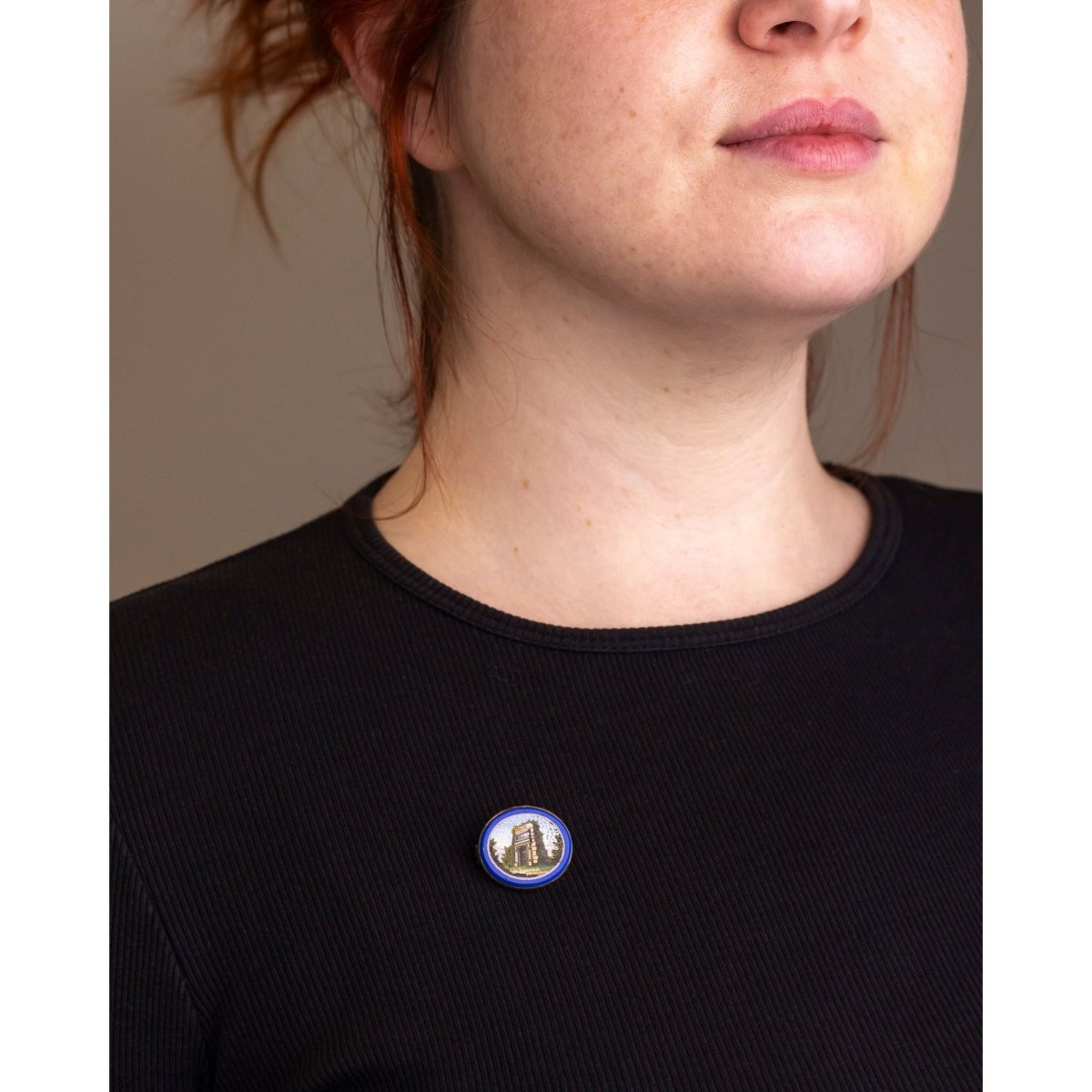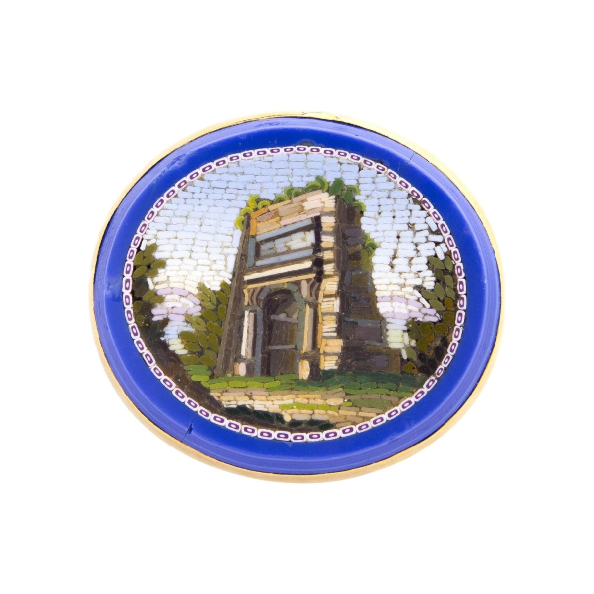 A wonderful micro mosaic pin for a lady or a man depicting the Arch of Titus in Rome, most likely purchased in the 19th century as a Grand Tour souvenir. The gold frame is untested, however is likely to be at least 9kt in purity.