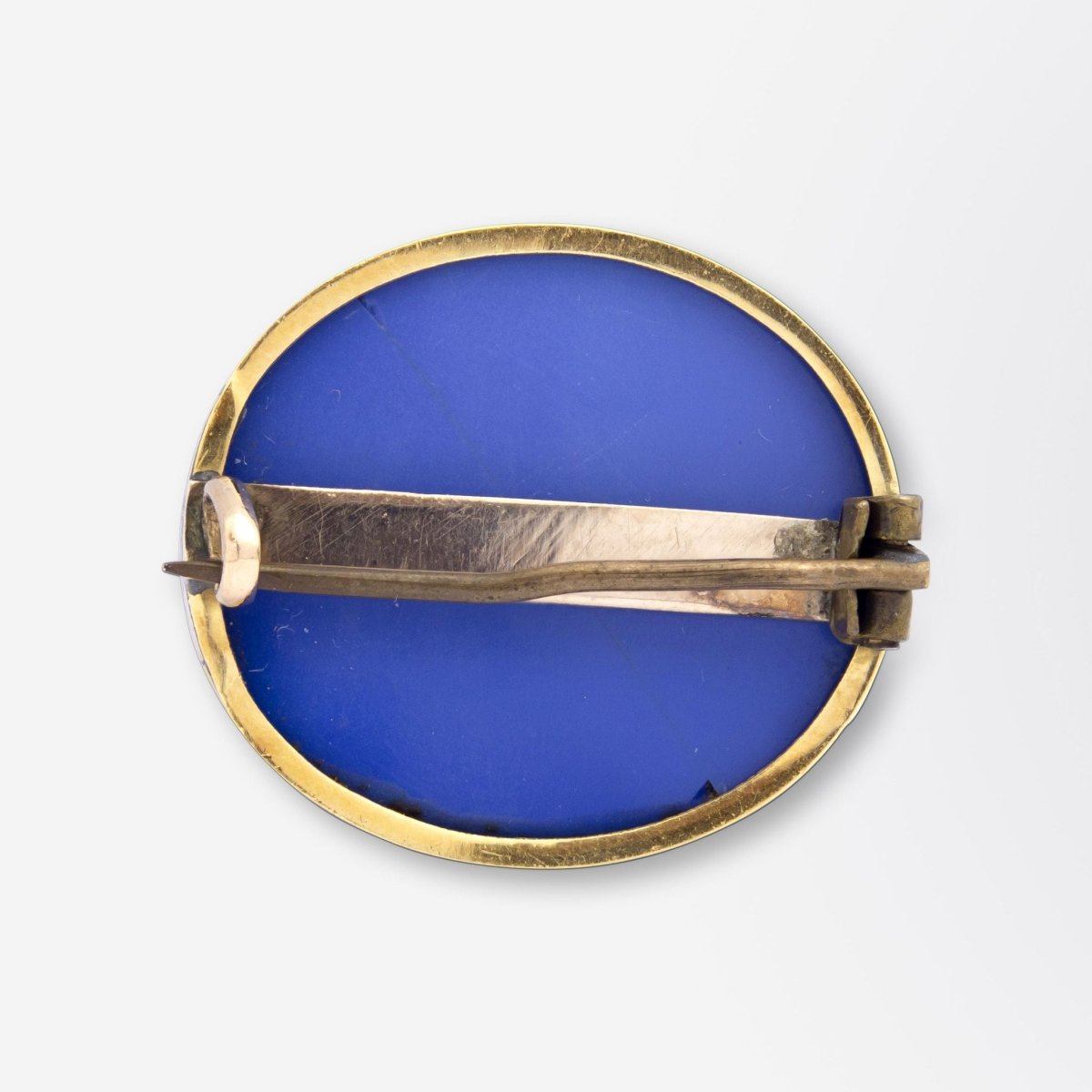Condition: This piece is in wonderful condition for its age and all of the tesserae are intact. The blue glass backing has a fine hairline crack, however is secure and the frame holds the piece tightly together. The pin and clasp are secure and working well.