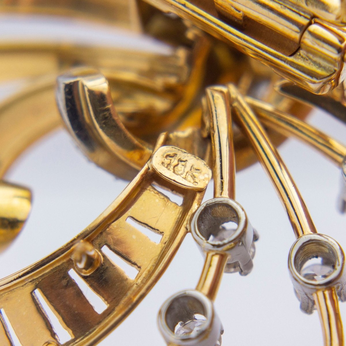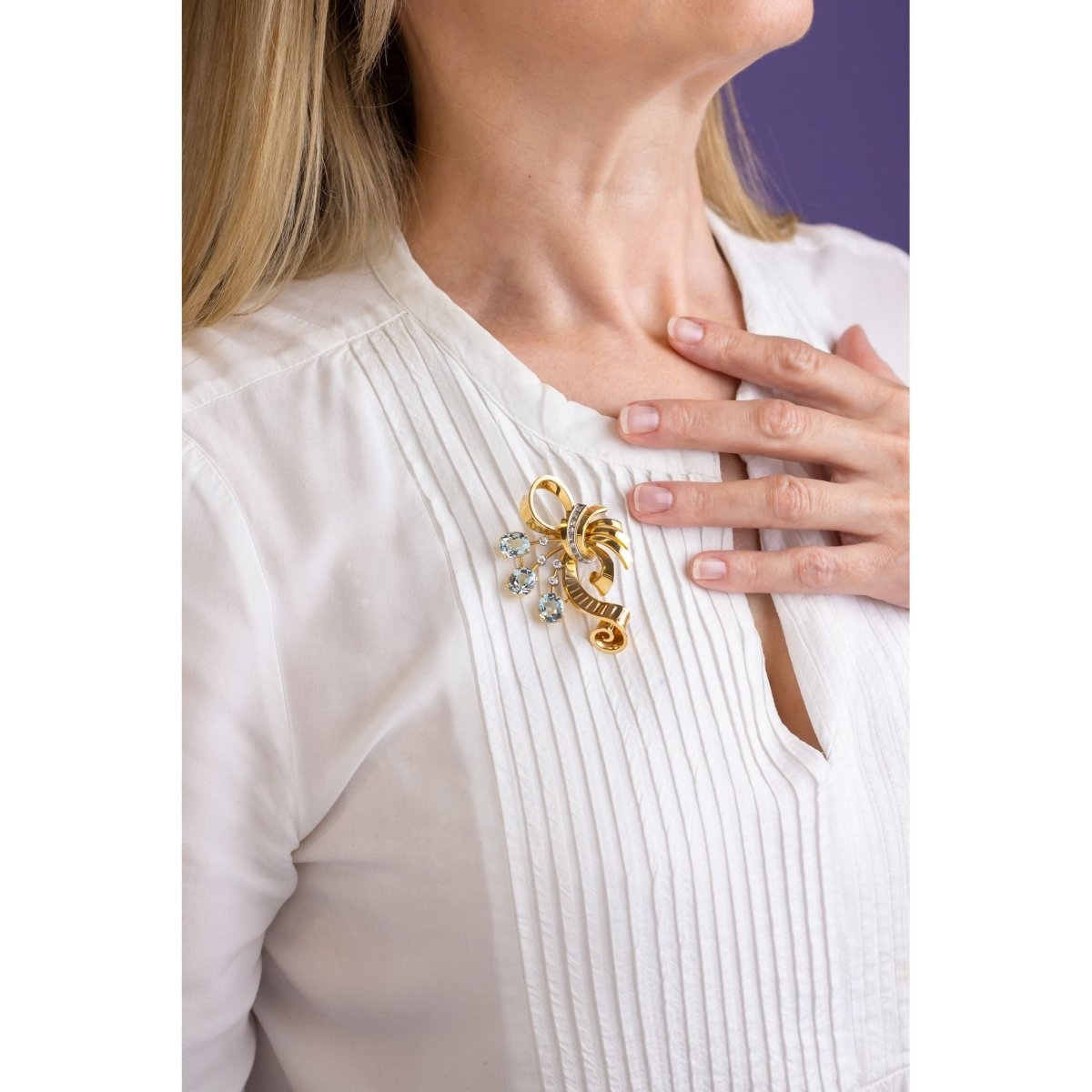 An 18 karat gold 'Retro' period twirling ribbon brooch set with diamonds and aquamarines. The brooch whilst unsigned likely originates from the United States during the 1940s and has many of the machinist and bold qualities that were seen in early Retro period jewellery. The piece is set with 13 diamonds, four brilliant cut stones and 9 single cuts along with three oval cut aquamarines which are all set amongst the flowing machinist gold ribbons which are a recurring element in 1940s jewellery. A gorgeous example of a 1940s cocktail pin that would have seen many a dance and luncheon!