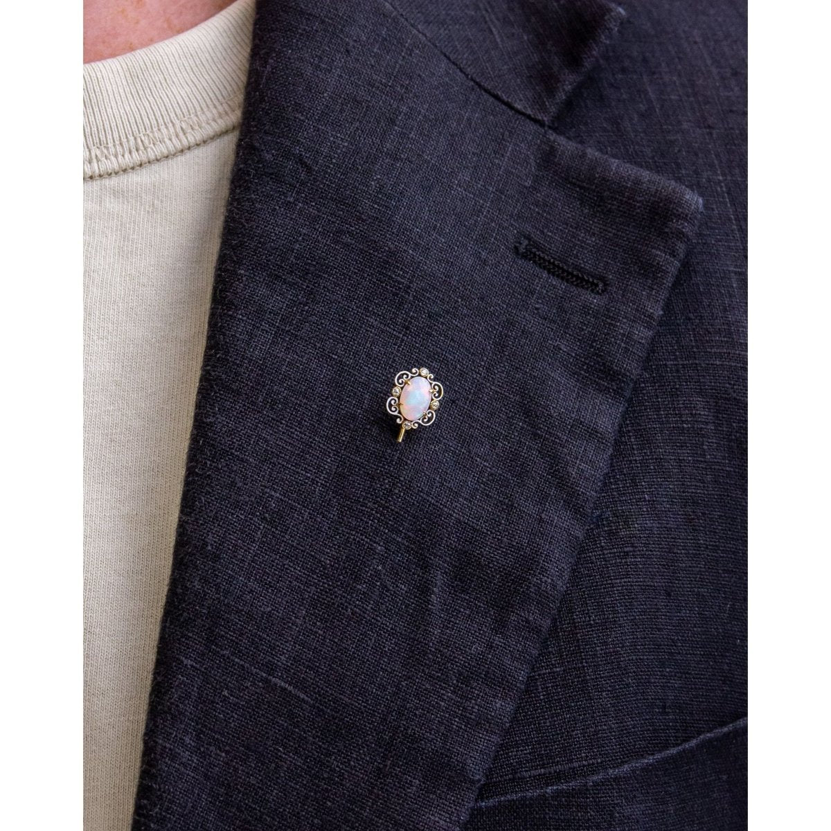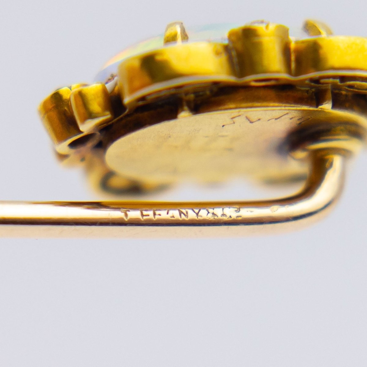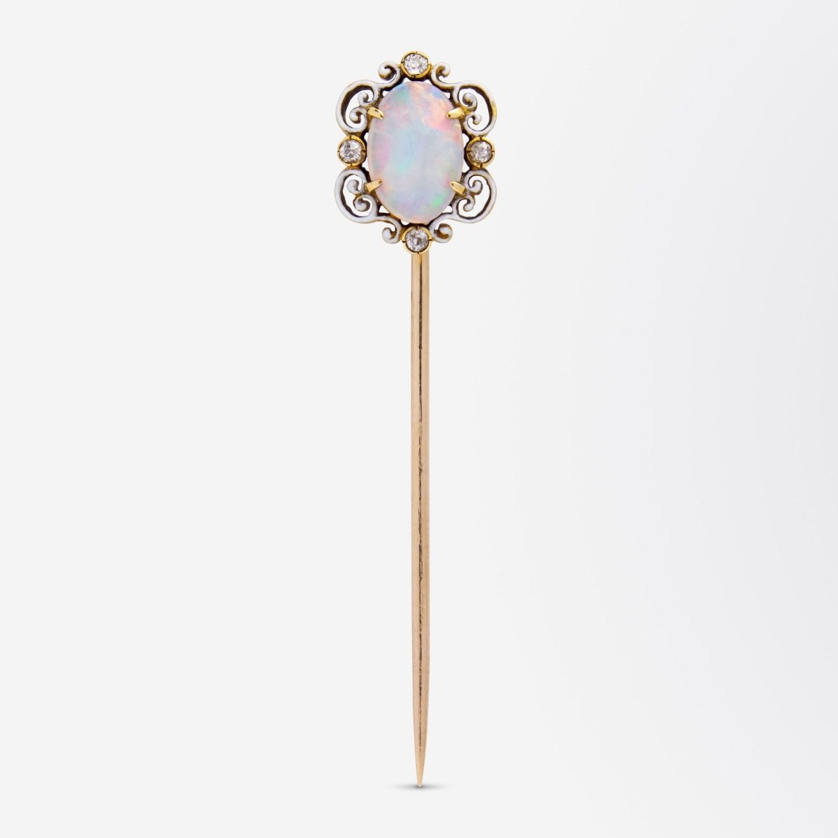 Crafted from 18 karat yellow gold and set with rose cut diamonds and a cabochon opal, this stick pin was made by esteemed jewellers, Tiffany & Company. The 18 karat yellow gold mount has been set with a four claw set cabochon milky white opal, likely Australian, which has been accented with four rose cut diamonds. There is some delicate white enamelling surrounding the opal and diamonds which is extremely fine and beautifully executed. The pin of the piece is marked 'Tiffany & Co' and it also retains its original silk lined retailing box which is branded for Tiffany & Co of New York and Paris. We date the manufacture of the pin to circa 1915, the height of Tiffany & Company when their label produced the some of the finest jewellery and luxury products in the world. This pin is in exceedingly good condition for its age with only some minor wear and losses to the enamelling, which is expected for a piece of this age. An exquisite addition to a gentleman's tie or lapel, but could also be a beautiful accent on a lady's hat or scarf.