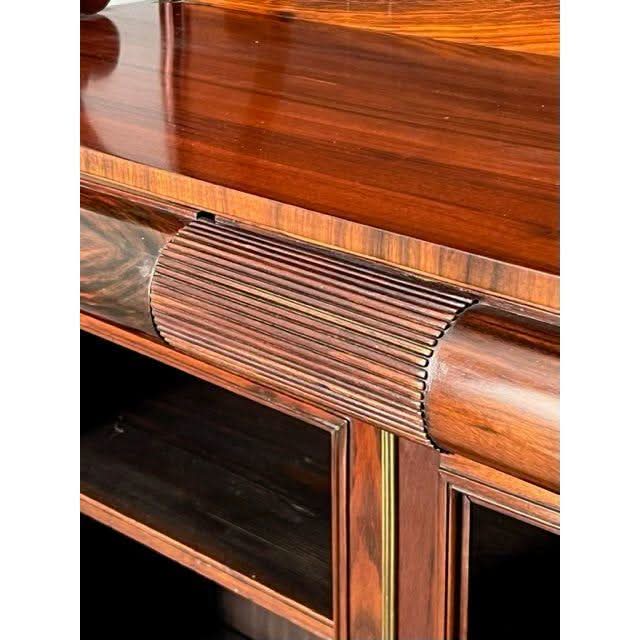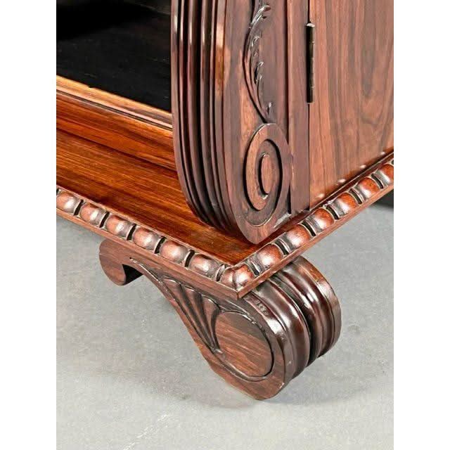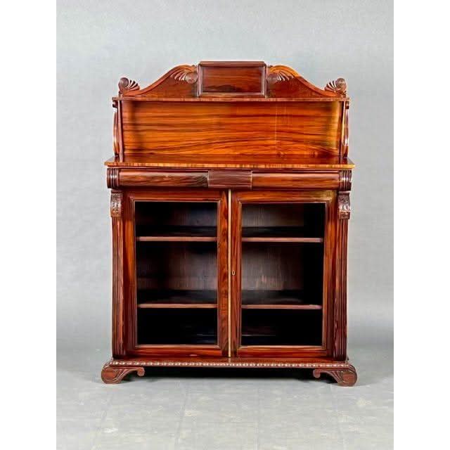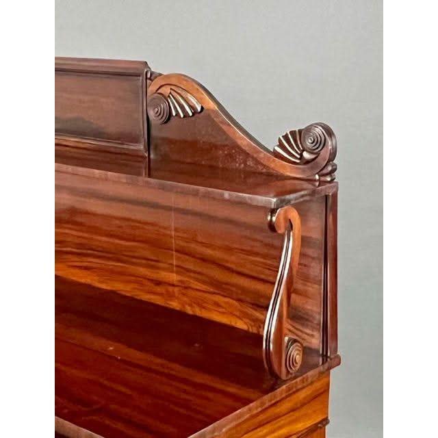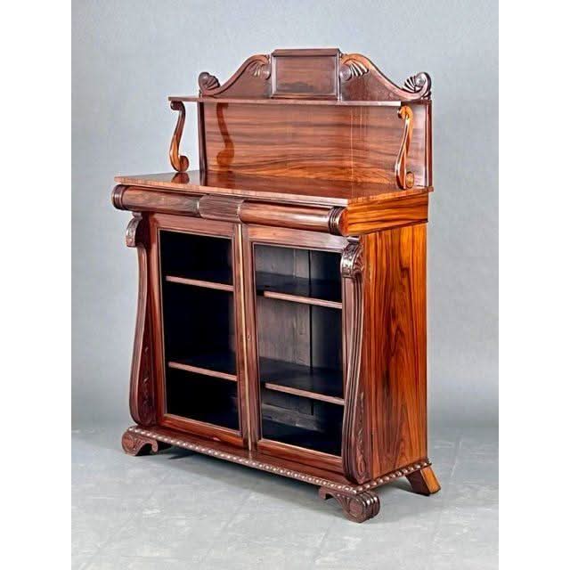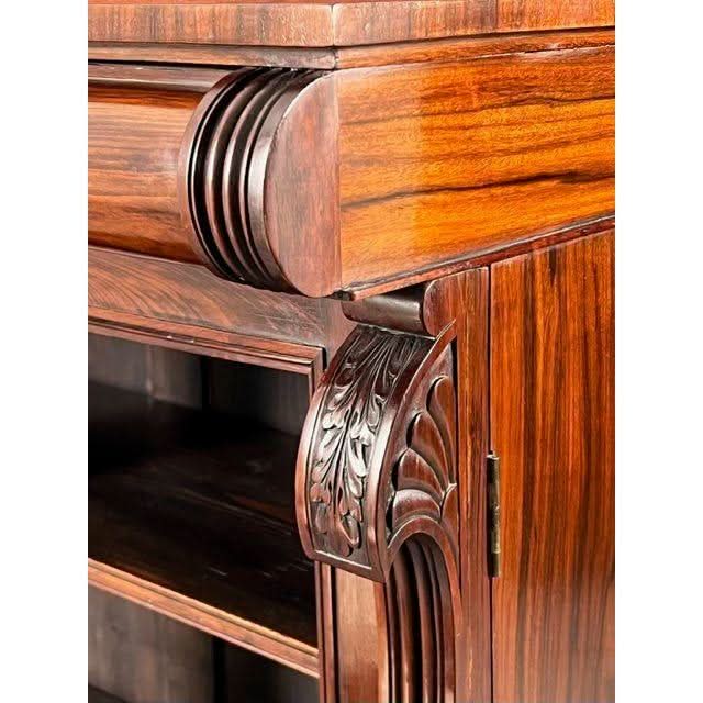 This is a very superior quality and very rare example of a genuine antique English Georgian Regency Period 1811 to 1820 Chiffonier or small Side Board superbly made by craftsmen from imported prestigious and desirable well figured Central American Rosewood and featuring decorative carved Egyptian detailing due to classic design influences brought back to England by people who went on the ‘Grand Tour‘ of the antiquities at Italy Greece Crete and in this case Egypt. These influences became the hall mark of fashionable Regency period interior design and furniture fashion trends.