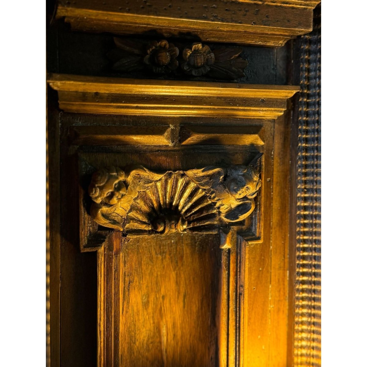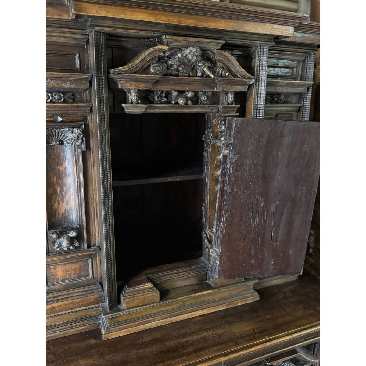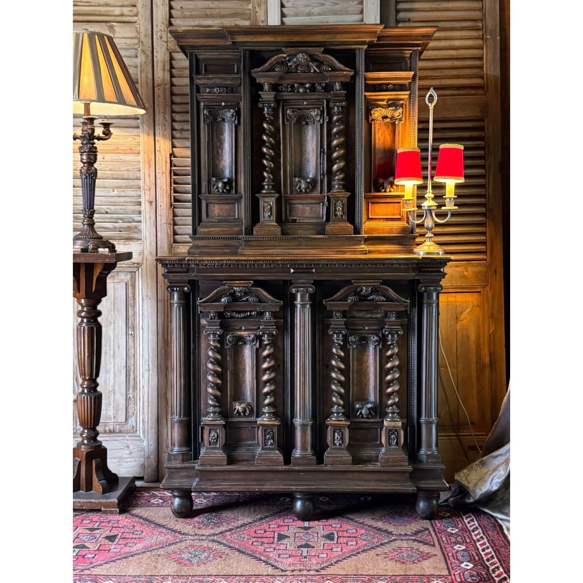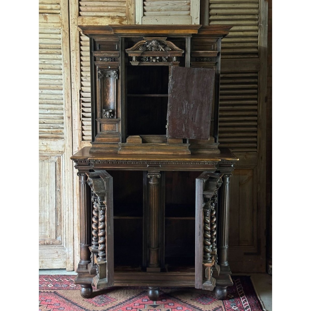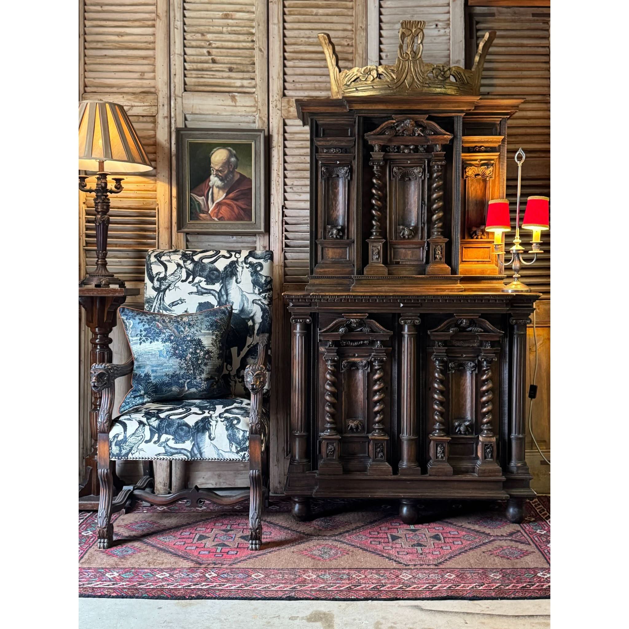 This two-piece cabinet was built to impress, with deep relief carving and a dark, aged patina that speaks to its century-plus of history. Small centre door on the top with internal shelf. Two doors on the lower section also with internal shelf. Marks and patina consistent with age. Circa 1880s.