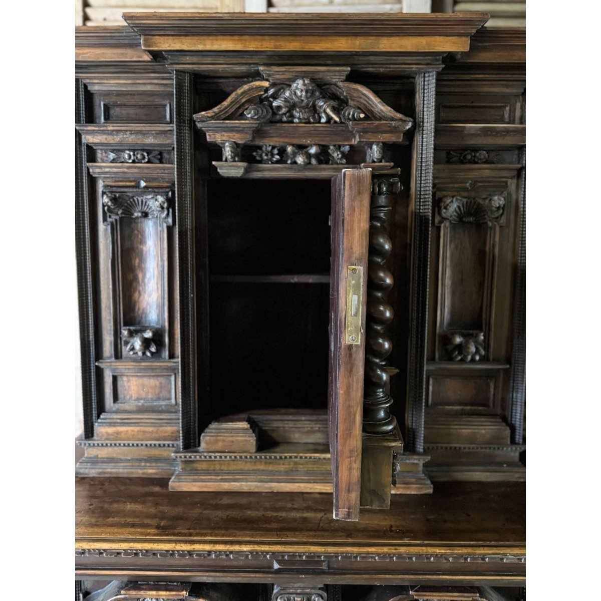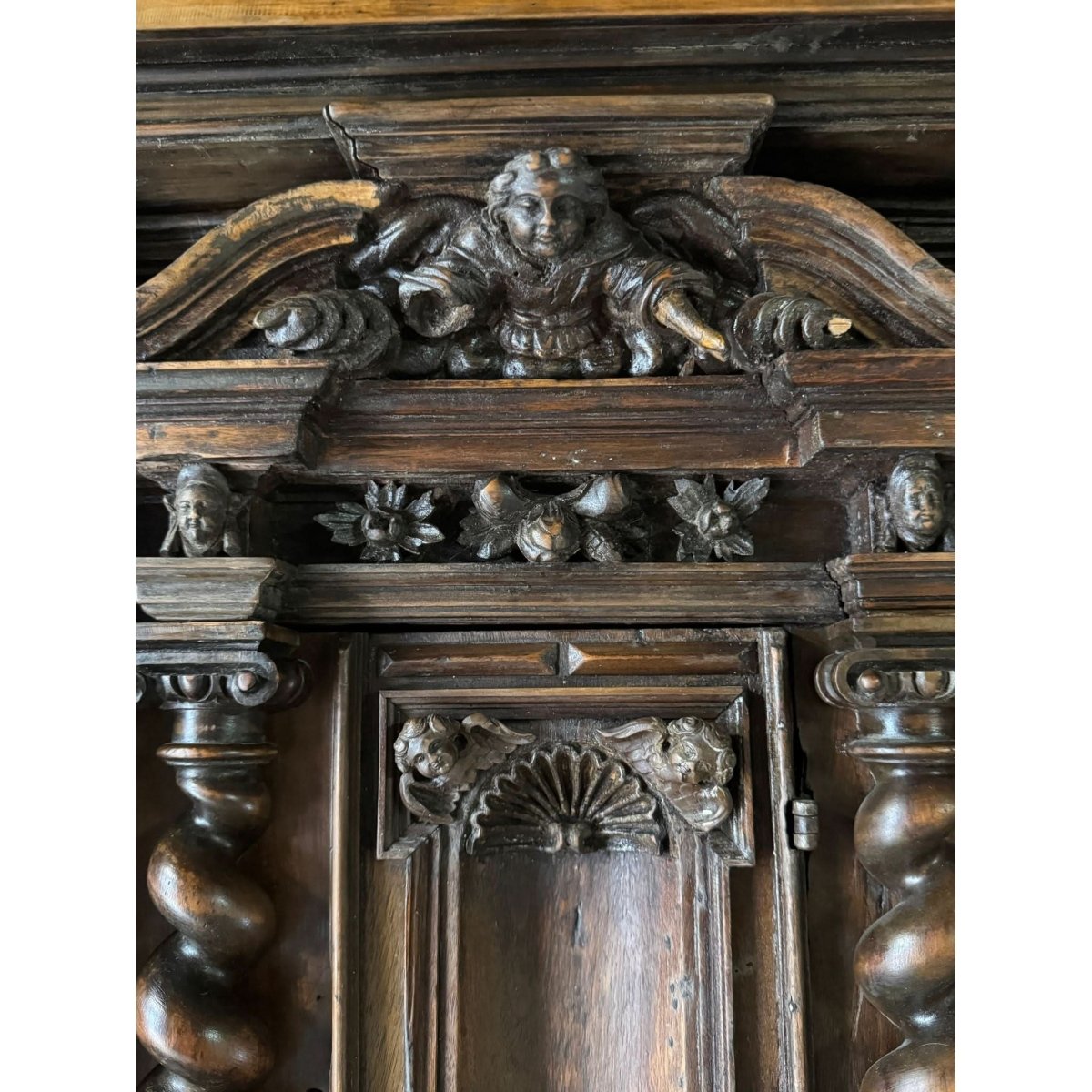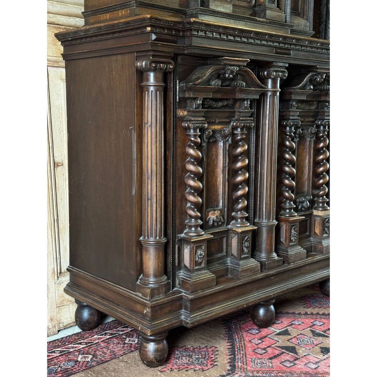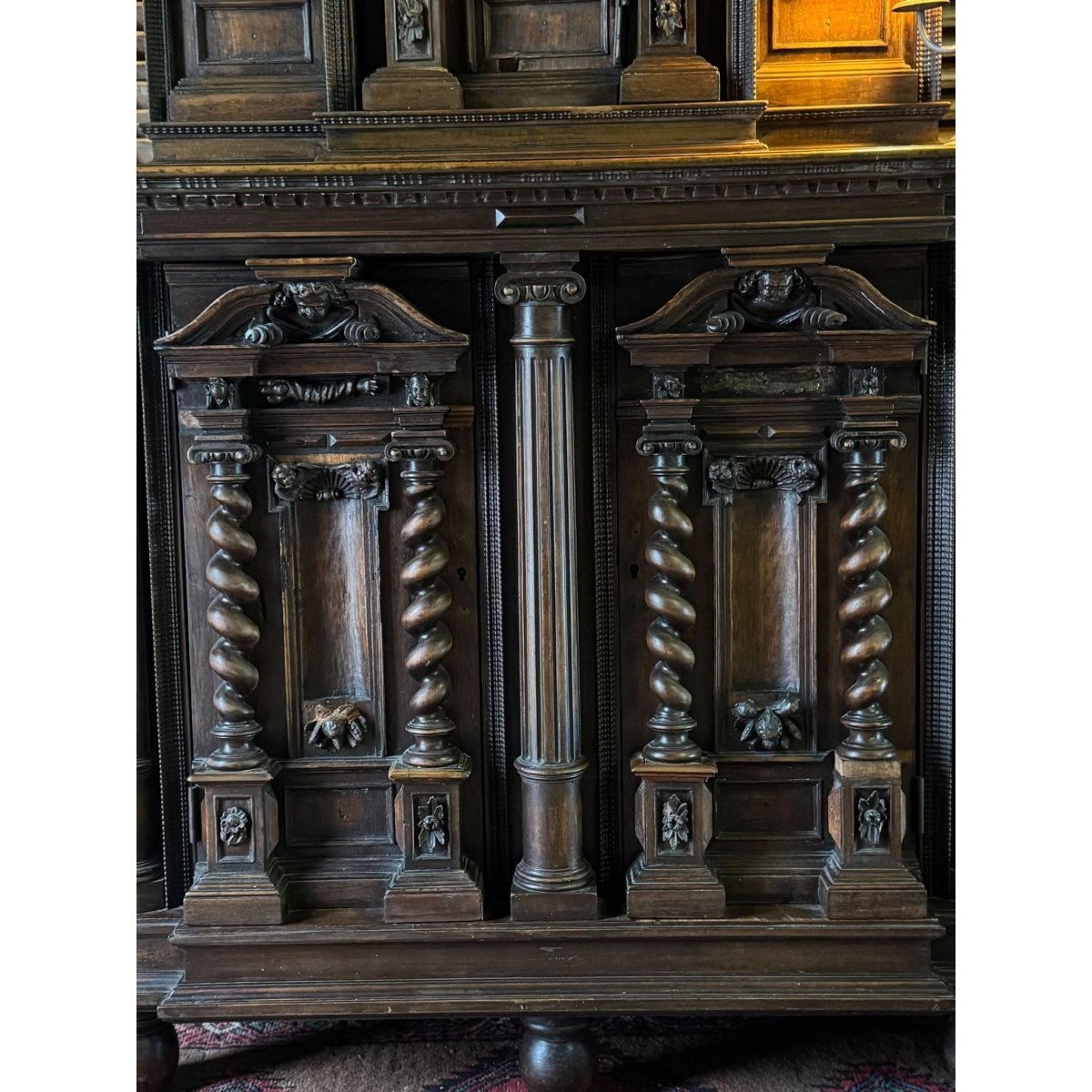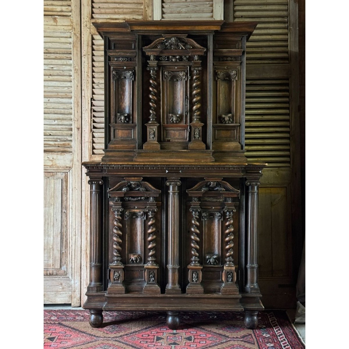 An imposing late 19th-century French buffet, masterfully carved in solid walnut. Rich with architectural detail, it features barley twist columns, cherub mounts, and classical pediments across both the upper and lower sections.