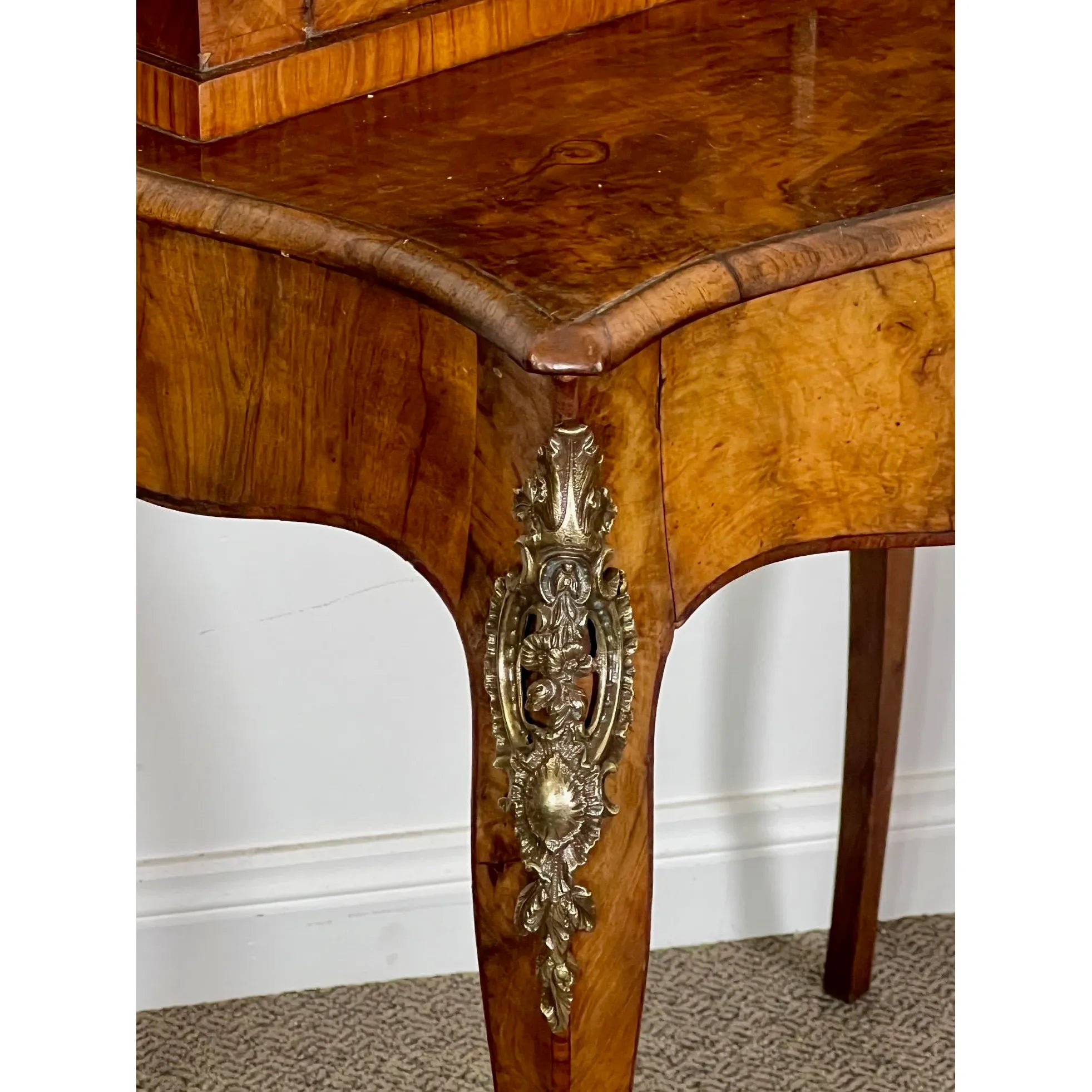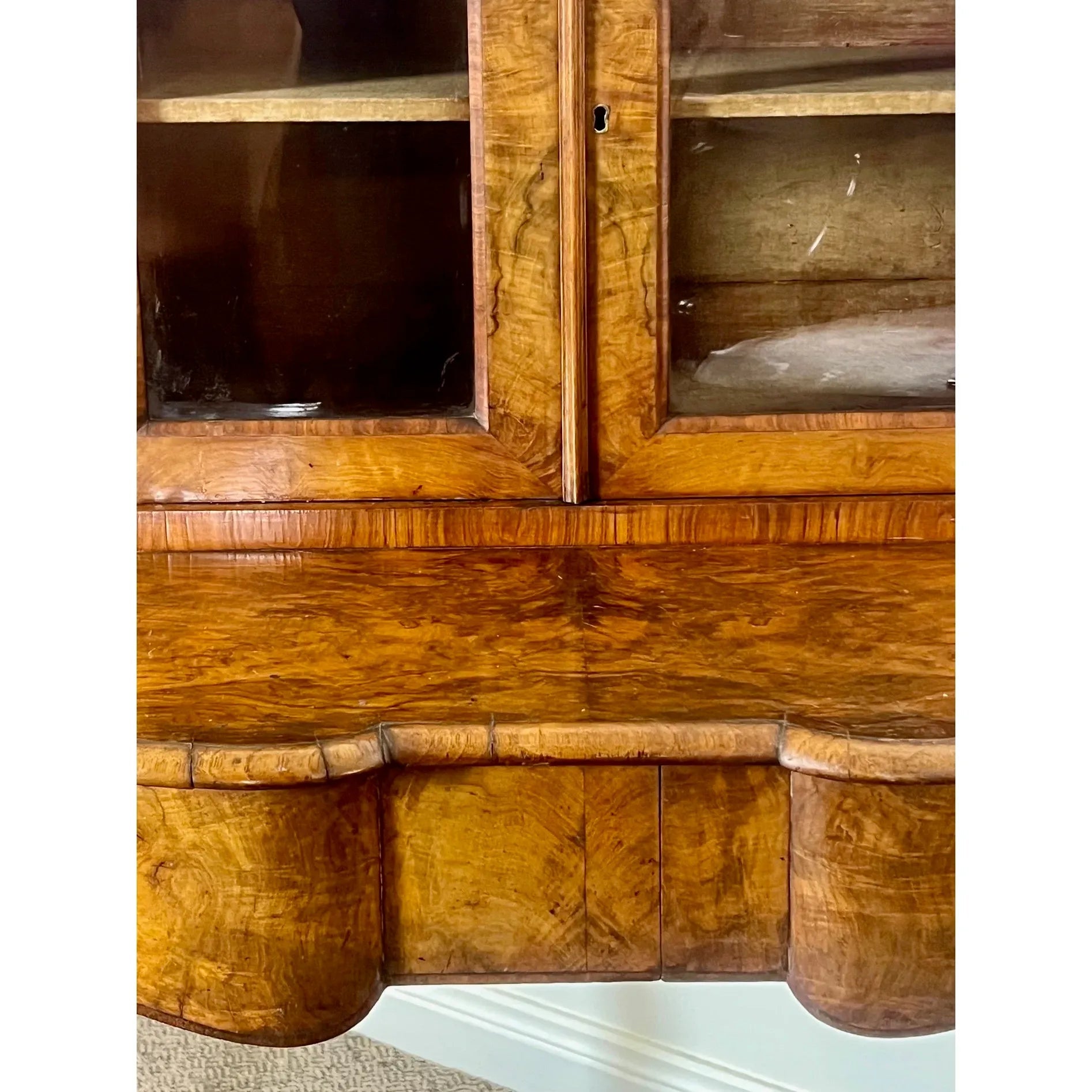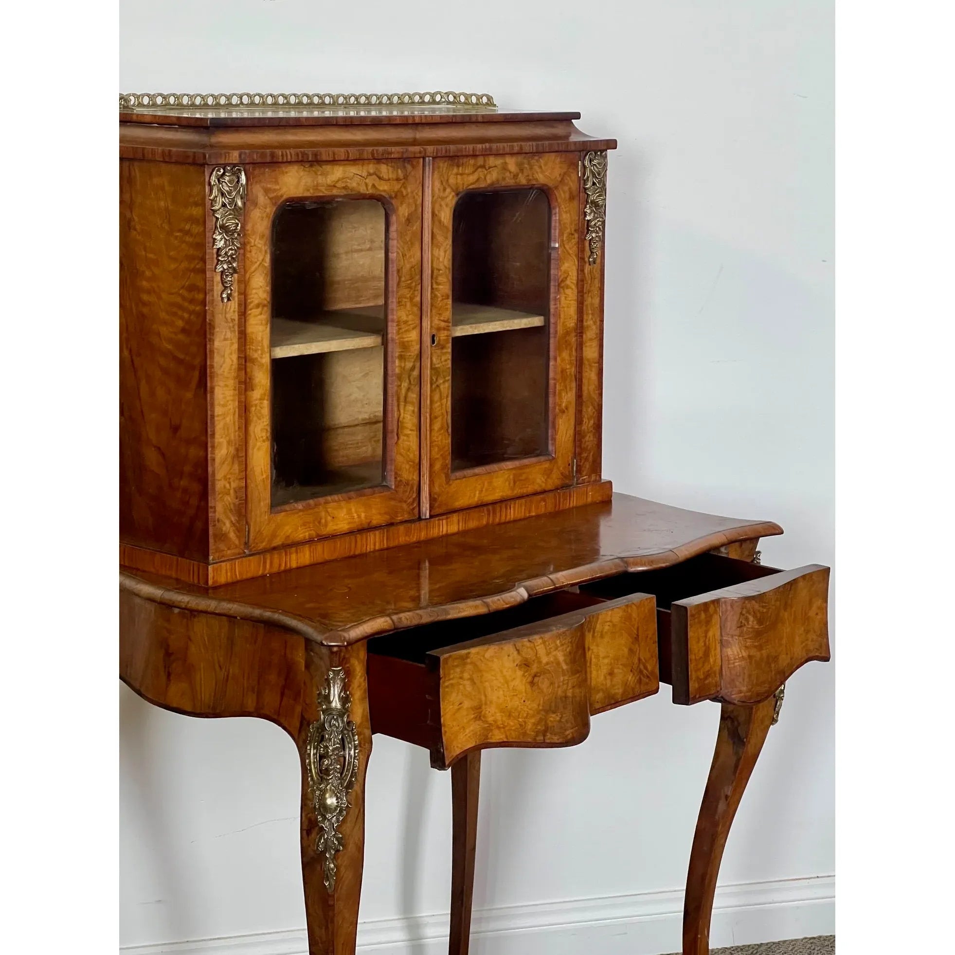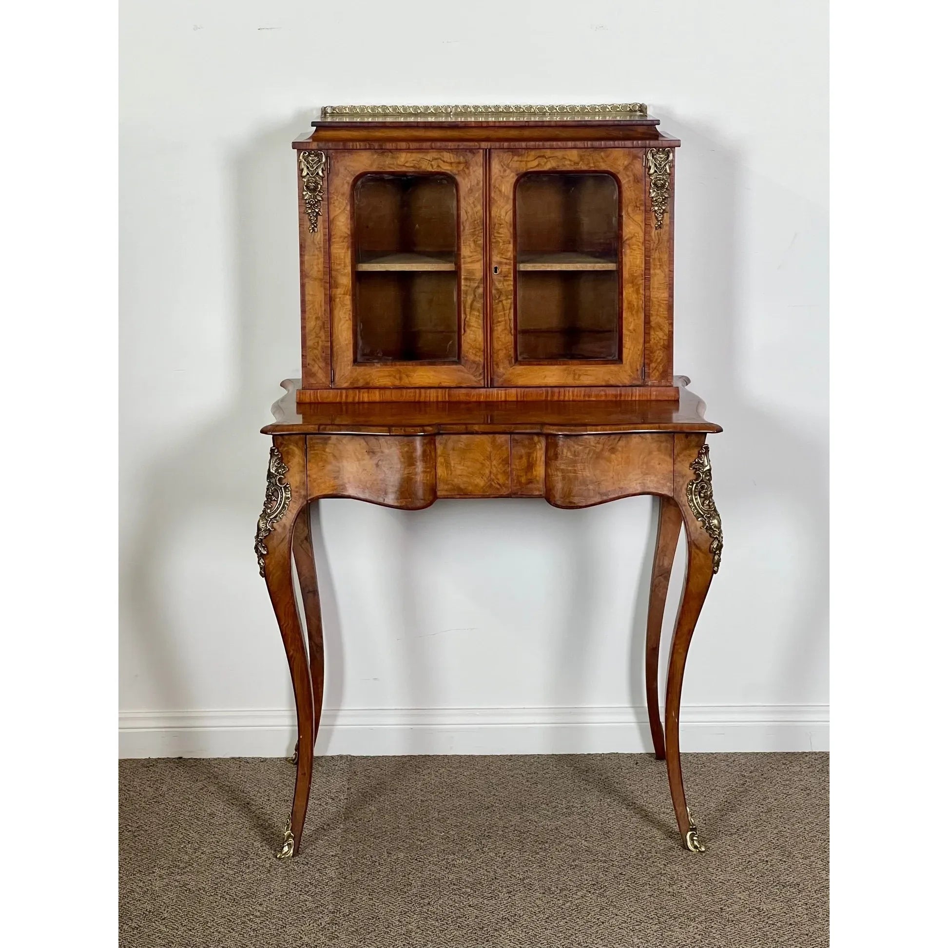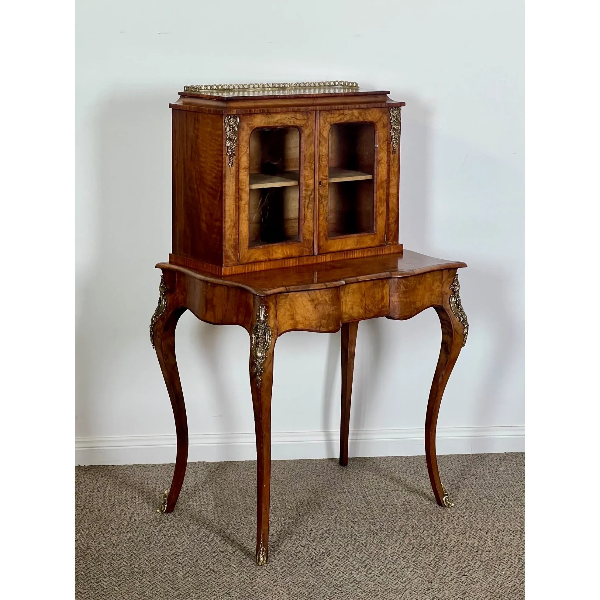 The style is transitional as the upper cabinet is more Louis XVI style with a rectangular cabinet with a concave curved cornice and a three sided brass gallery above. The cabinet has a pair of glazed display doors with a shelved cabinet behind. The lower table section is very much in the Louis XV manner with its serpentine form and tall elegant curved and tapered cabriole legs. The frieze section has a pair of side by side drawers.