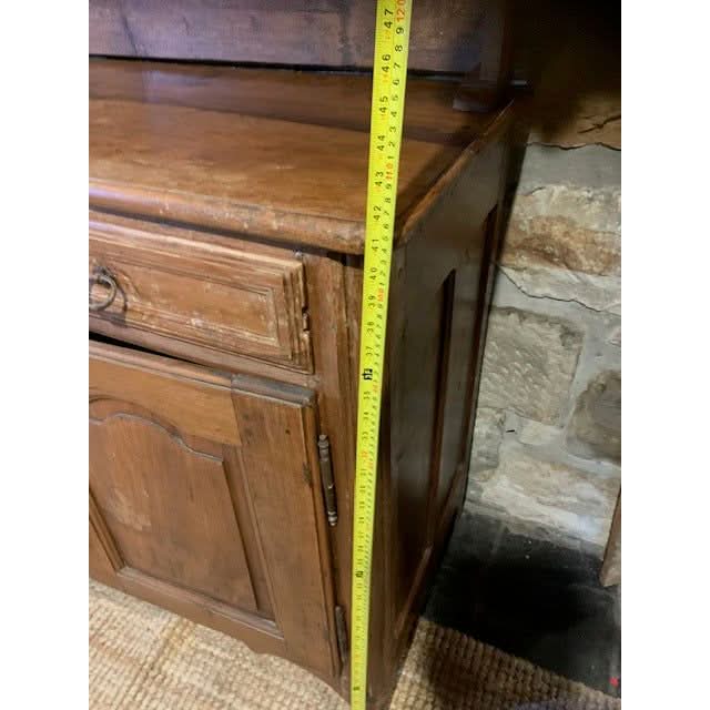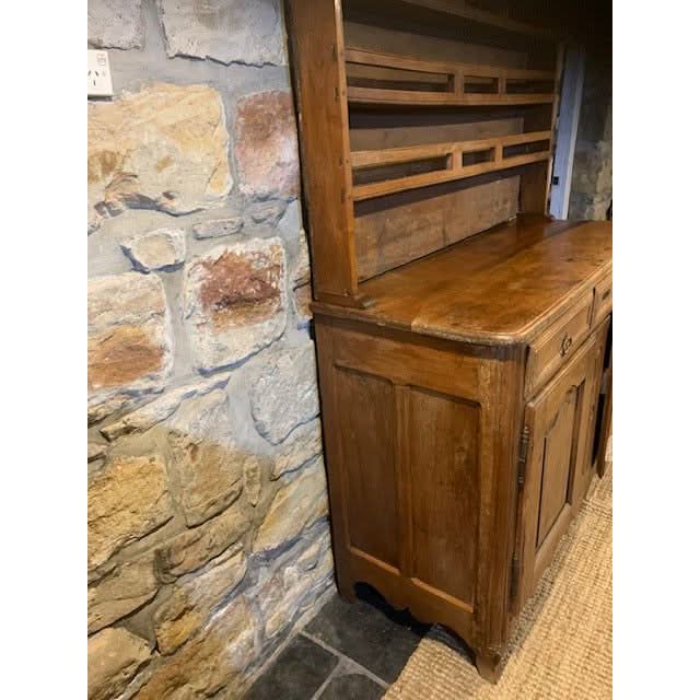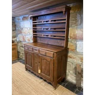 A nice example of early 19thC two-piece French provincial dresser in Cherrywood and oak with raised shelf back and canopy with front rails, the base is fitted with 3 drawers and two doors with some minor previous interior restoration. Good colour and patination Circa 1830.