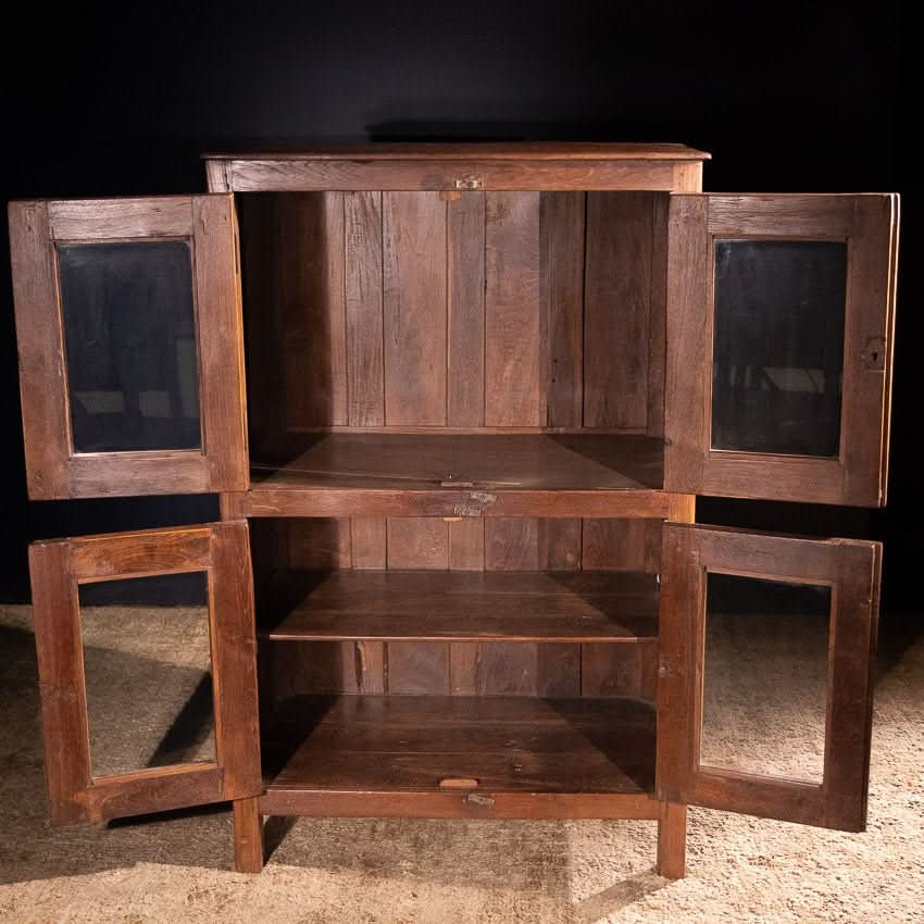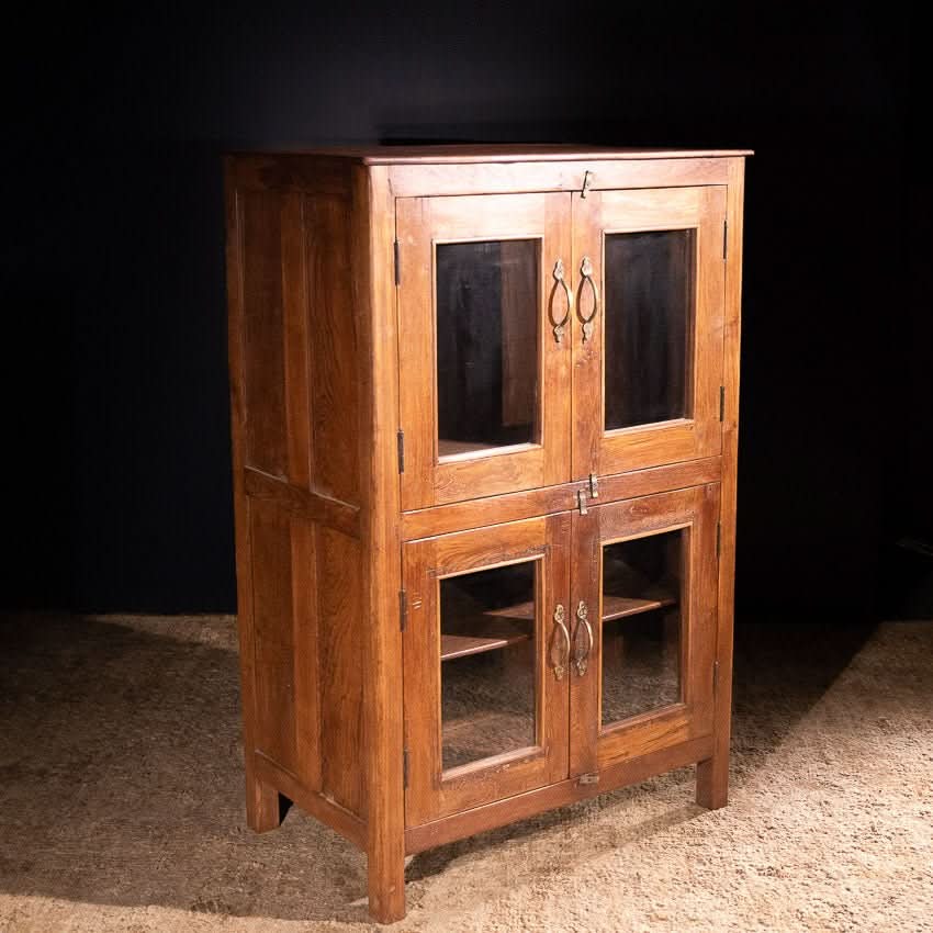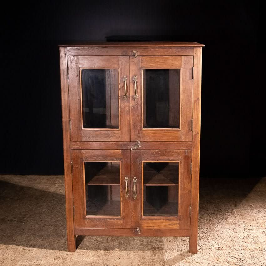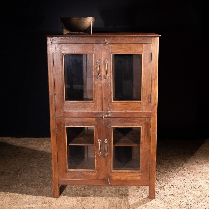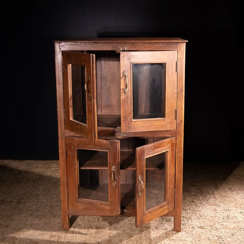 Charming vintage wooden cabinet with four glass fronted doors. Shelf in bottom compartment.