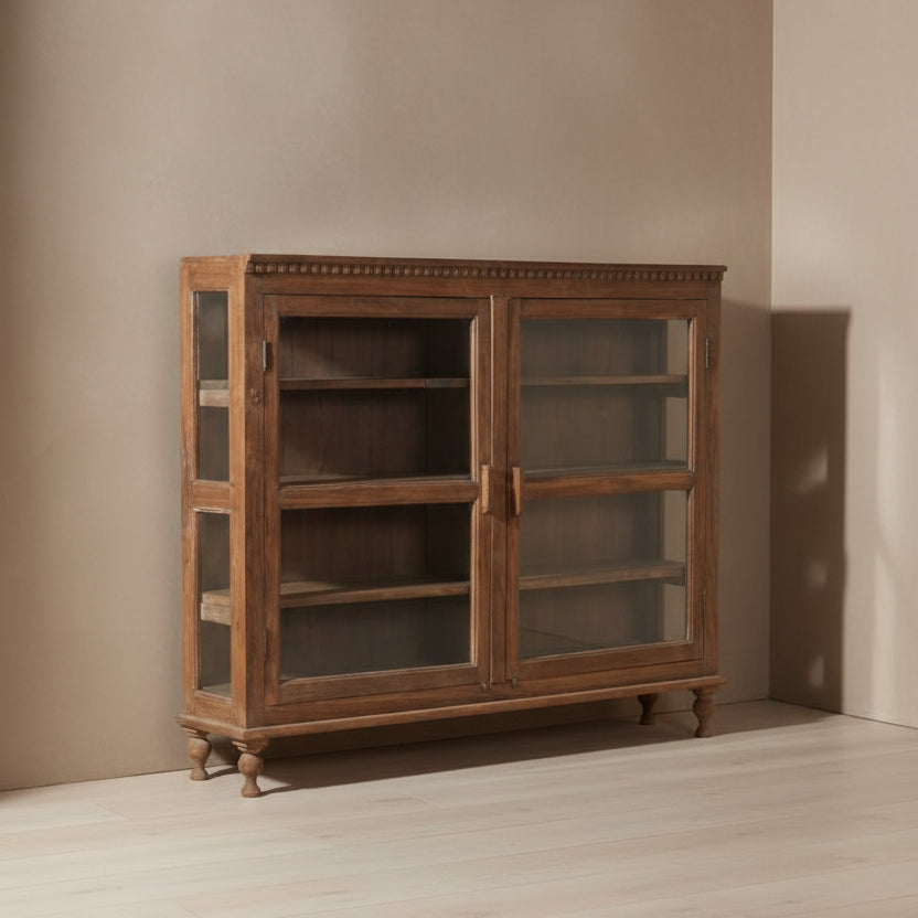 Handcrafted from solid teak, this Indian vintage cabinet combines display and storage in one striking piece. Mullioned glass doors with metal latches frame your finest objects—dinnerware, books, or curated collections—while deep shelving maximises capacity. The warm grain, softened edges, and authentic patina reveal decades of craftsmanship and honest materials. A functional heirloom that anchors any room.