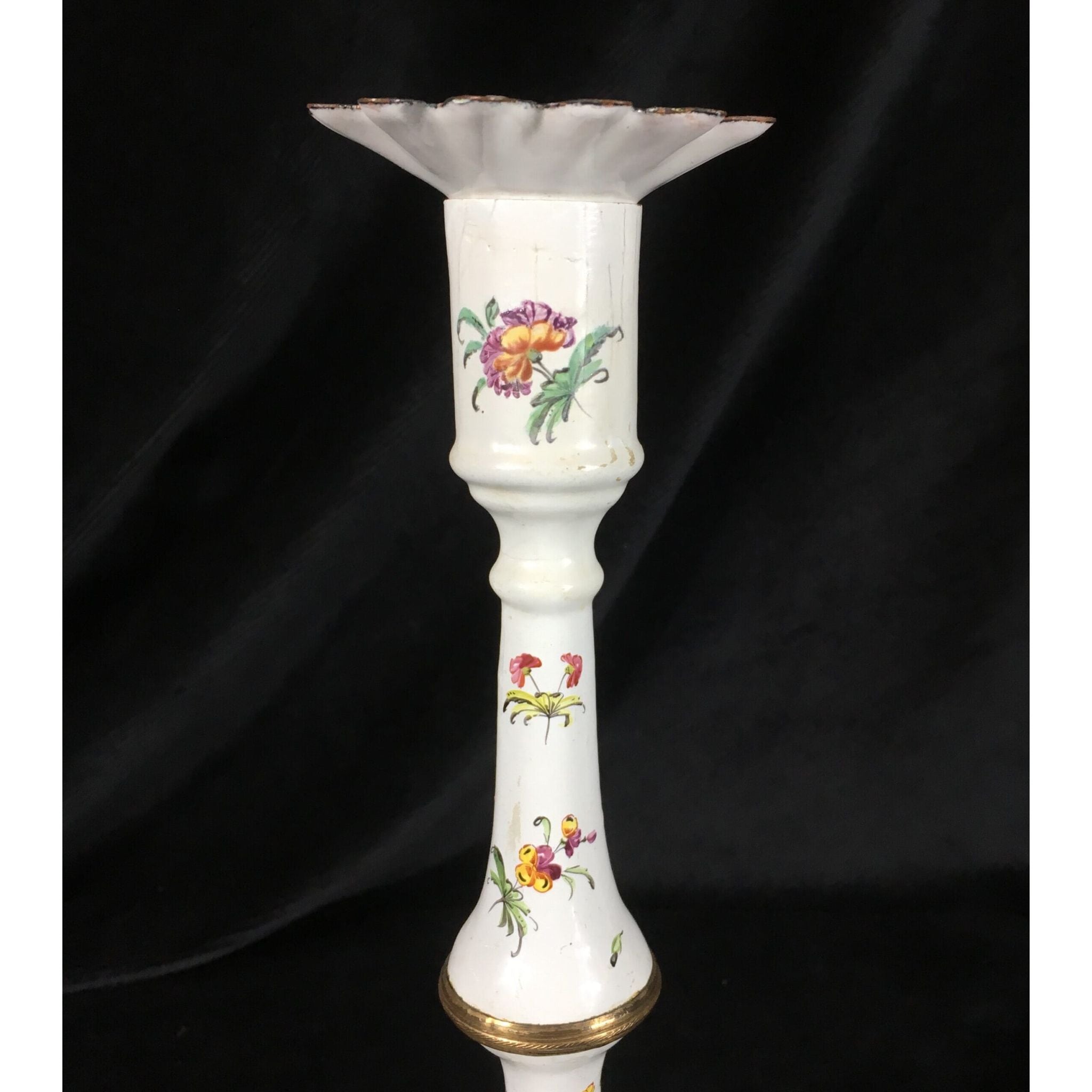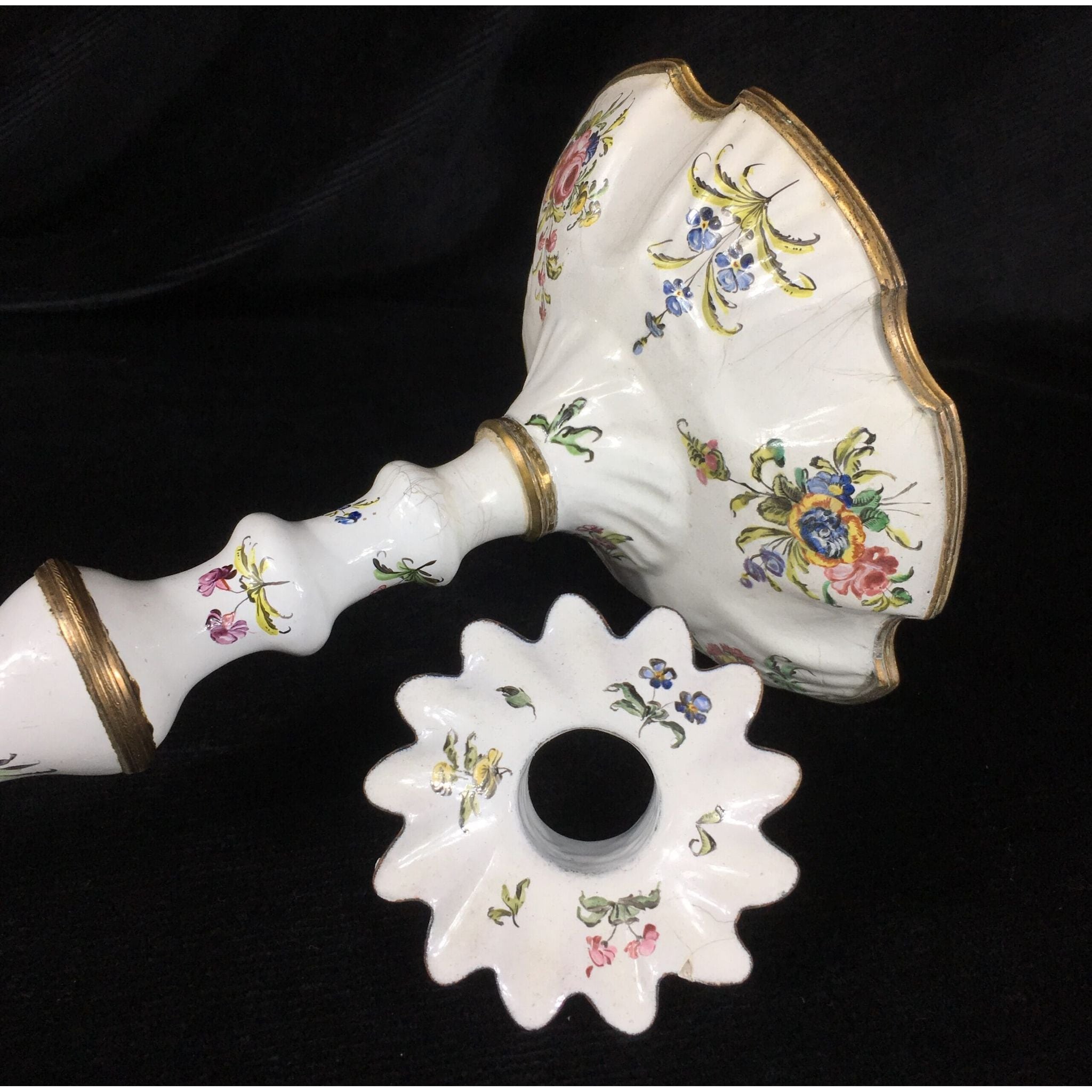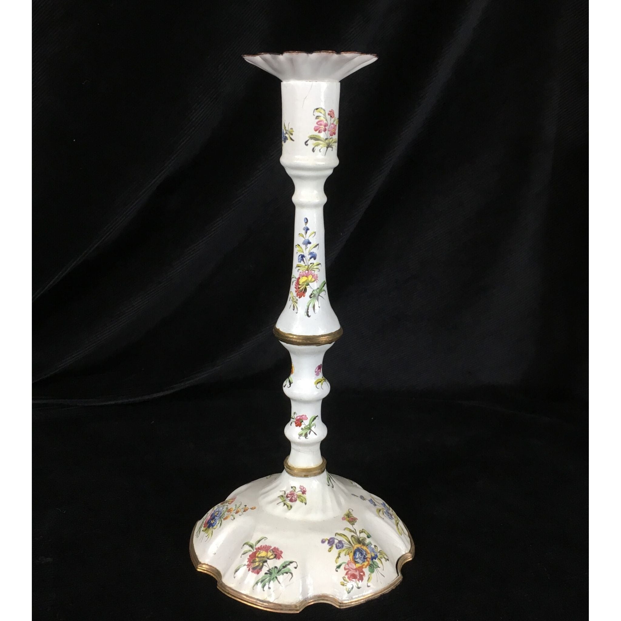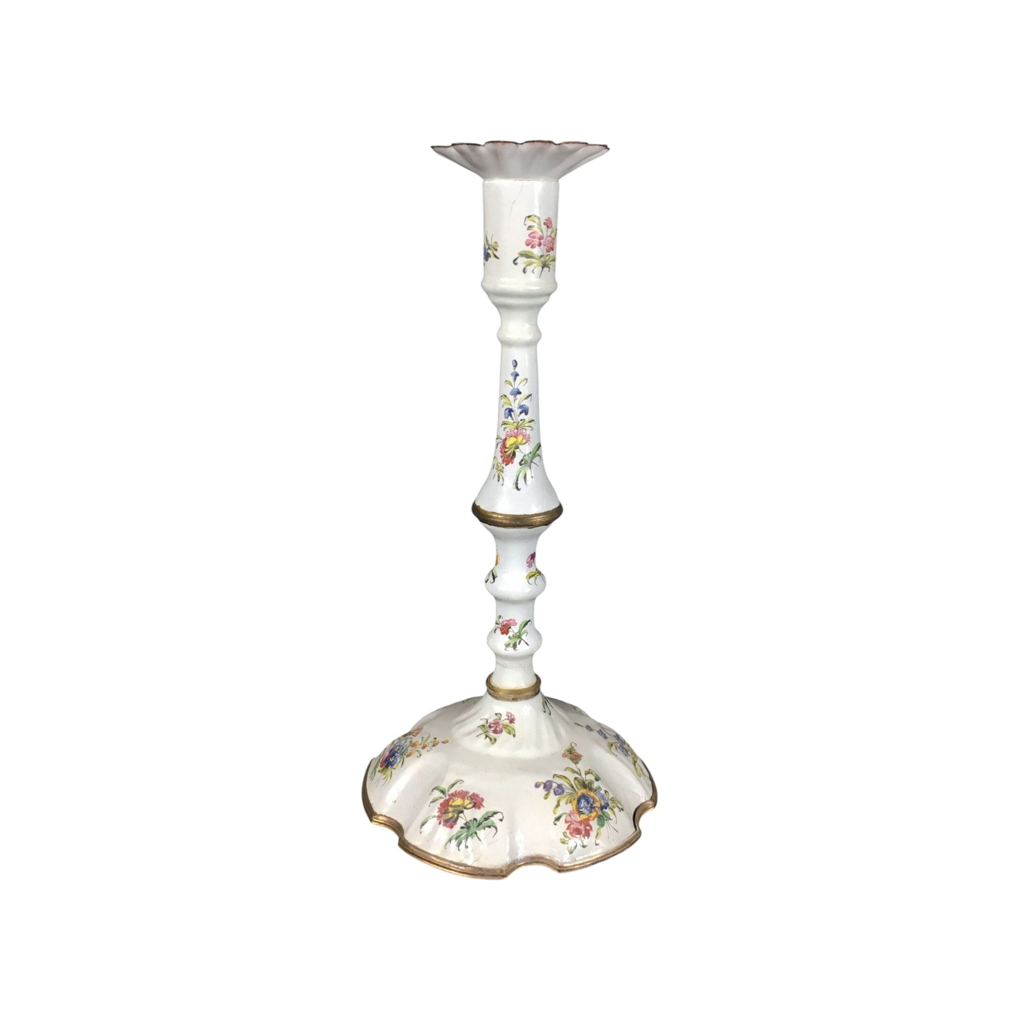 English enamel candle stick & sconce, the silver form with shaped base and baluster stem, with ormalou joints to the stem and a rim to the base, well painted with flower sprigs, the original sconce of scalloped form with further flower sprigs. Circa 1770