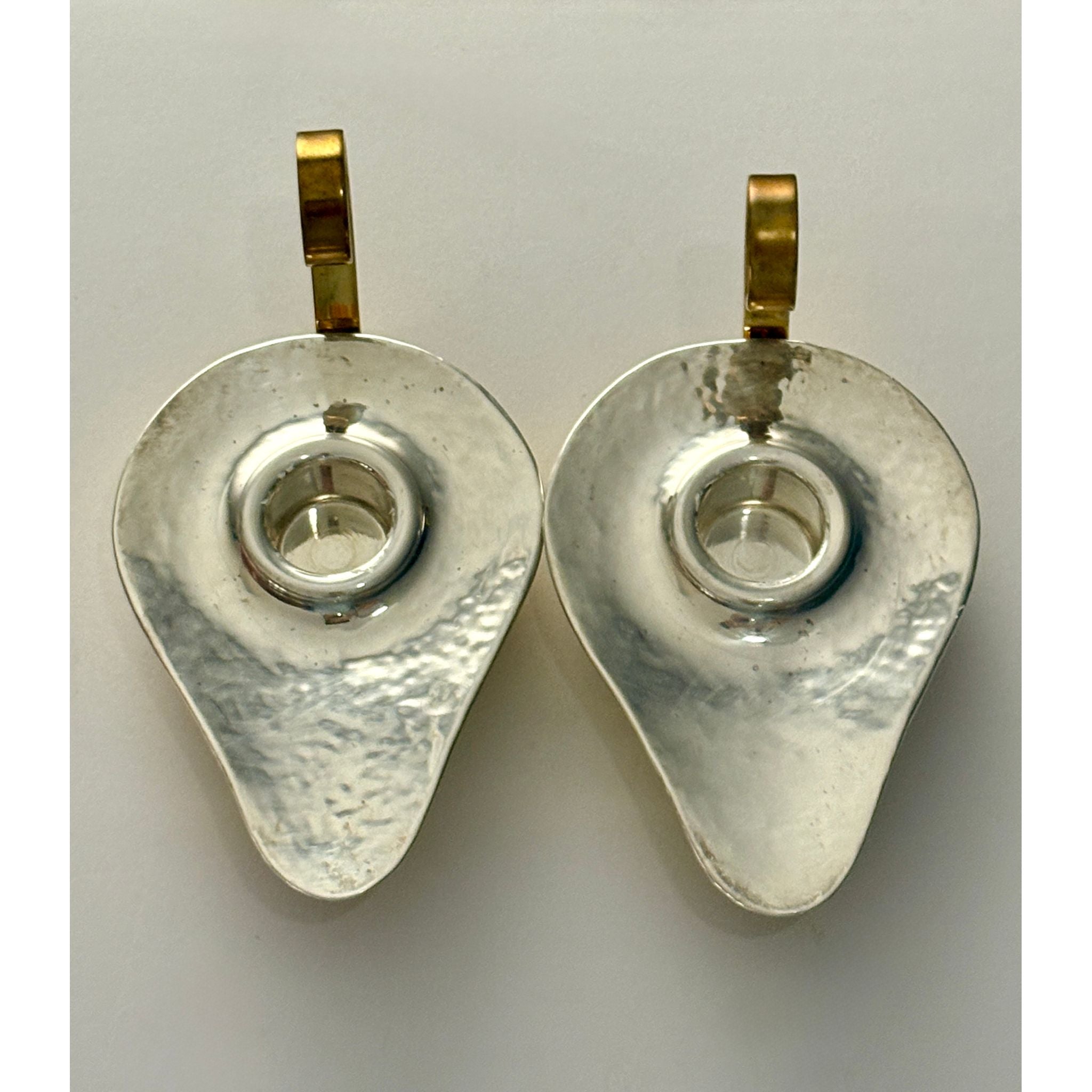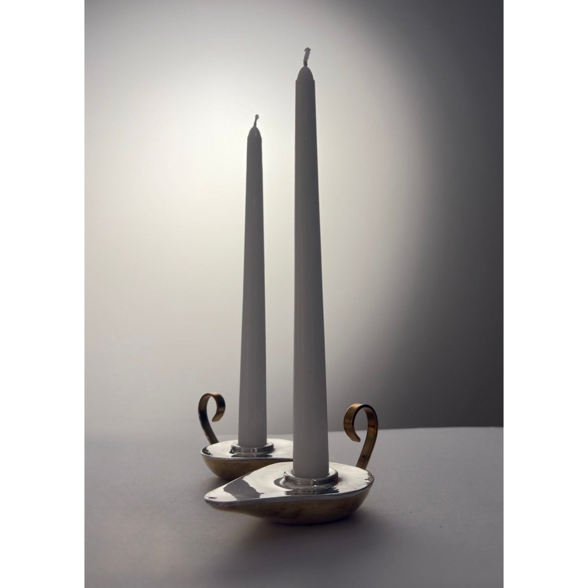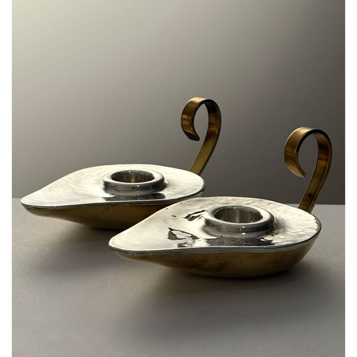 By renowned Greek designer and goldsmith Ilias Lalaounis in his signature style reflecting ancient motifs and style. Each hand worked candlestick is in the form of an ancient oil lamp featuring a planished silver top that subtly reflects light. The silver is wrapped over a warm gold/brass body with scrolling handle, providing both functional balance and visual contrast to the cool silver. Presented in its original Lalaounis presentation box.