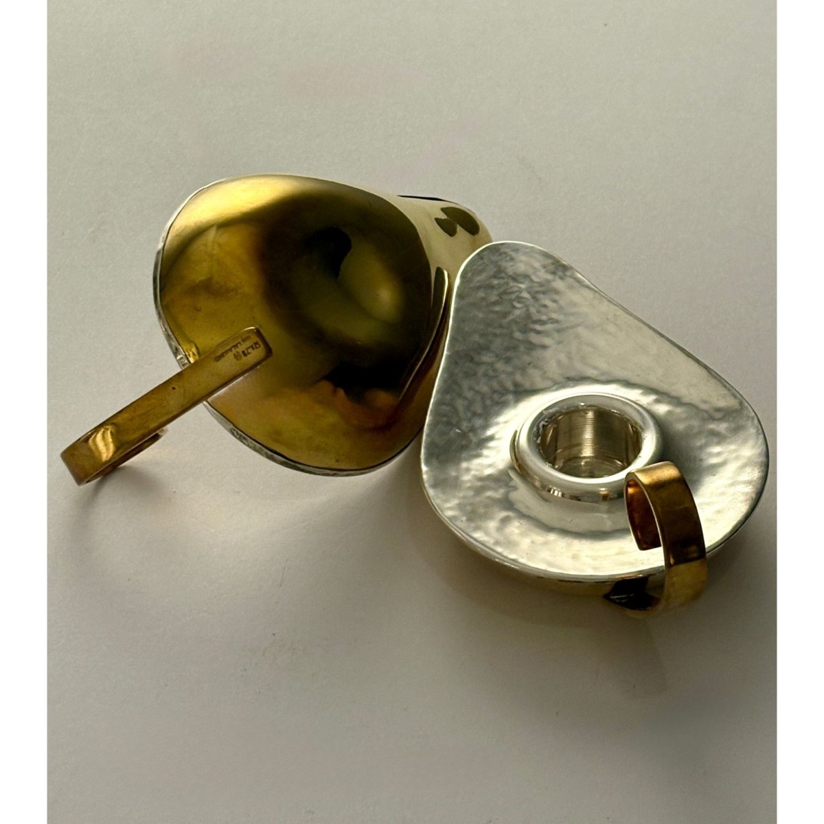 Good vintage condition with light surface wear and gentle patination consistent with age and use. The silver retains its sculptural hammering, and the brass shows warm tonal variation. Original Lalaounis presentation box included, with expected handling wear.