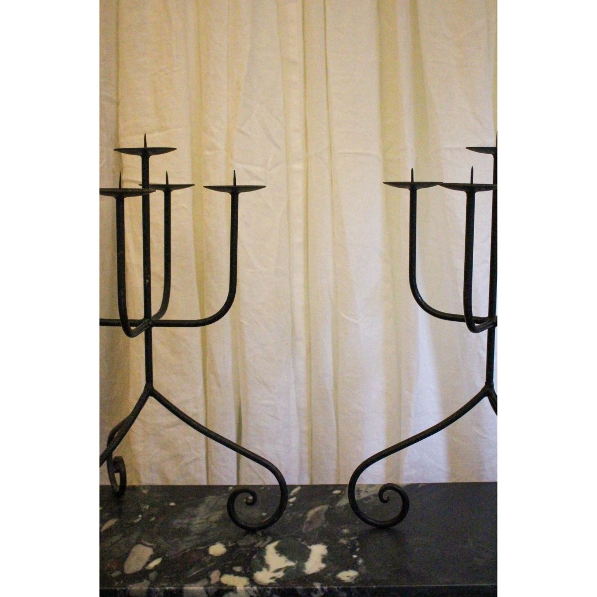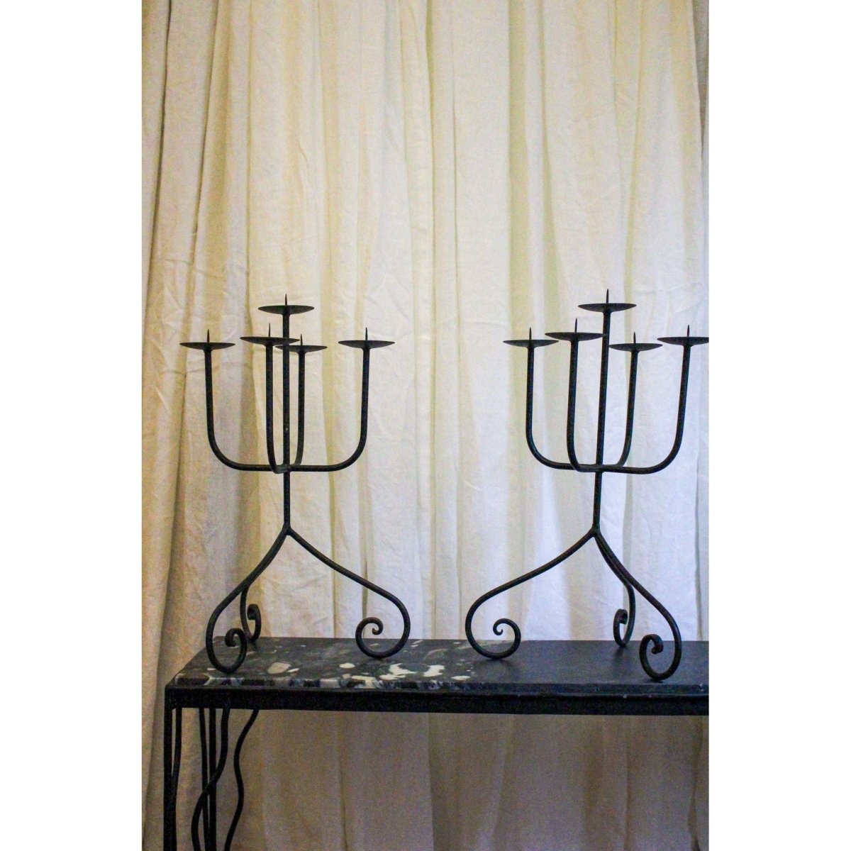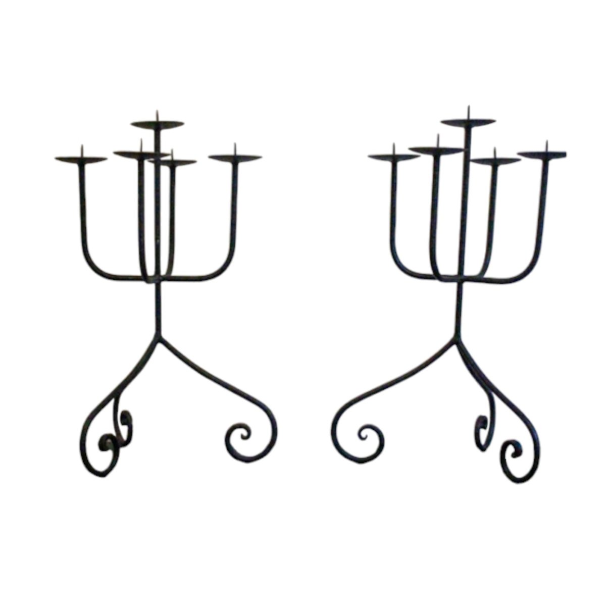 Elegant pair of vintage wrought iron candelabra with five candle arms each, standing approximately 50cm high. Beautiful sculptural form with scroll feet and a matte black finish — perfect as statement decor for a console, dining table, or mantel.