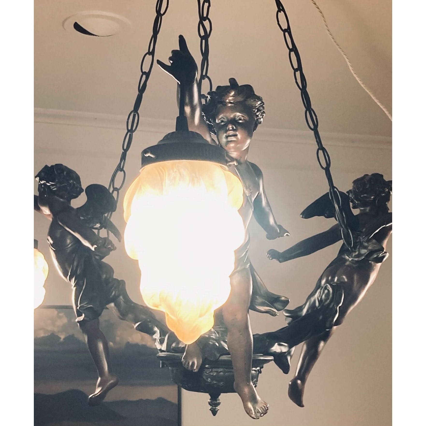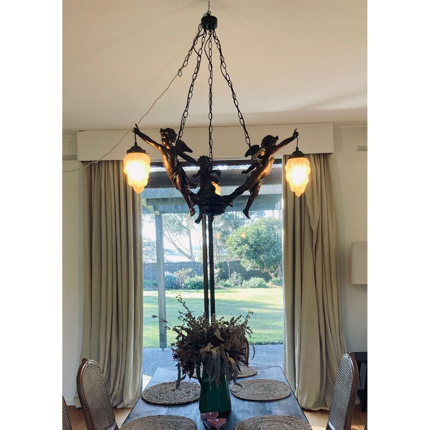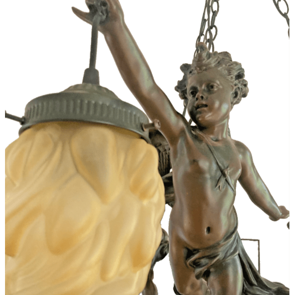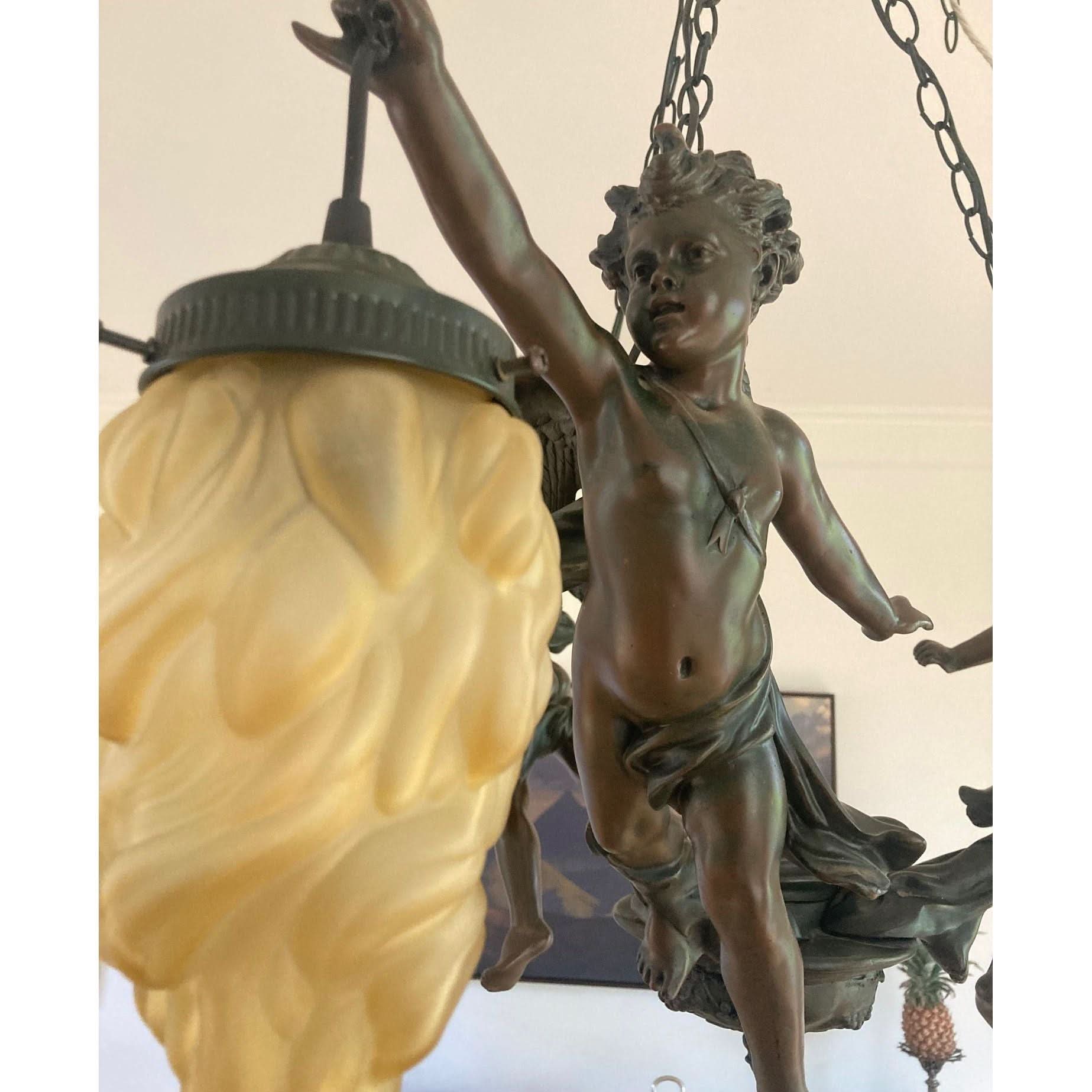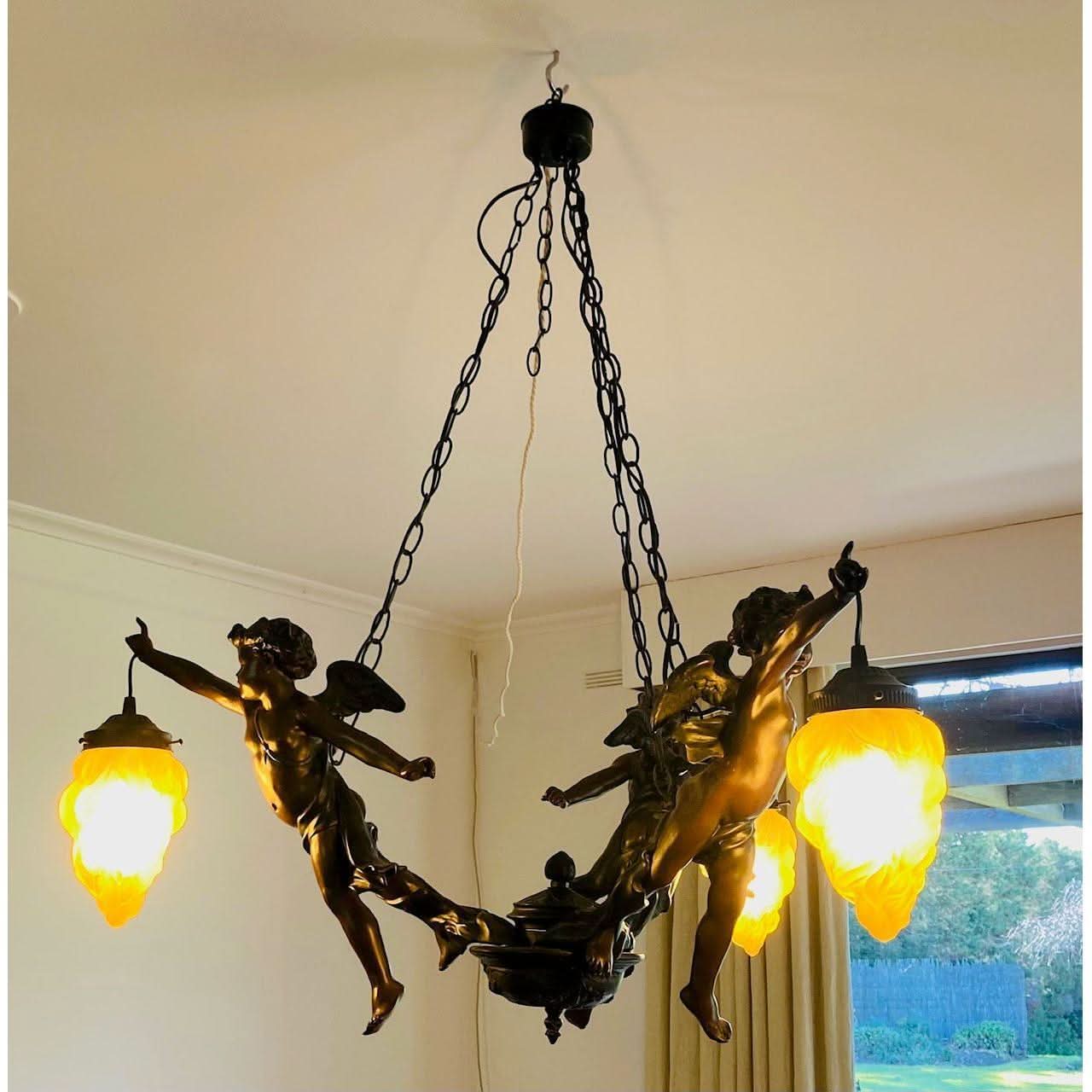 Original Art Nouveau chandelier from Art de France (stamped) circa 1890-1910, in bronze resin with some restorations. Consisting of three winged and out-stretched cupids holding individual amber glass lampshades. The lamp has been fully rewired, with a new antique style 7m twisted cream fabric cable with 3-pin plug, allowing it to be hung and then plugged into any wall socket. Comes with current Australian electrical testing certificate.