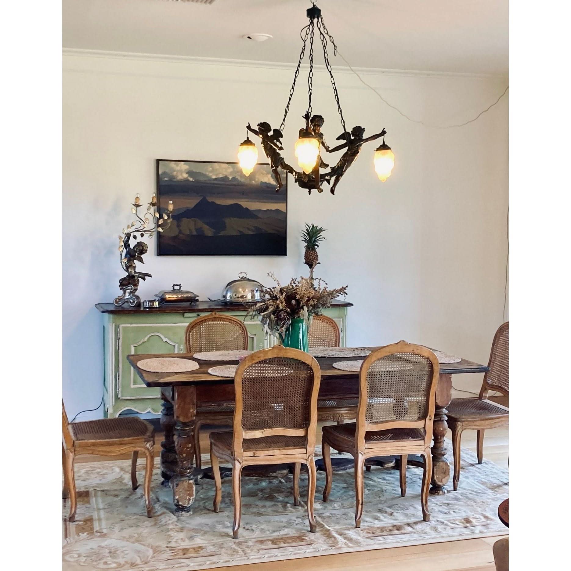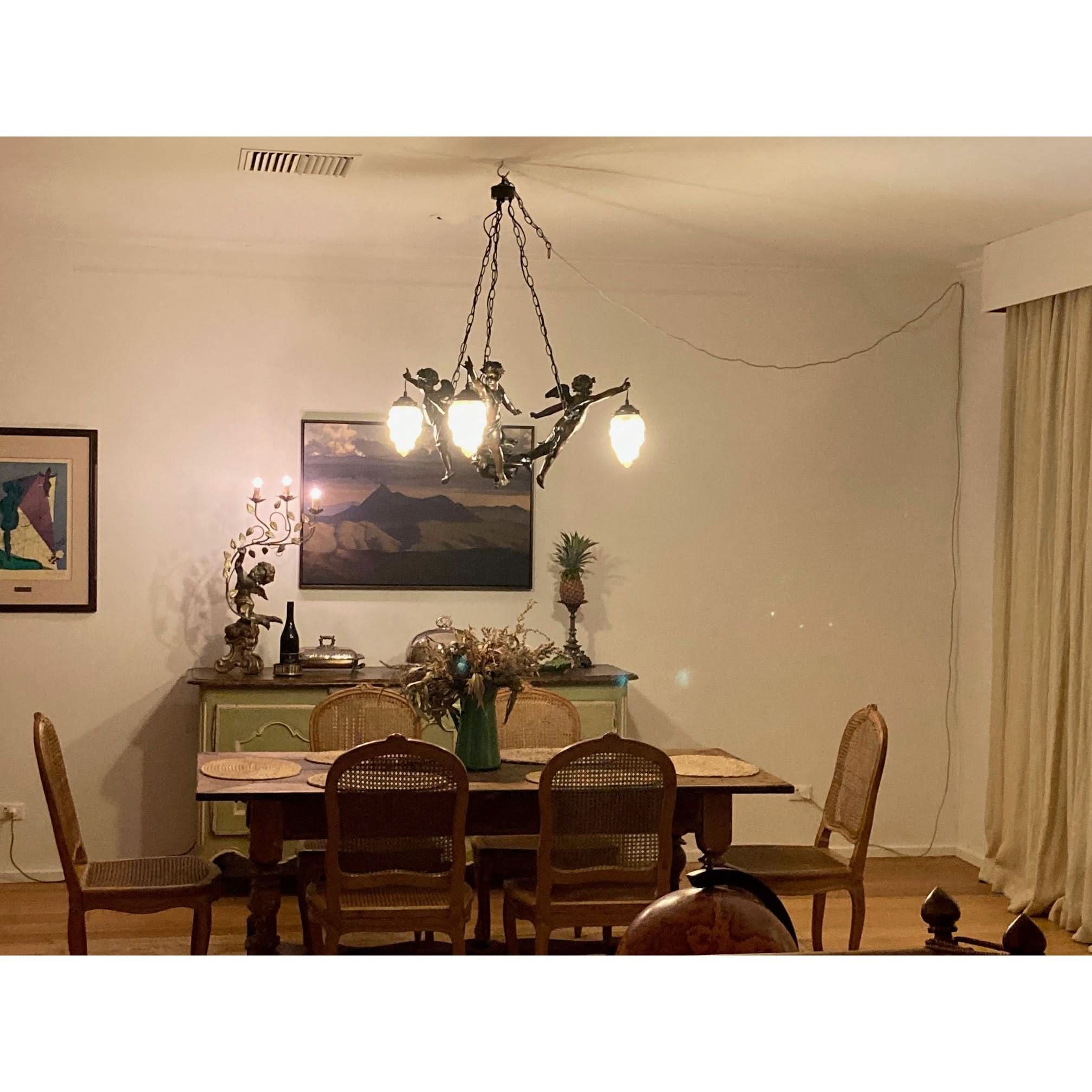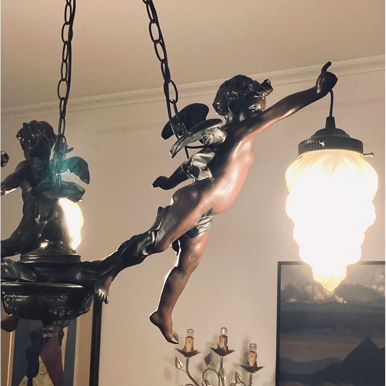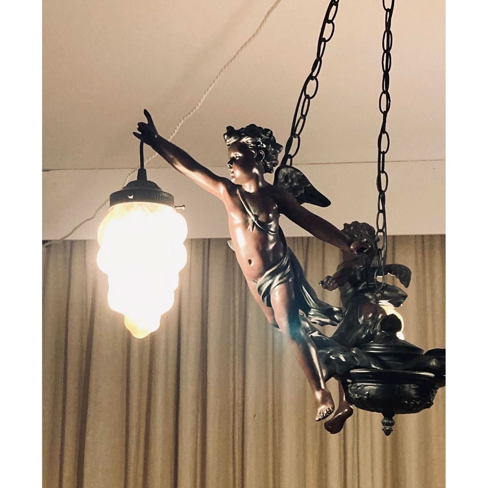 Original Art Nouveau chandelier from Art de France (stamped) circa 1890-1910, in bronze resin with some restorations. Consisting of three winged and out-stretched cupids holding individual amber glass lampshades. The lamp has been fully rewired, with a new antique style 7m twisted cream fabric cable with 3-pin plug, allowing it to be hung and then plugged into any wall socket. Comes with current Australian electrical testing certificate.