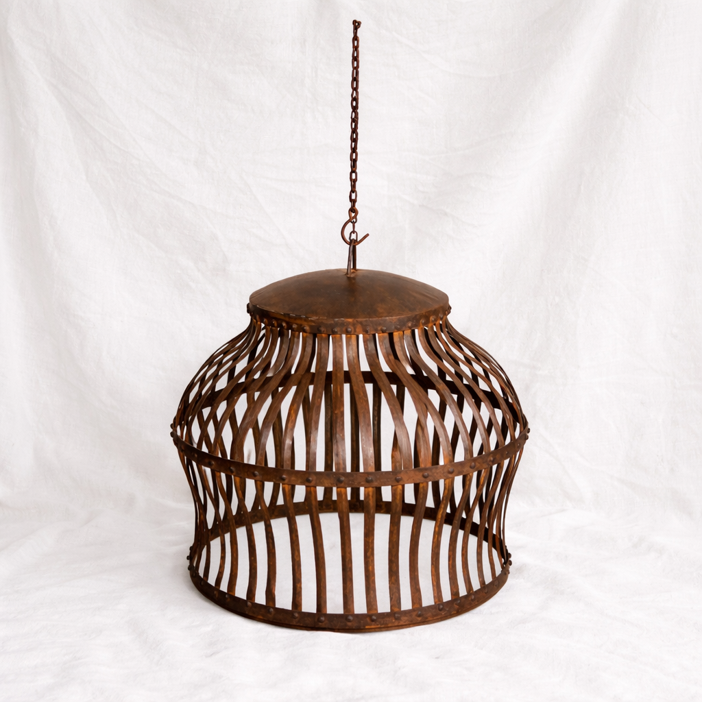 This vintage Indian metal pendant light is a striking example of traditional iron craftsmanship. Hand-forged with curved iron slats and riveted detailing, its cage-like silhouette creates dramatic shadow play when illuminated.