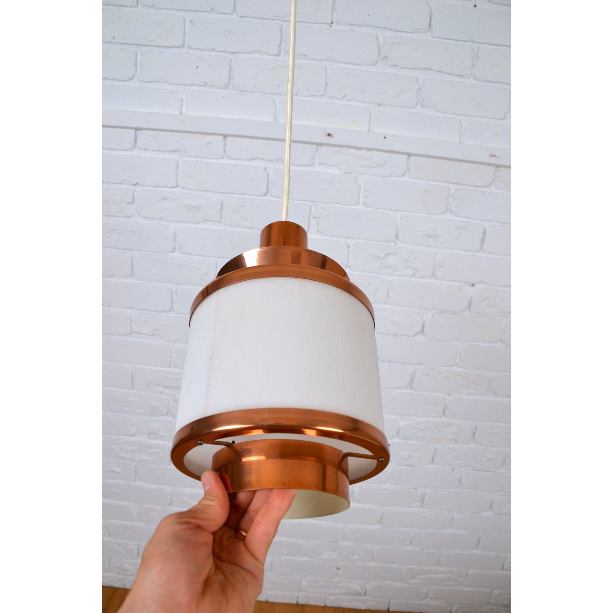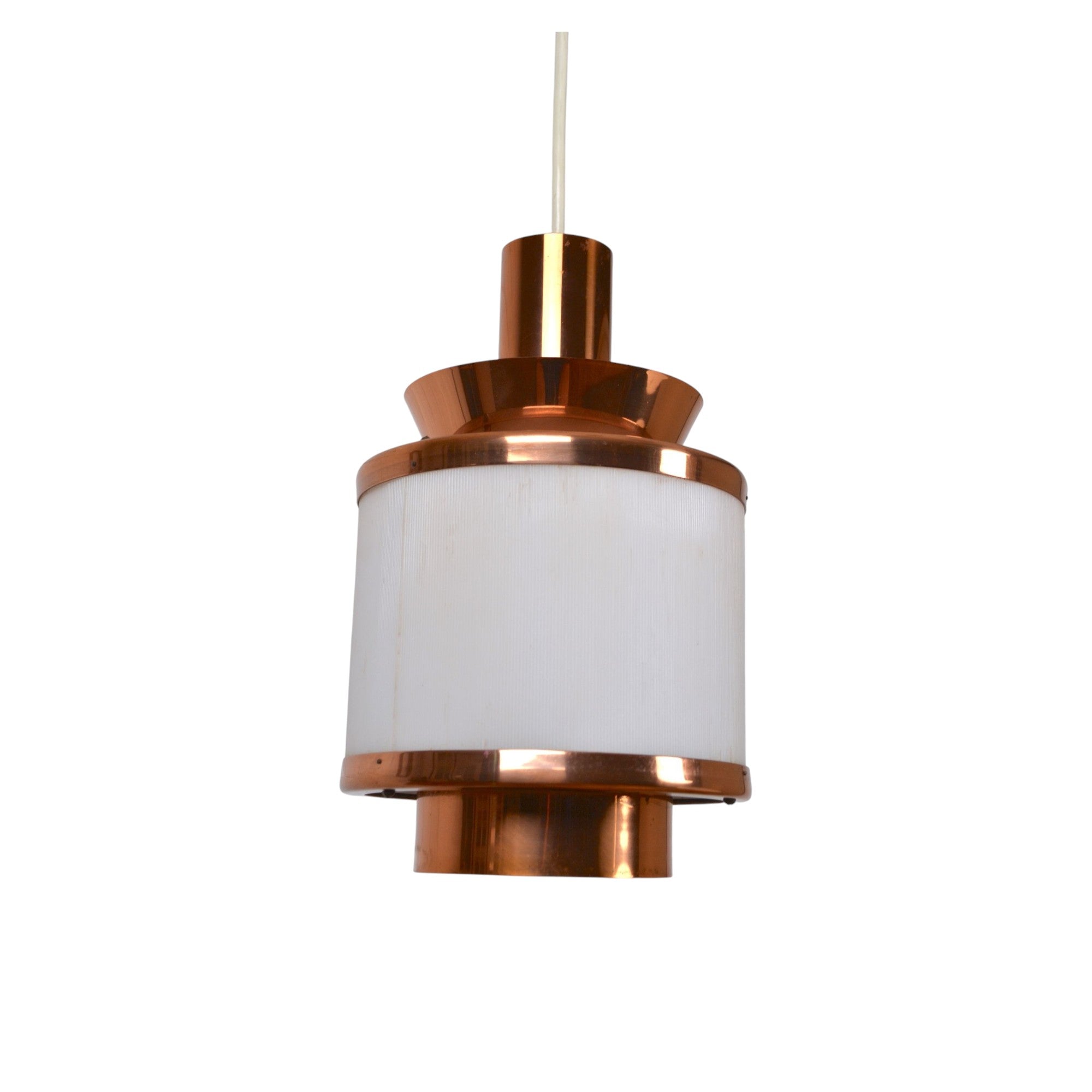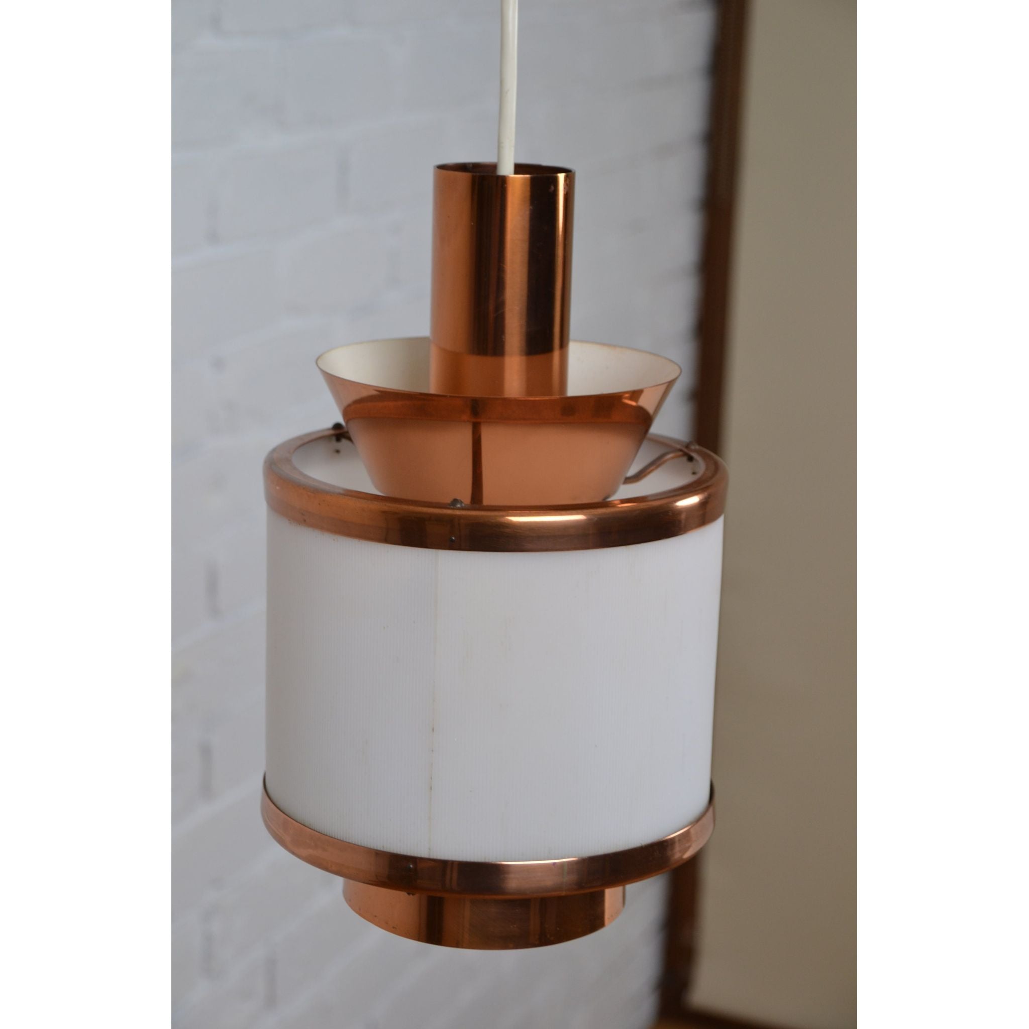 Vintage medium layered pendant light by Teknika, Denmark. Cooper construction with Plexiglass shade.