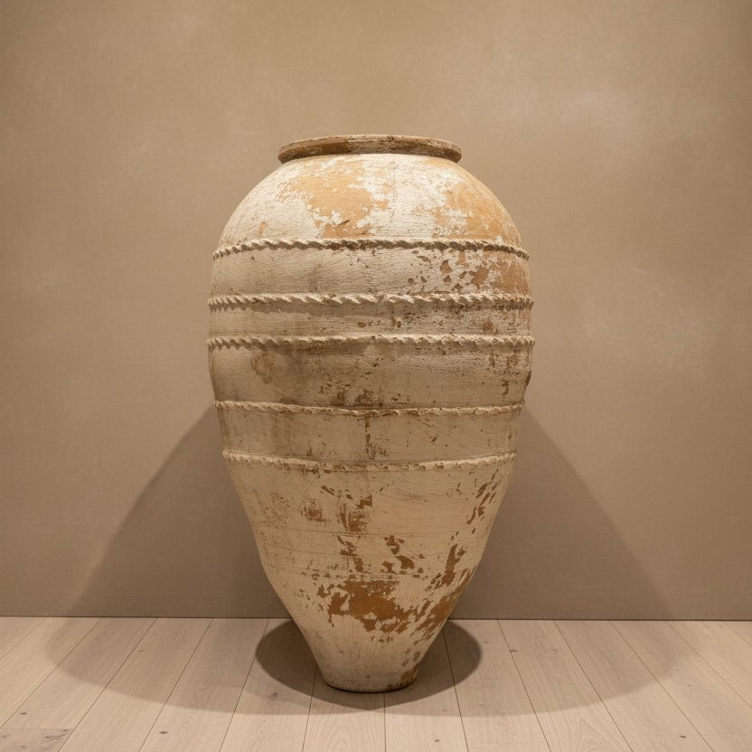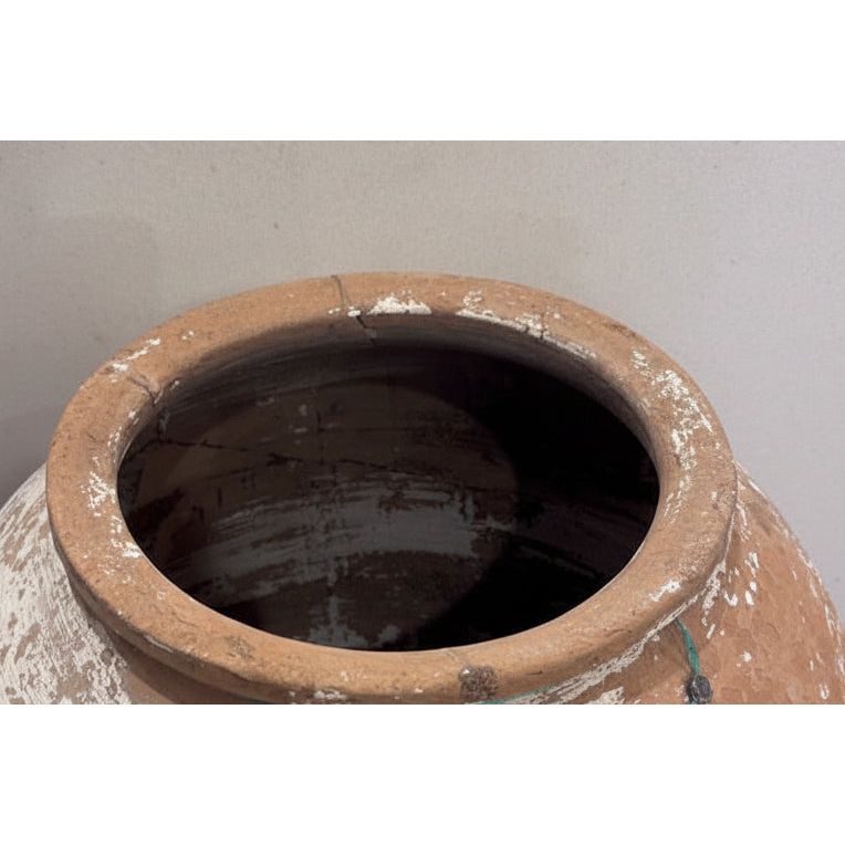 This original, solid and heavy vessel is exactly as shown. Originally used to store olive oil, it’s a one-of-a-kind piece that has weathered uniquely over time. Gathered layers of sediment paint and patina make it a stunning display piece.