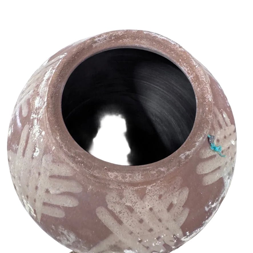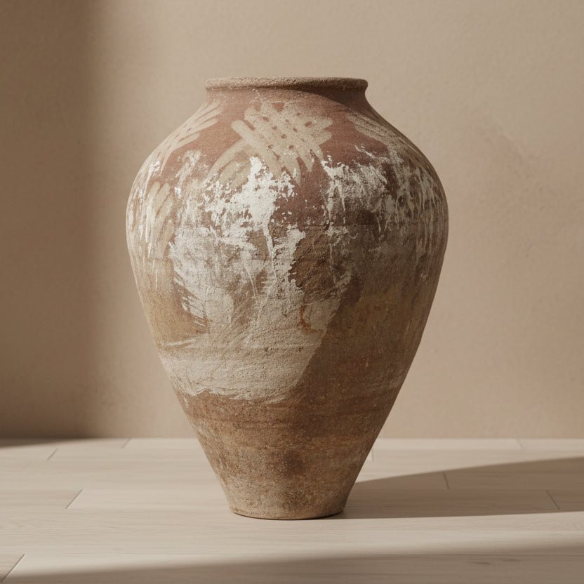 This original, solid and heavy vessel is exactly as shown. Originally used to store olive oil, it’s a one-of-a-kind piece that has weathered uniquely over time. Gathered layers of sediment paint and patina make it a stunning display piece.