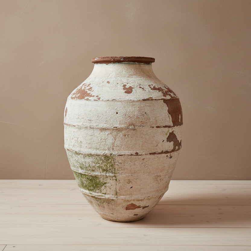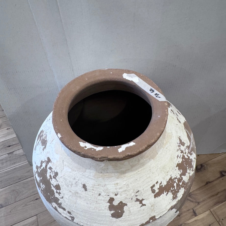 This original, solid and heavy vessel is exactly as shown. Originally used to store olive oil, it’s a one-of-a-kind piece that has weathered uniquely over time. Gathered layers of sediment paint and patina make it a stunning display piece.