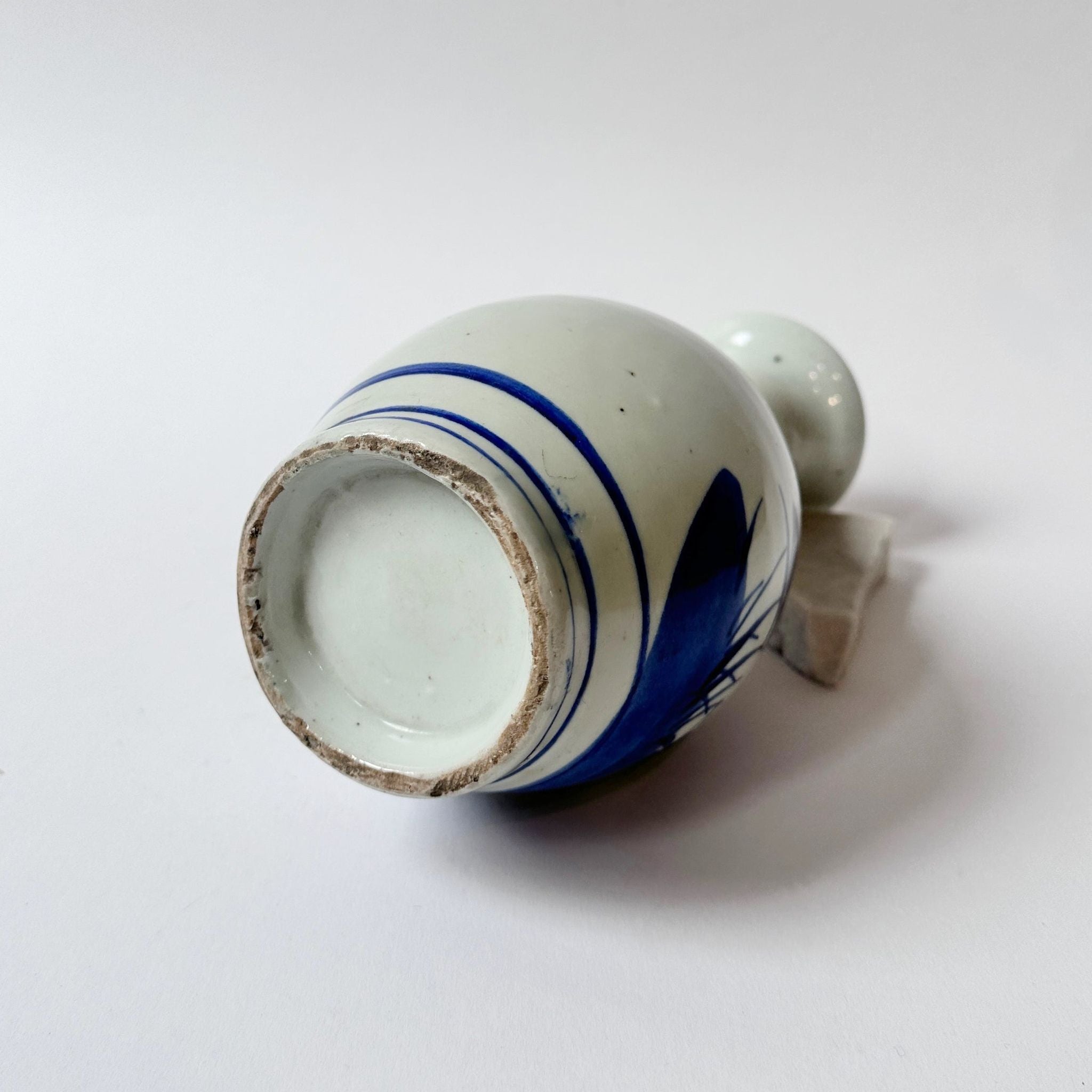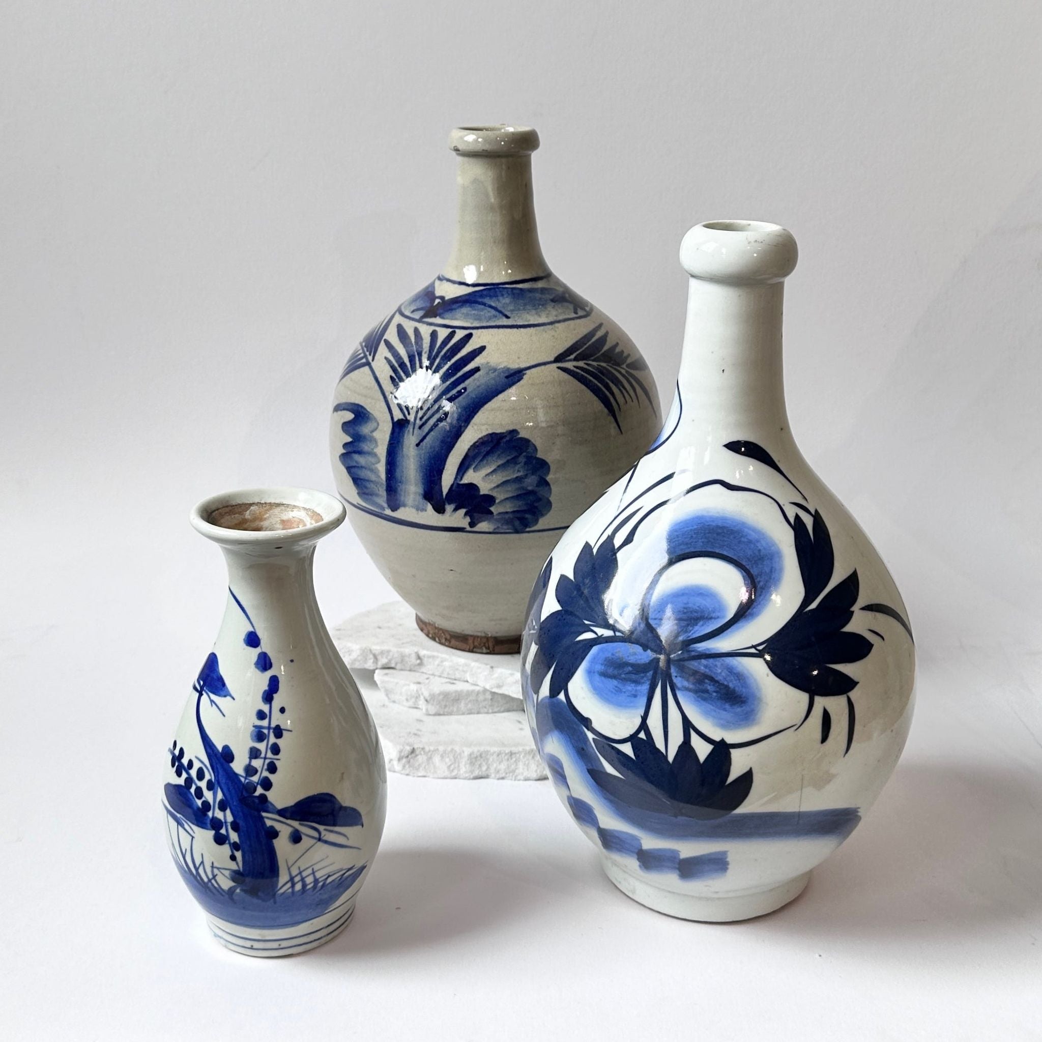 A beautiful antique Japanese blue & white tokkuri—traditionally used for serving sake—featuring a striking hand-painted motif in rich underglaze cobalt on a soft white ground. The elegant bottle form and painterly brushwork make it a special decorative piece, whether styled on open shelving, a bar cart, or as a small vase for a single stem.