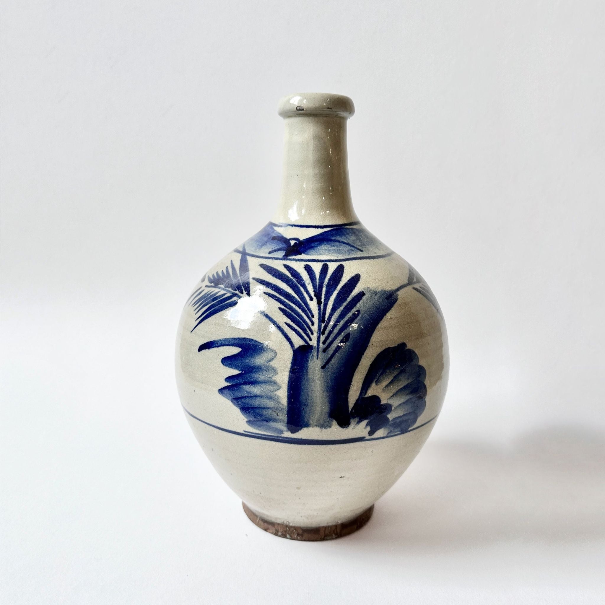 A standout, large antique Japanese blue & white tokkuri—traditionally used for serving sake—featuring a bold, painterly design in rich underglaze cobalt on a softly aged white ground. The sweeping brushstrokes and strong silhouette give it real presence, making it an effortless statement piece for a console, sideboard or open shelf.