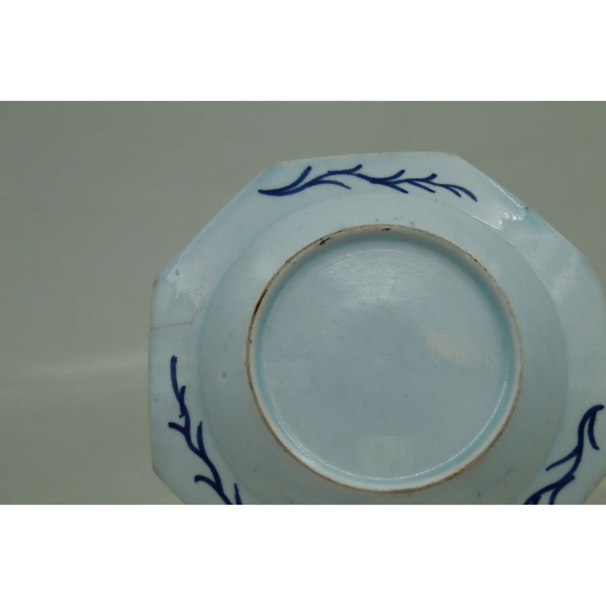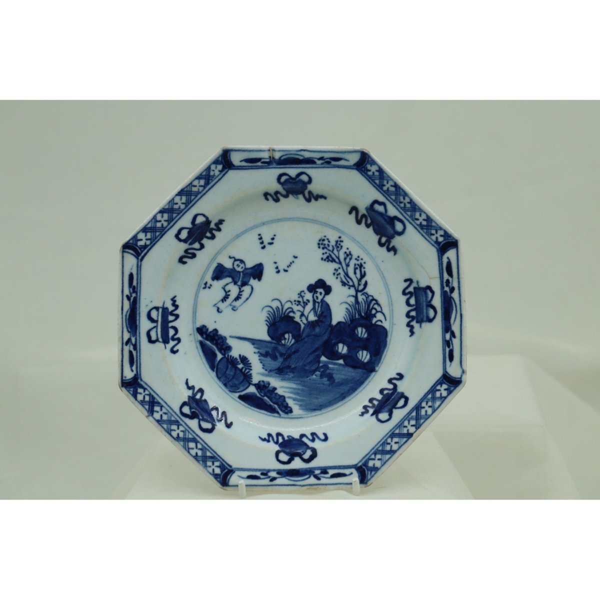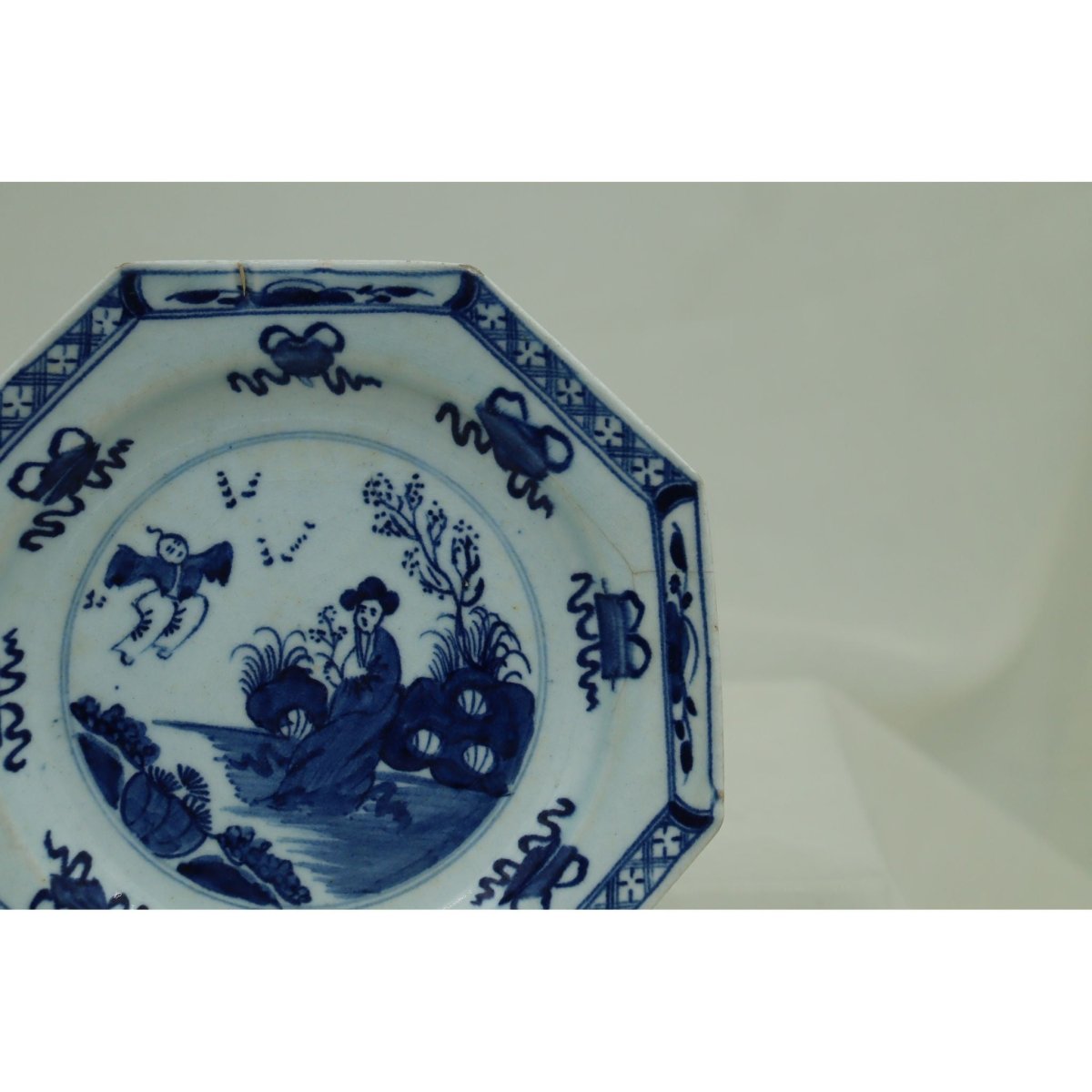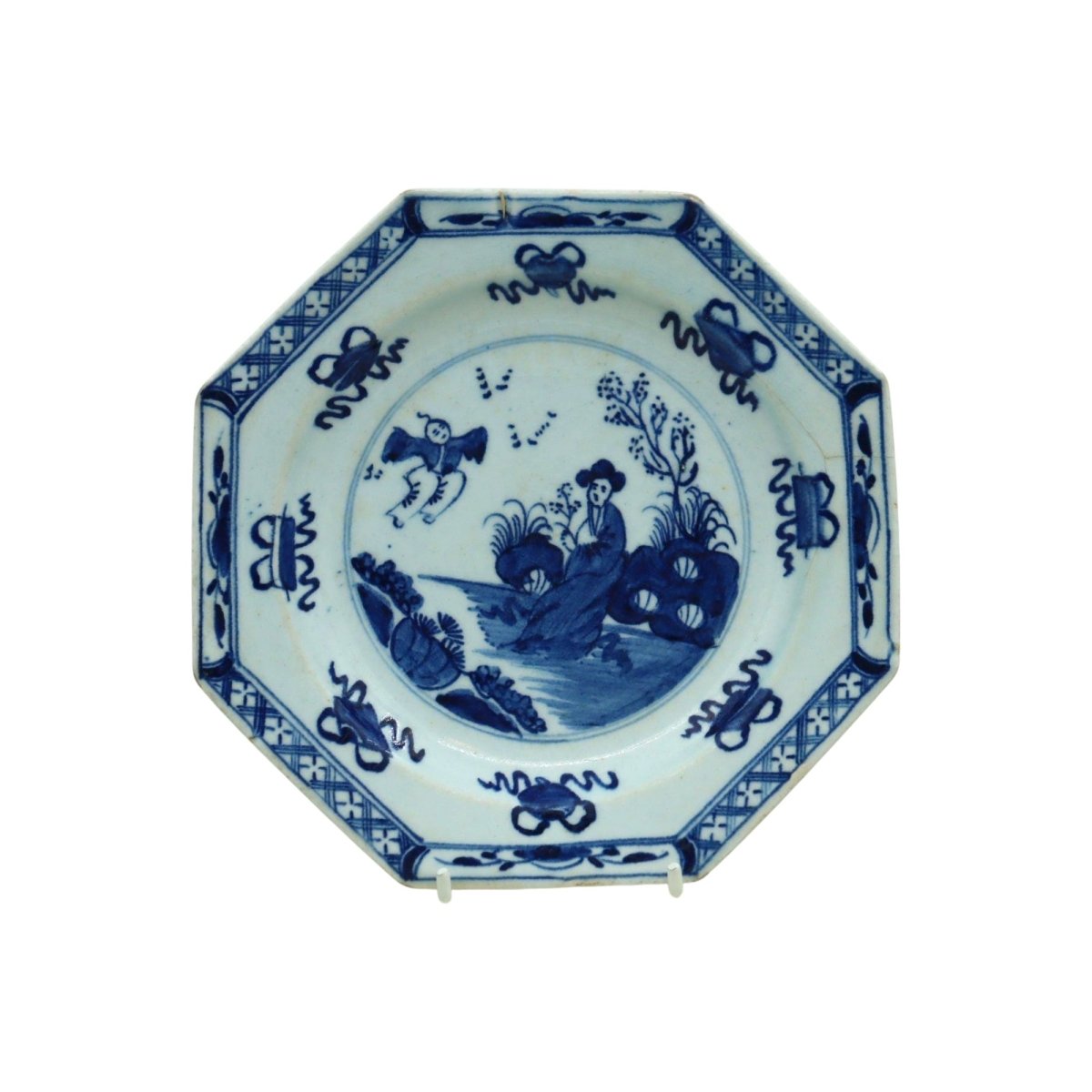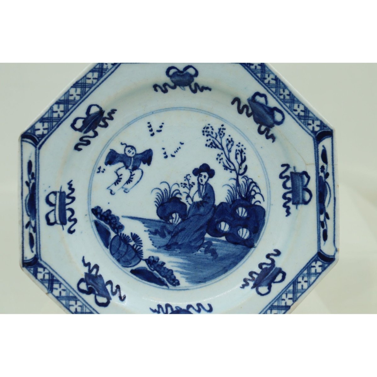 This early Bow octagonal plate is decorated with the hand painted, underglaze blue "Jumping Boy" pattern, after a Chinese original, with a woman seated in a garden watching a boy who seems to jump. Surrounding the central scene are eight Buddhist scrolls tied with ribbons, and the rim features a lattice and flowerhead border. On the reverse are three branches or seaweed sprays. It measures 182 mm (7 1/8th inches) across the widest points and it stands 20 mm (.75 of an inch) high. It has a very fine branched crack from the rim which is more noticeable from the back. It would date from around 1755.