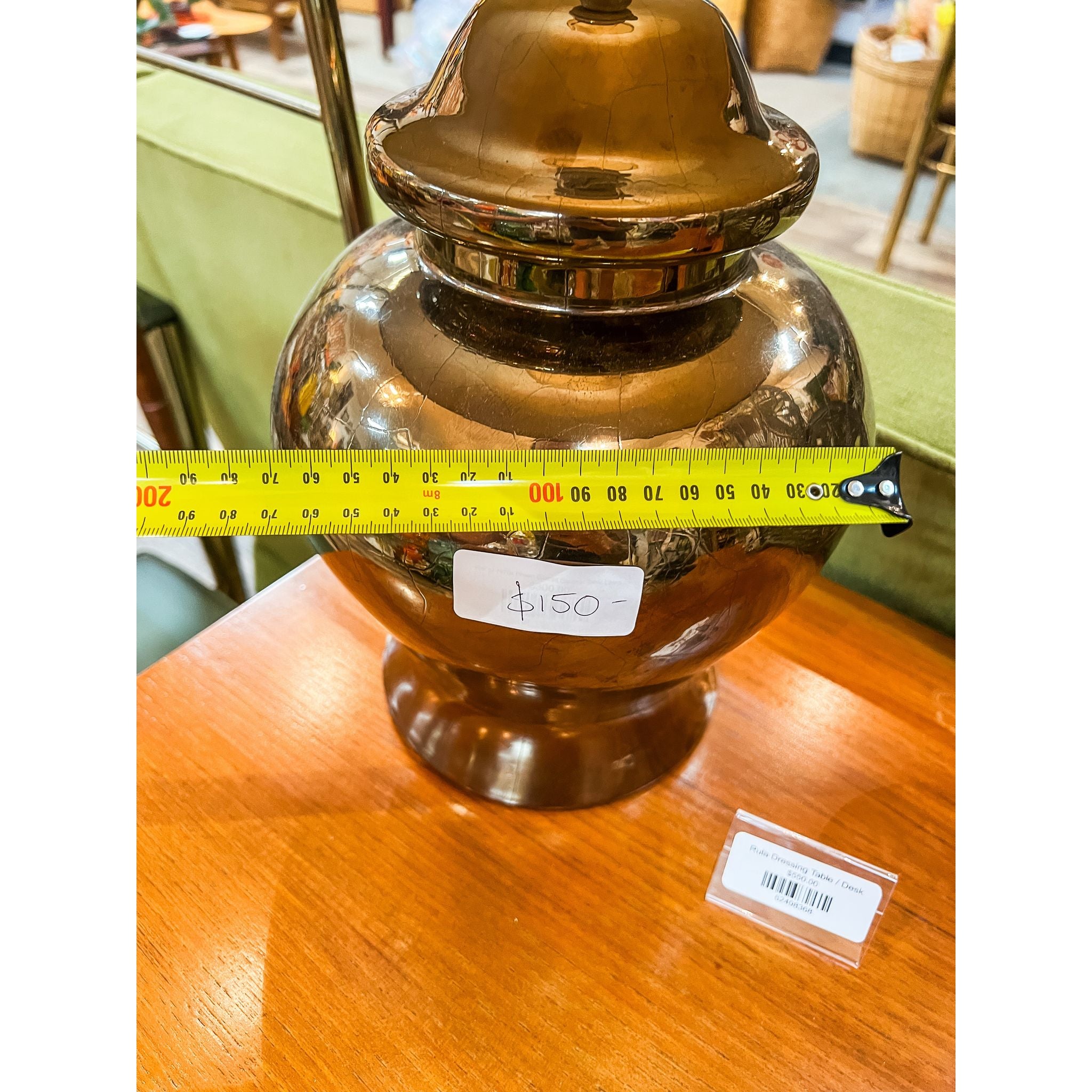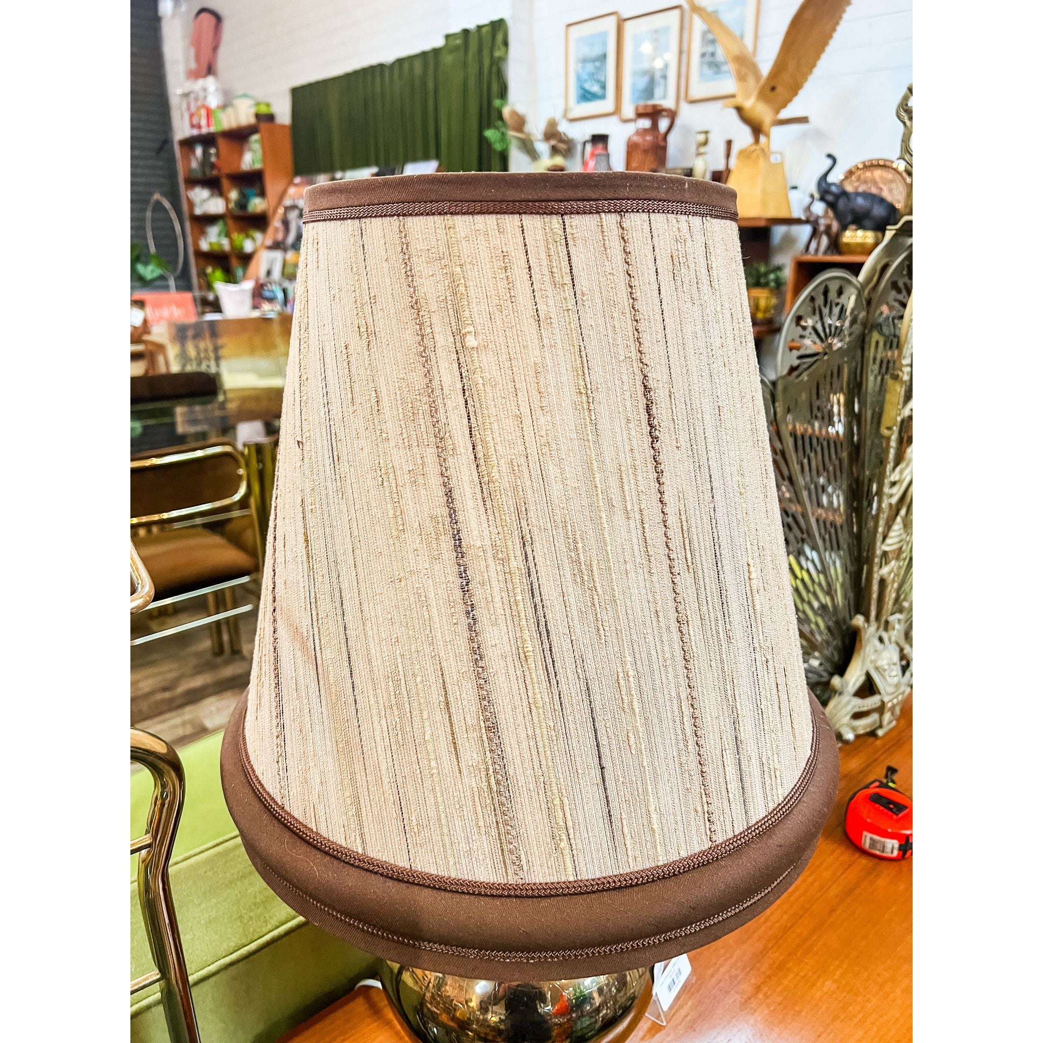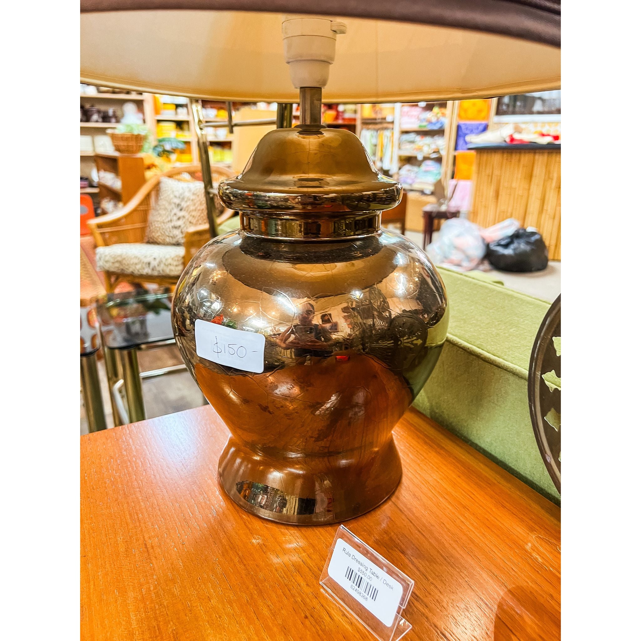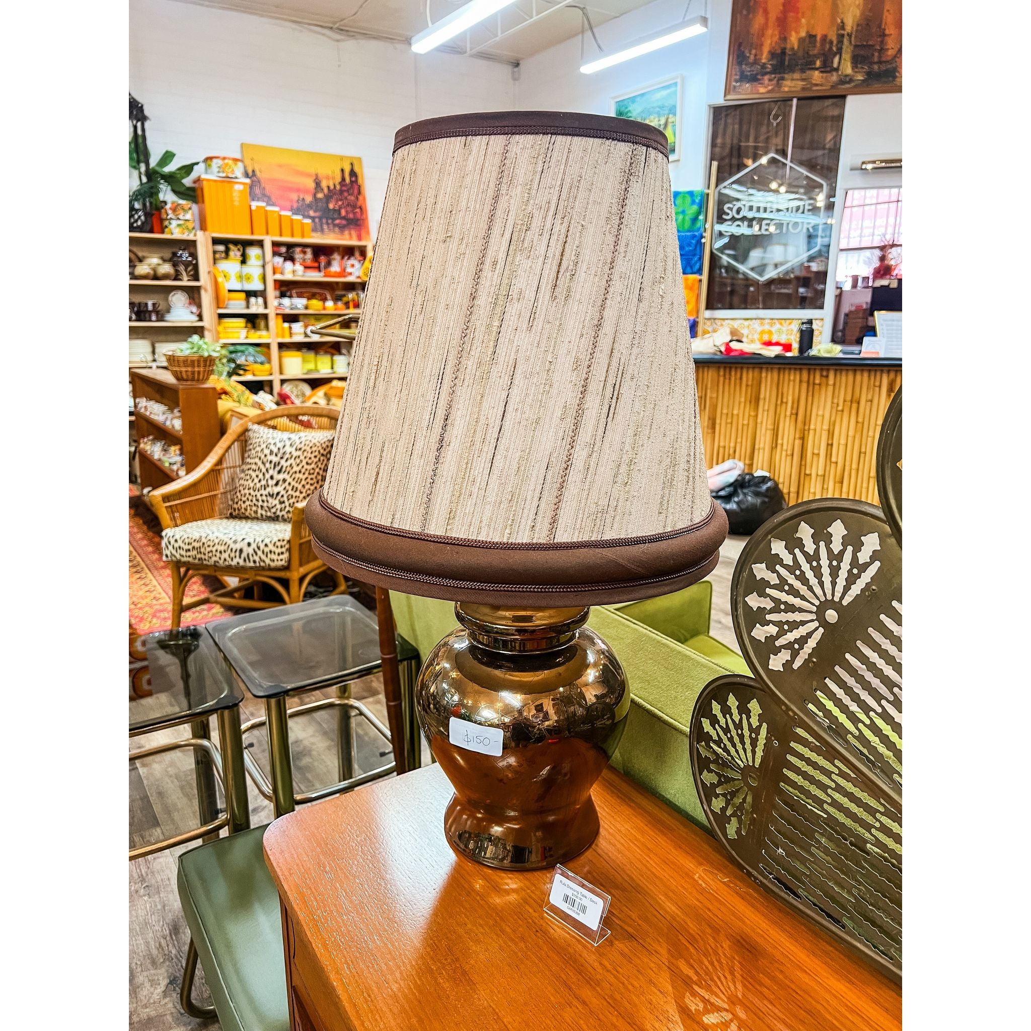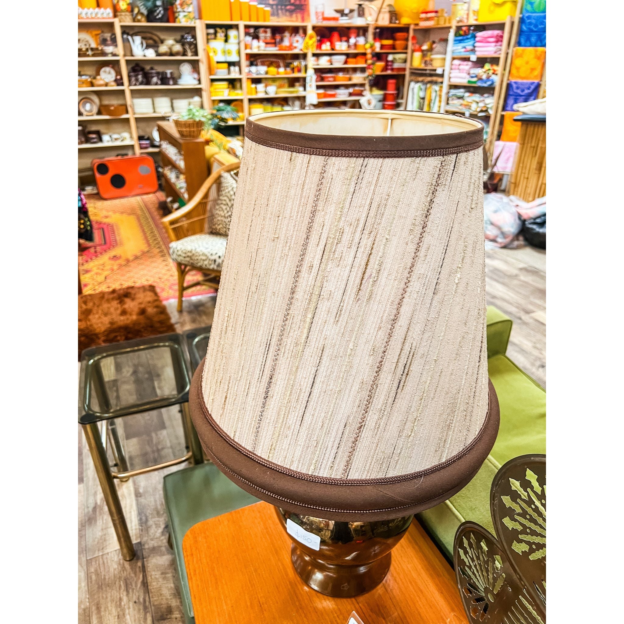 A beautiful vintage table lamp featuring a glossy brown glazed ceramic base paired with a classic tapered fabric shade. The warm, earthy tones add depth and character, making this an easy piece to style across mid-century, vintage and eclectic interiors.