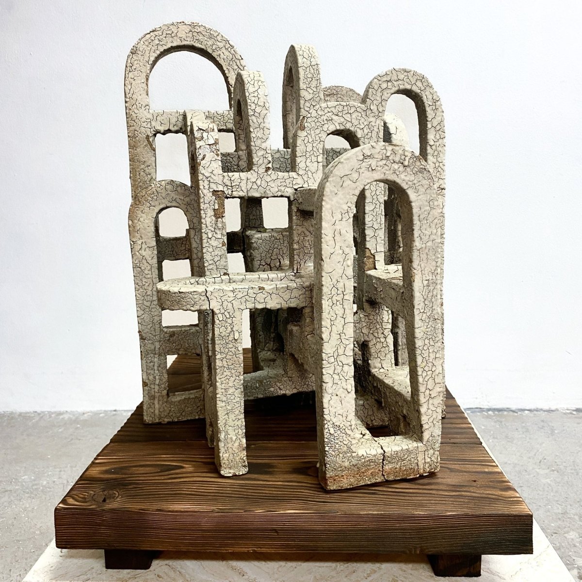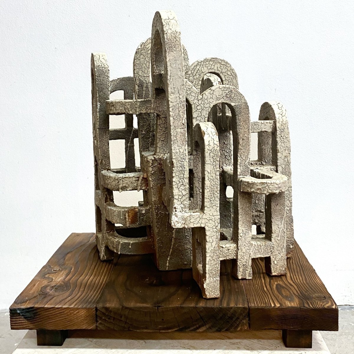 Brutalist style ceramic stoneware sculpture with crackle glaze on charred wood base, featuring an intricate, architectural design reminiscent of geometric structures and arches.