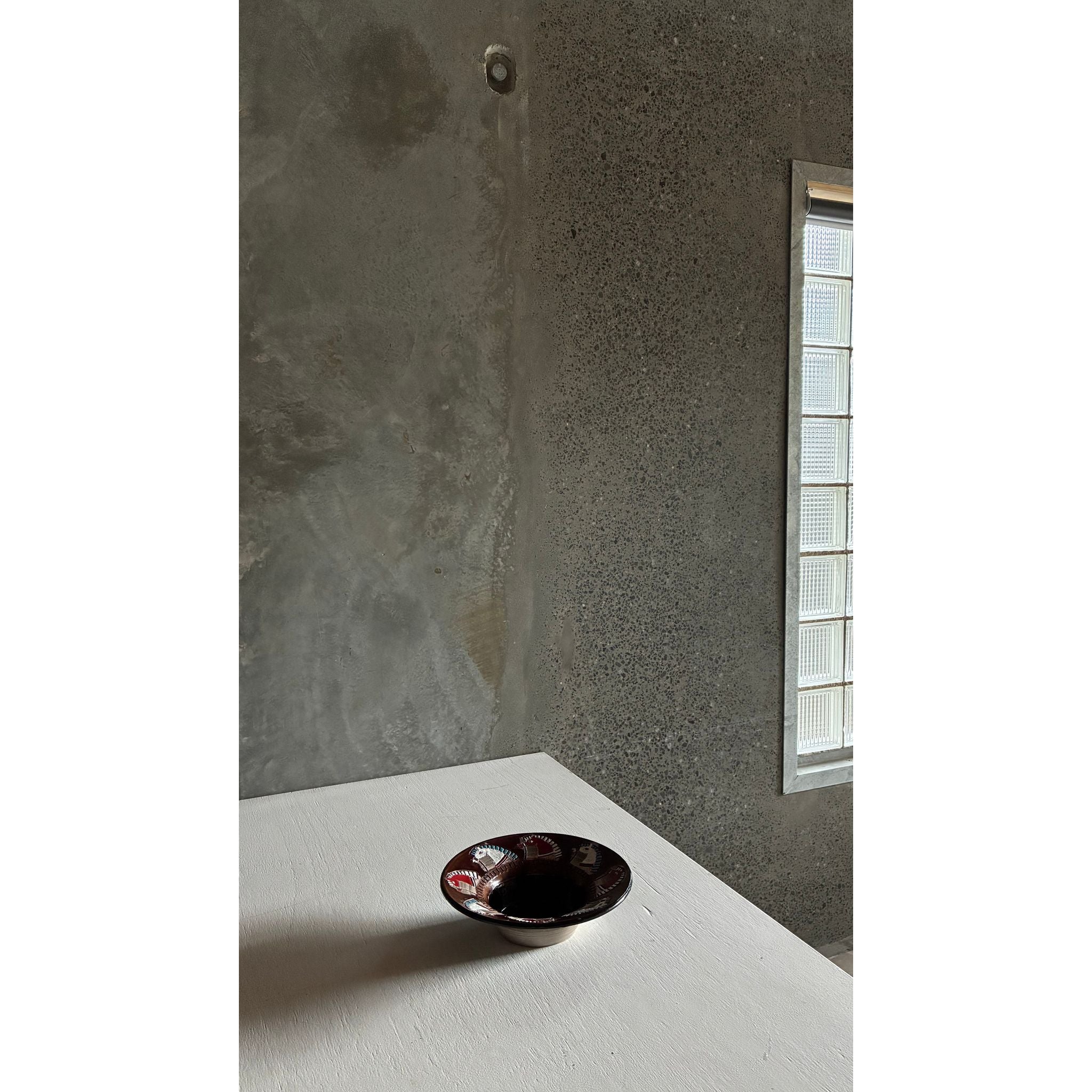 Rich brown glaze frames the lively motif of red, ivory and turquoise, giving the piece both depth and graphic presences. Raised on a low pedestal foot, the bowl has a sculptural profile that works beautifully as a centrepiece or decorative object.
