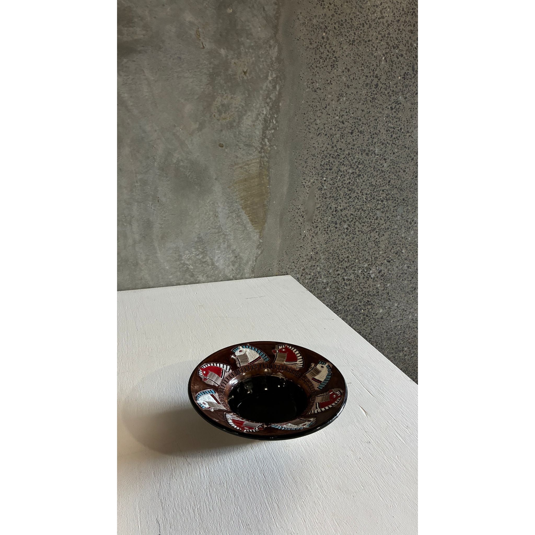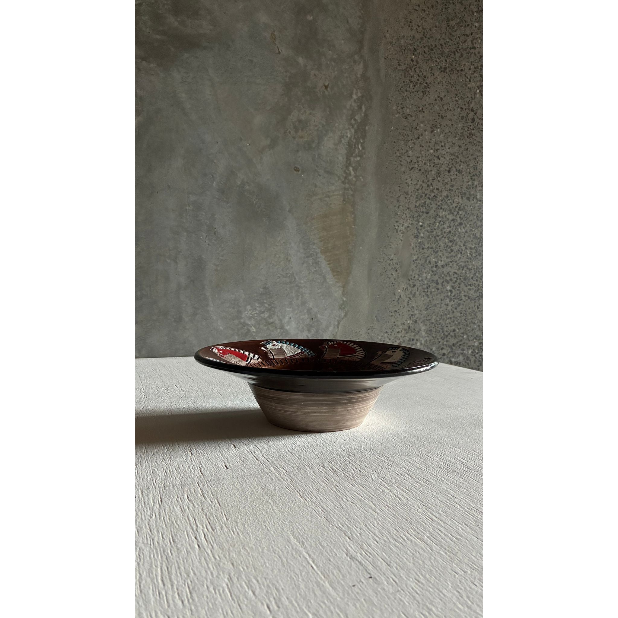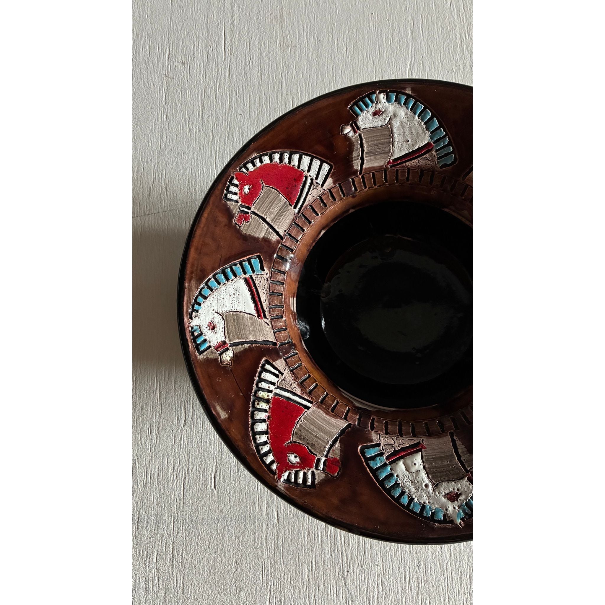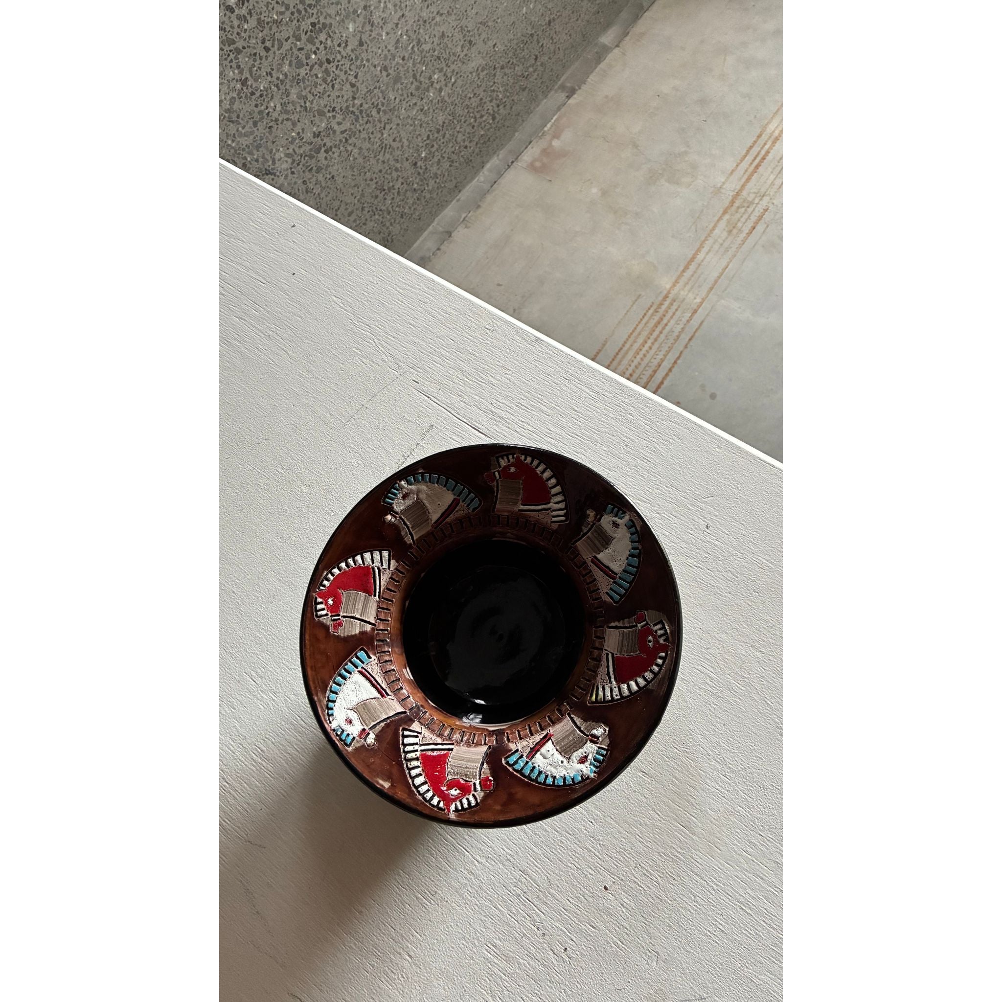 A striking mid-century ceramic bowl by Fratelli Fanciullacci, produced in Montelupo, Italy. The wide rim is decorated with stylised horse heads rendered in the traditional sgraffito technique, where layers of coloured slip are carved away to reveal contrasting tones beneath.