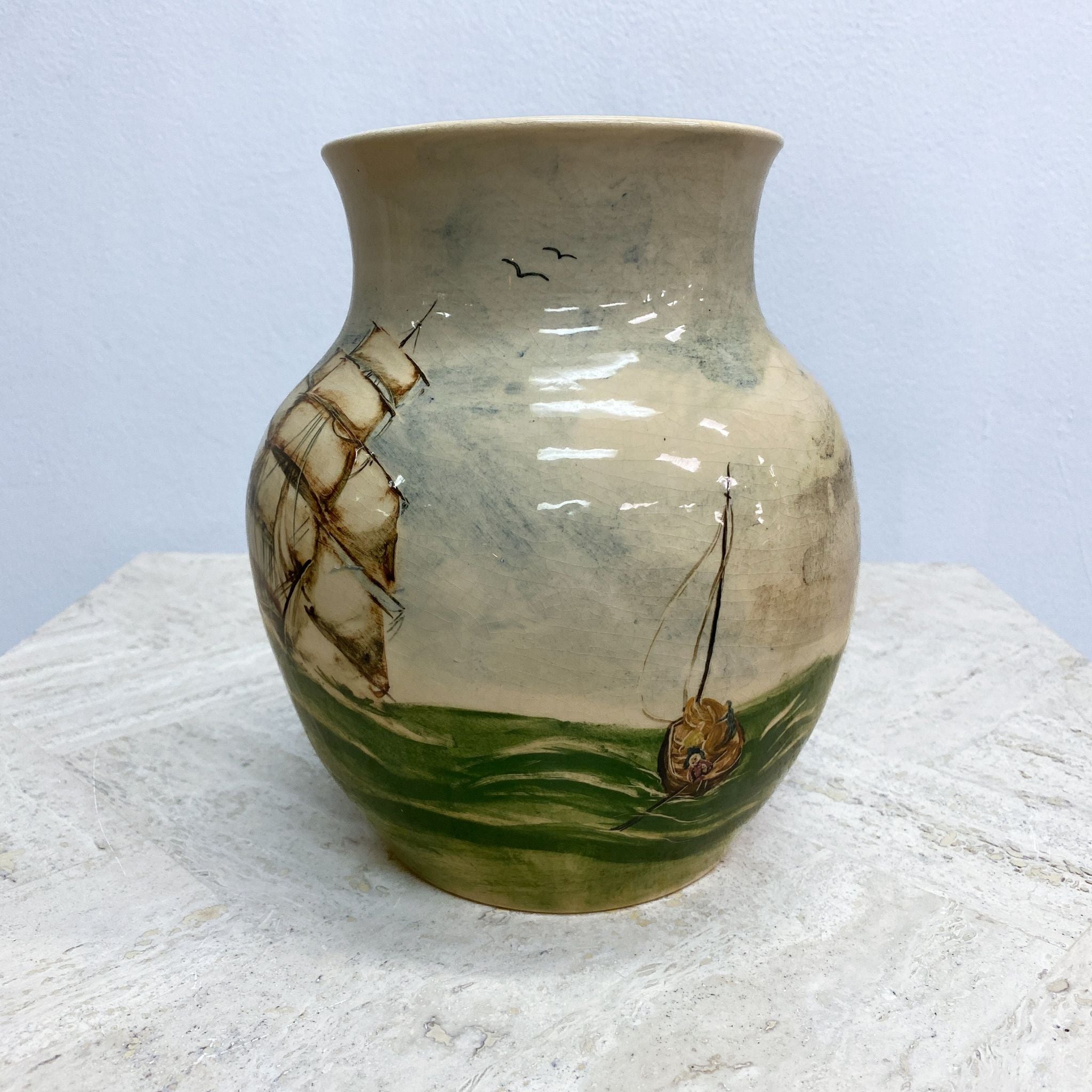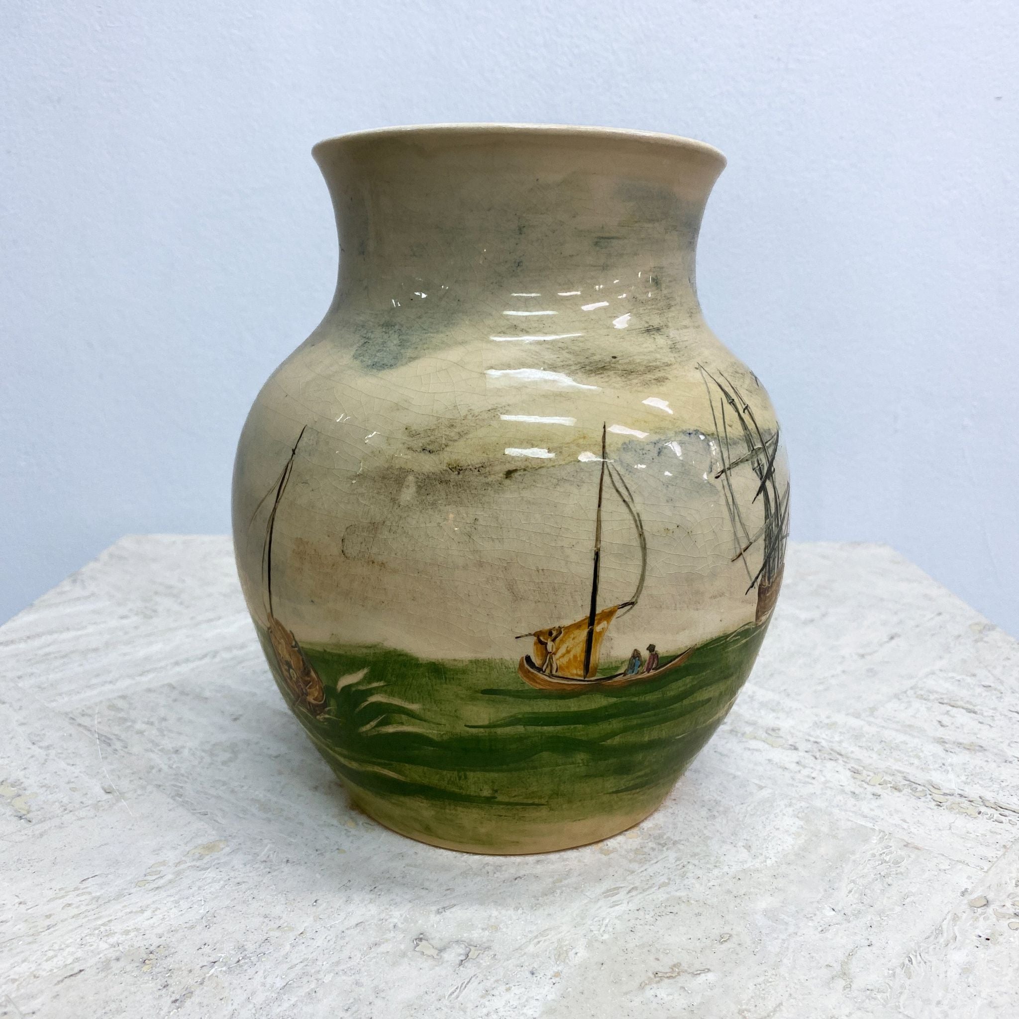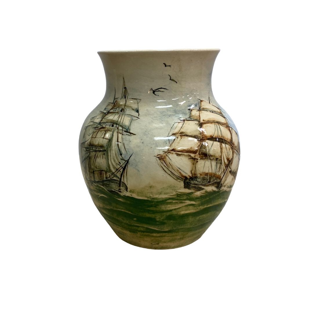 Mid Century Martin Boyd Hand painted Ship Vase features a detailed nautical design showing two sailing ships with full masts and sails, likely inspired by 19th-century maritime themes. Classic hourglass or baluster shape with a earthy tone colour palette.
