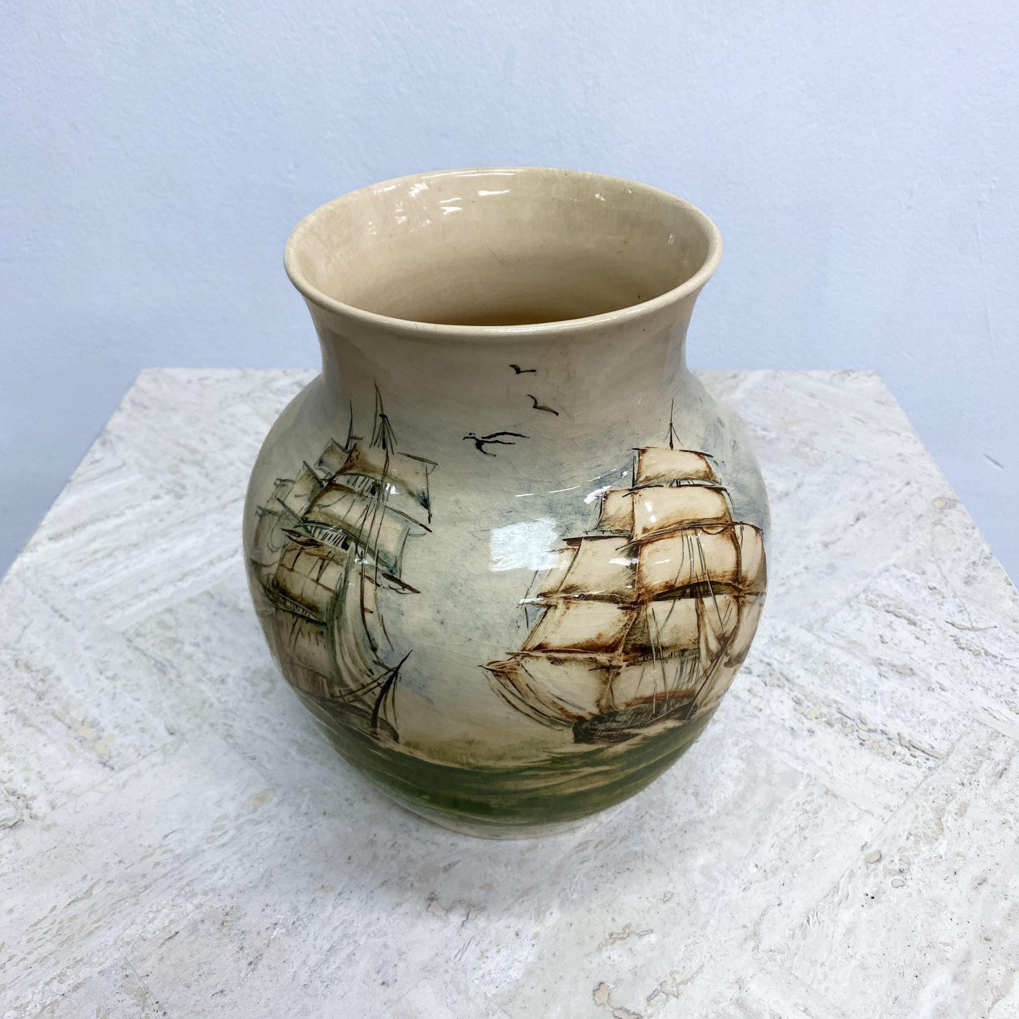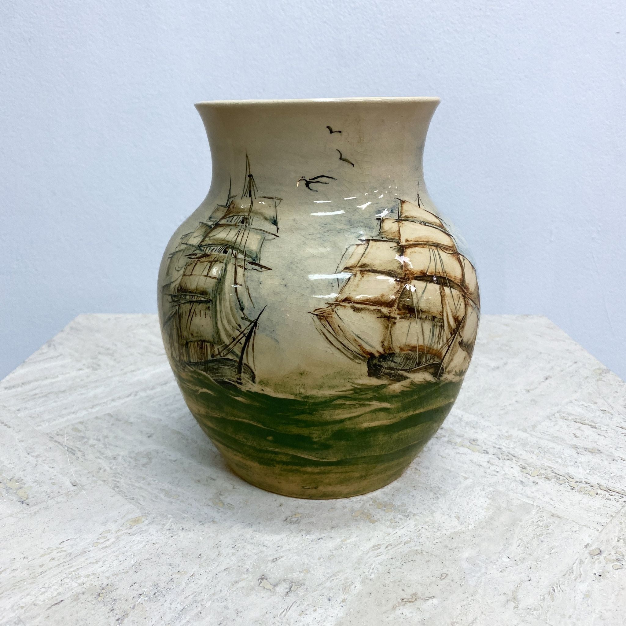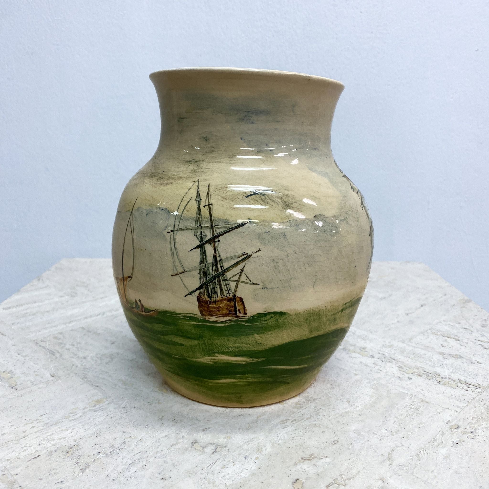 Mid Century Martin Boyd Hand painted Ship Vase features a detailed nautical design showing two sailing ships with full masts and sails, likely inspired by 19th-century maritime themes. Classic hourglass or baluster shape with a earthy tone colour palette.