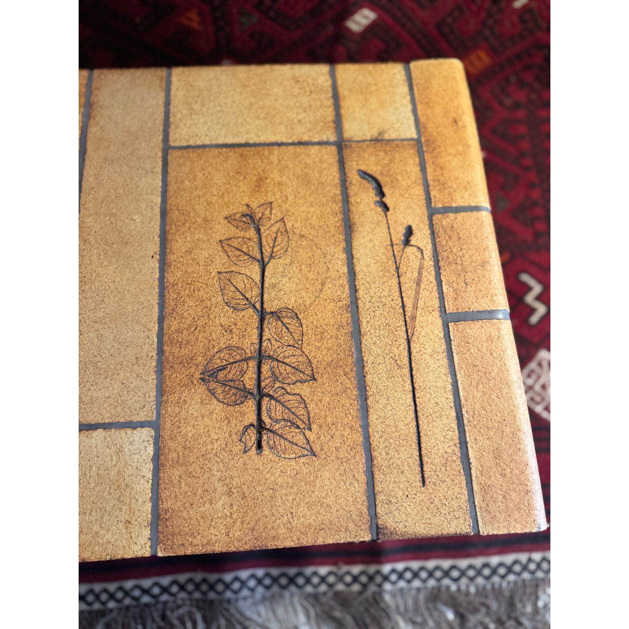 The tiled surface features warm terracotta tones decorated with Capron’s iconic botanical imprints — each tile pressed with natural leaves to create a delicate fossil-like impression. Set within a clean rectangular form, the low height makes this an ideal centrepiece for a lounge, allowing the surface artwork to be admired from every angle.