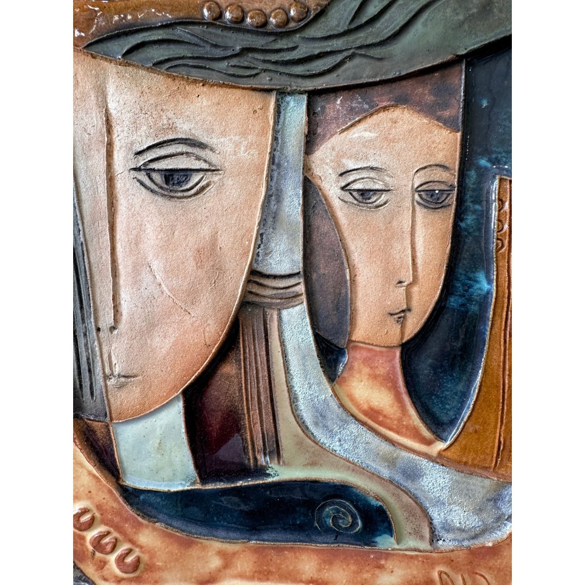 A beautifully composed ceramic wall plaque by Ruth Faktorowicz (born 1937), featuring a sculptural, hand-modelled relief with expressive modernist faces and rich, earthy glazing. The work has a wonderful sense of depth and movement—graphic lines, warm terracotta tones, smoky charcoal and muted blue/green highlights—making it a standout piece for collectors of mid-century and modernist ceramics.