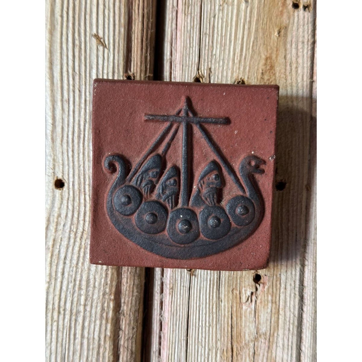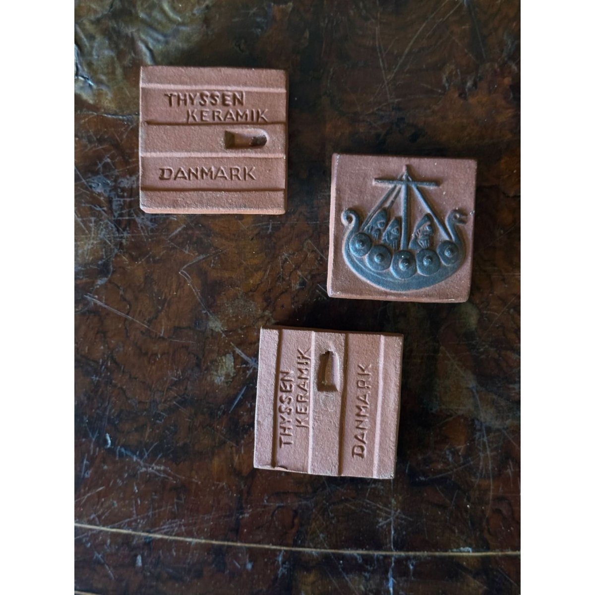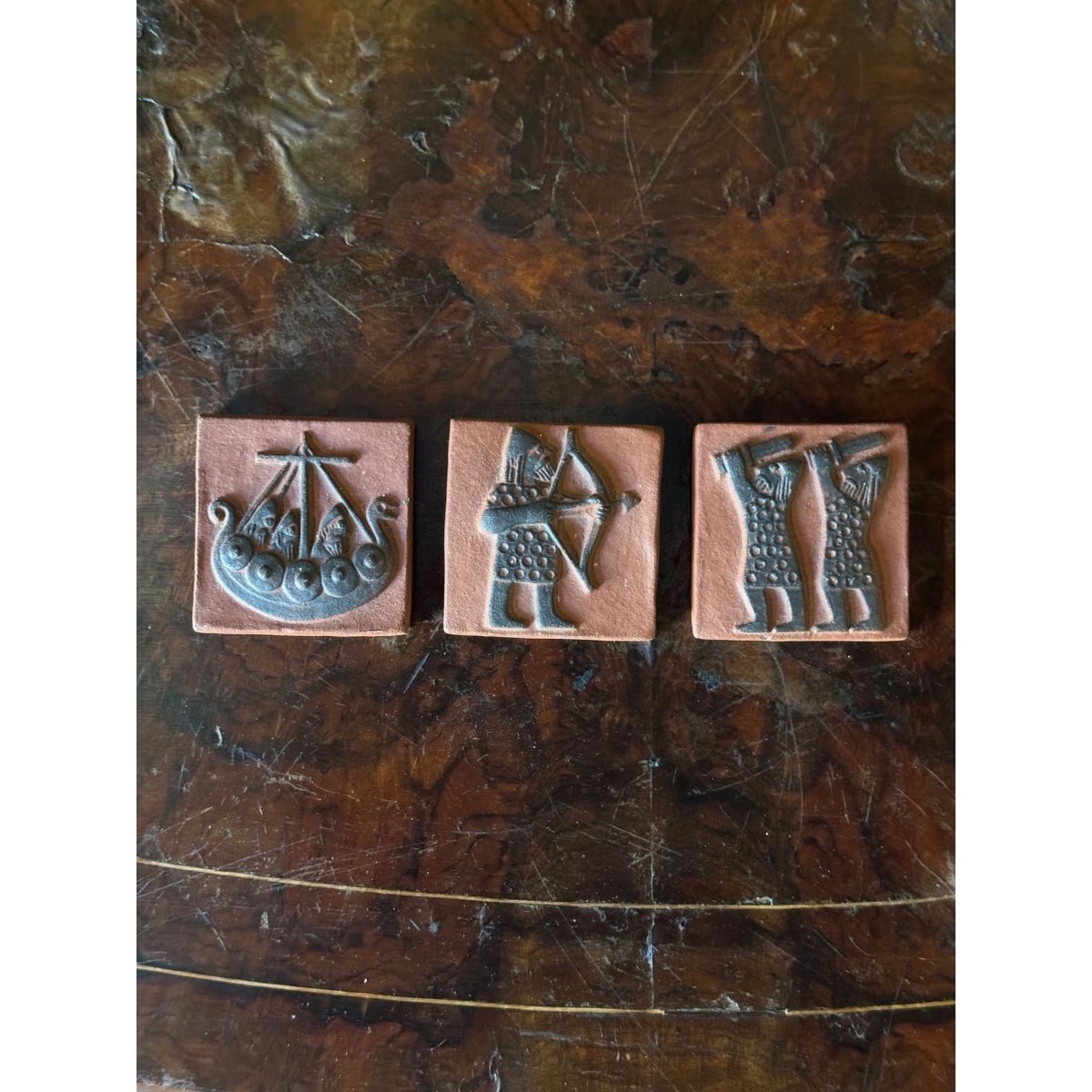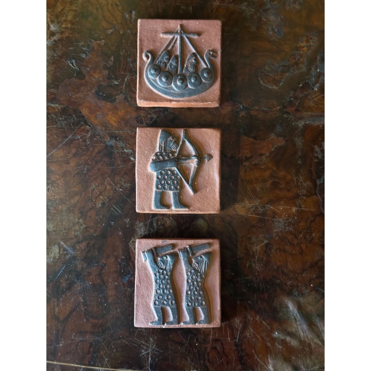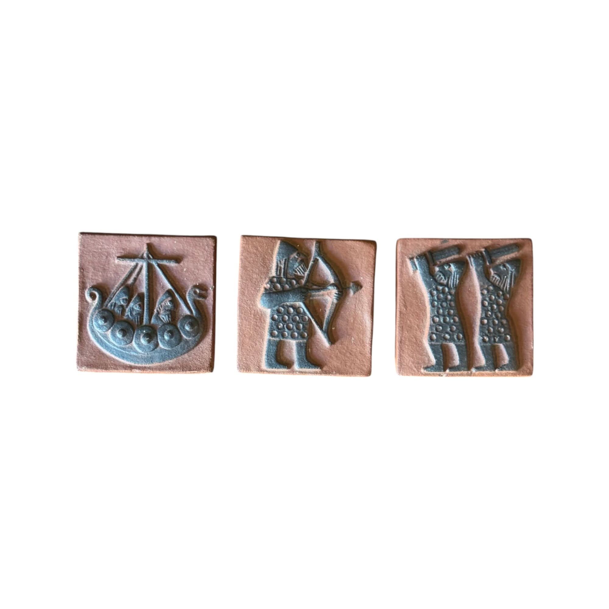 A beautiful set of 3 vintage Thyssen ceramic wall plaques from Denmark depicting various viking scenes. Back of tiles enscribed 'Thyssen Keramik Danmark'. Sold as a set of three.