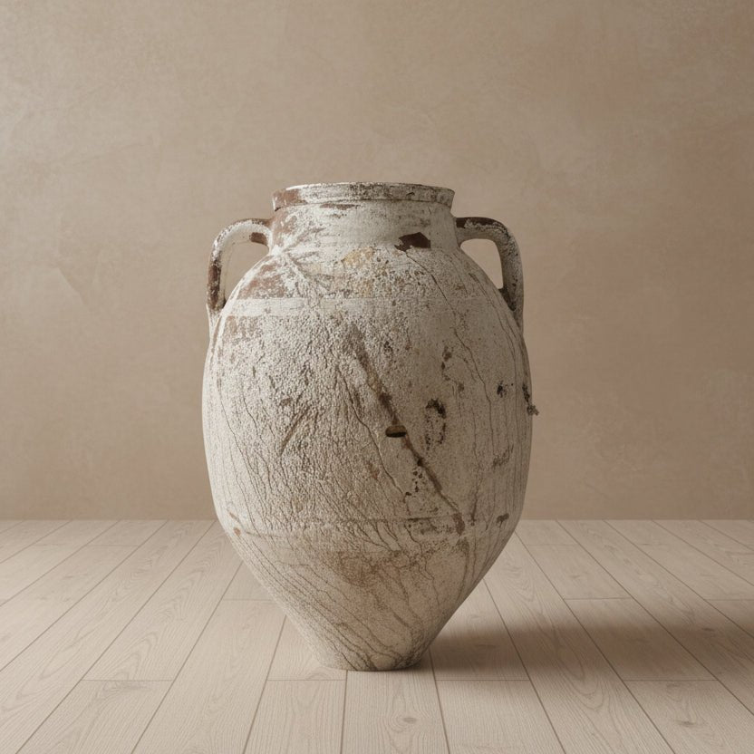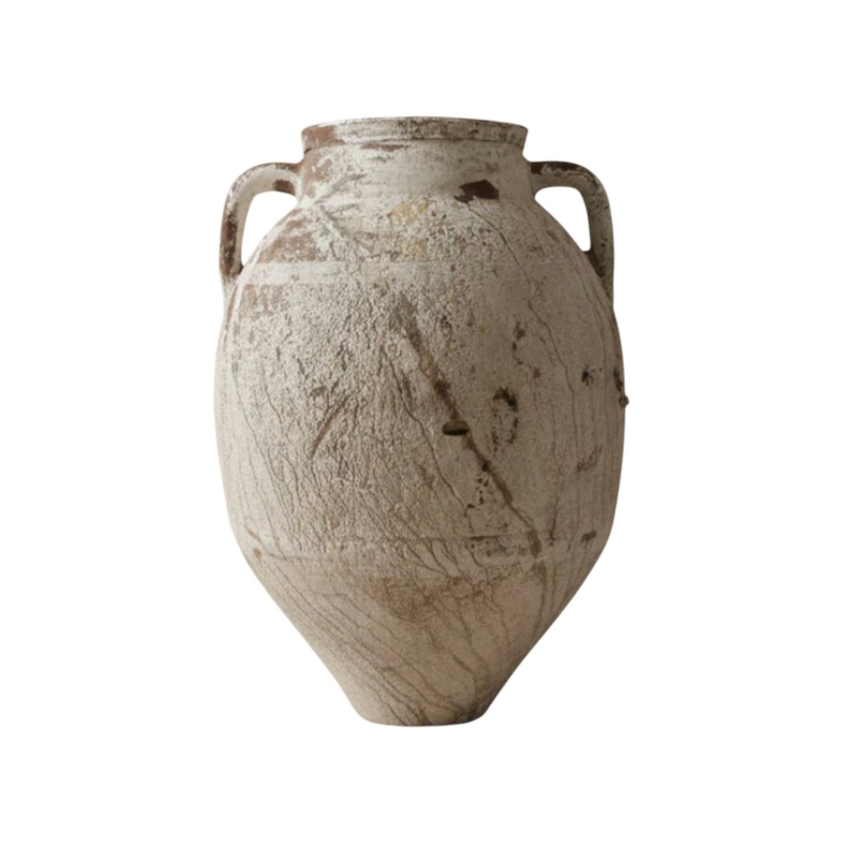 This original, solid and heavy vessel is exactly as shown. Originally used to store olive oil, it’s a one-of-a-kind piece that has weathered uniquely over time. Gathered layers of sediment paint and patina make it a stunning display piece.