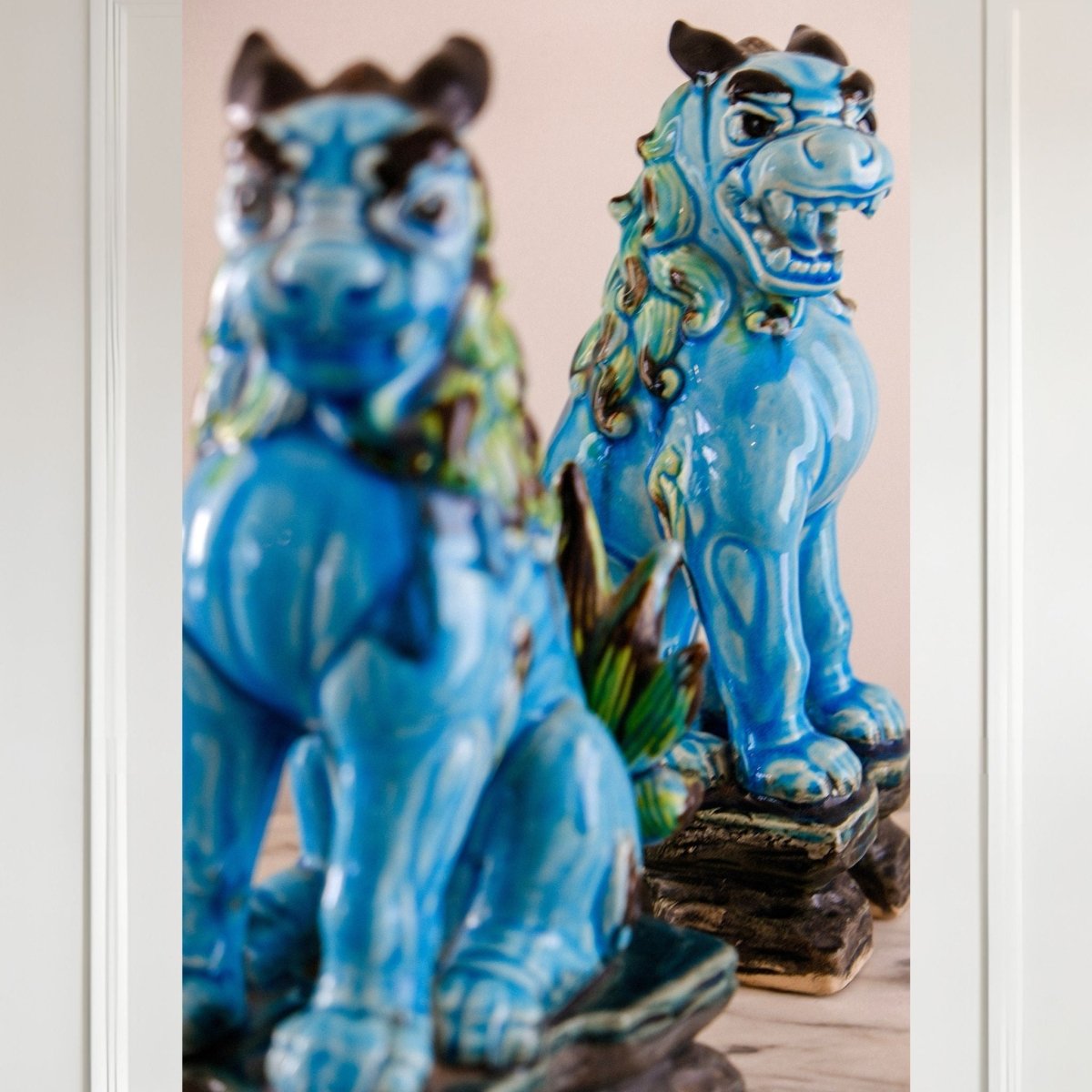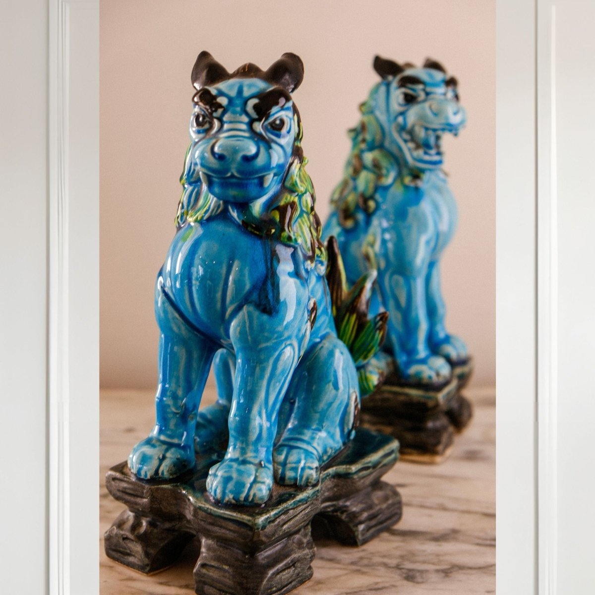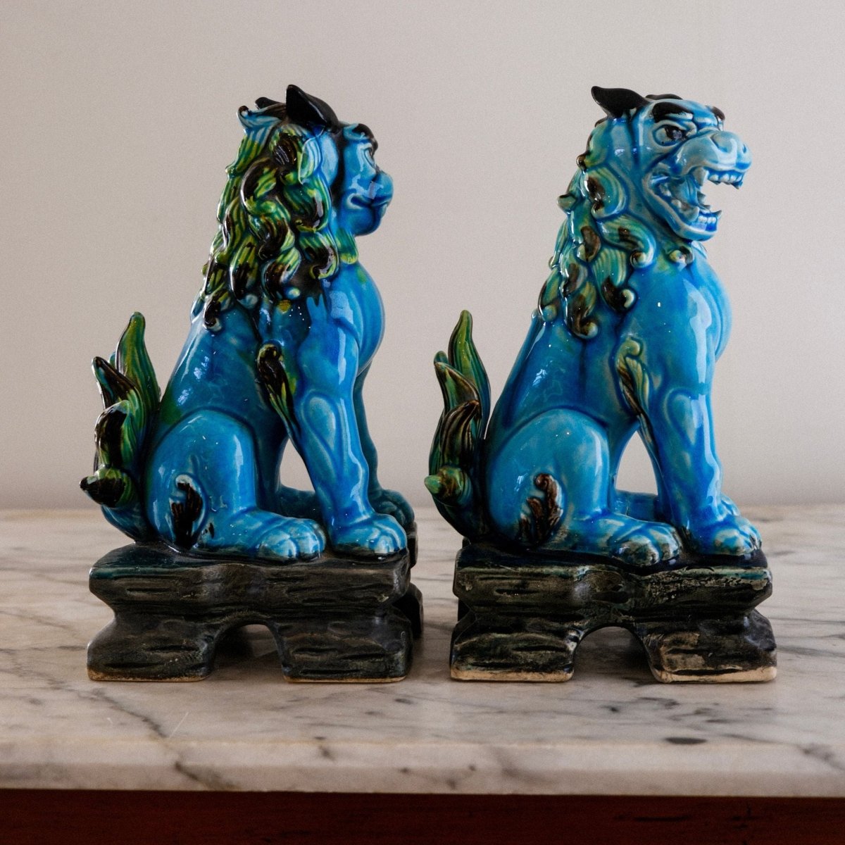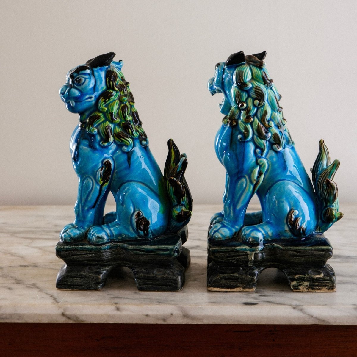 These mid-century foo dogs sit at the intersection of Asian tradition and Western mid-century design aesthetics. The turquoise glaze was hugely popular during this era, making these pieces both collectible and highly decorative.