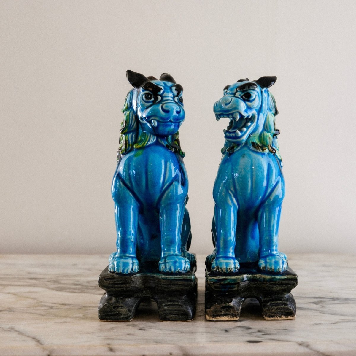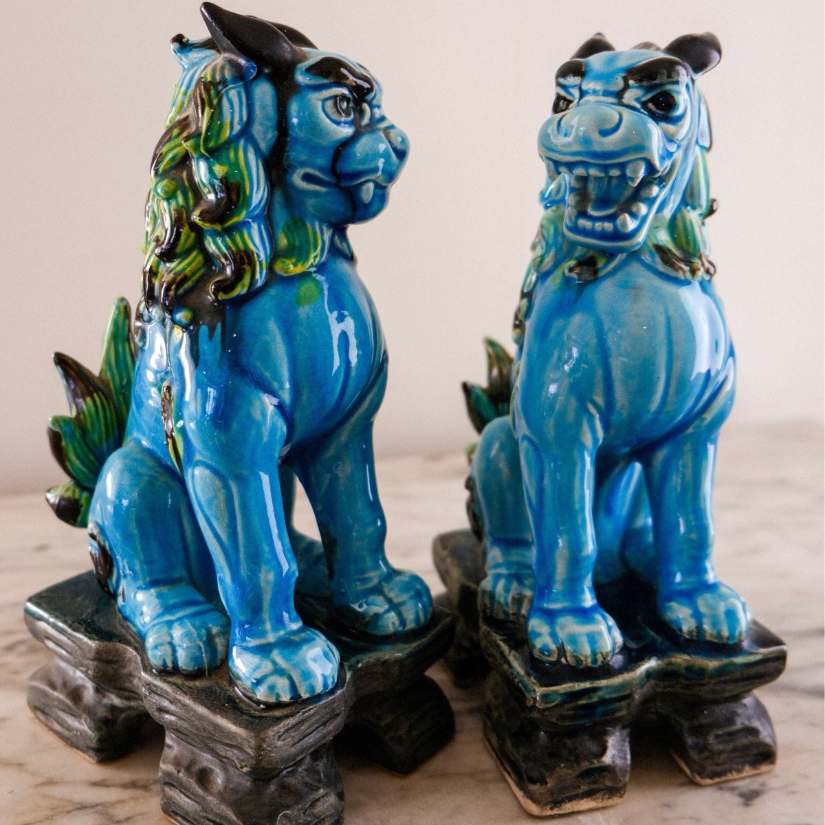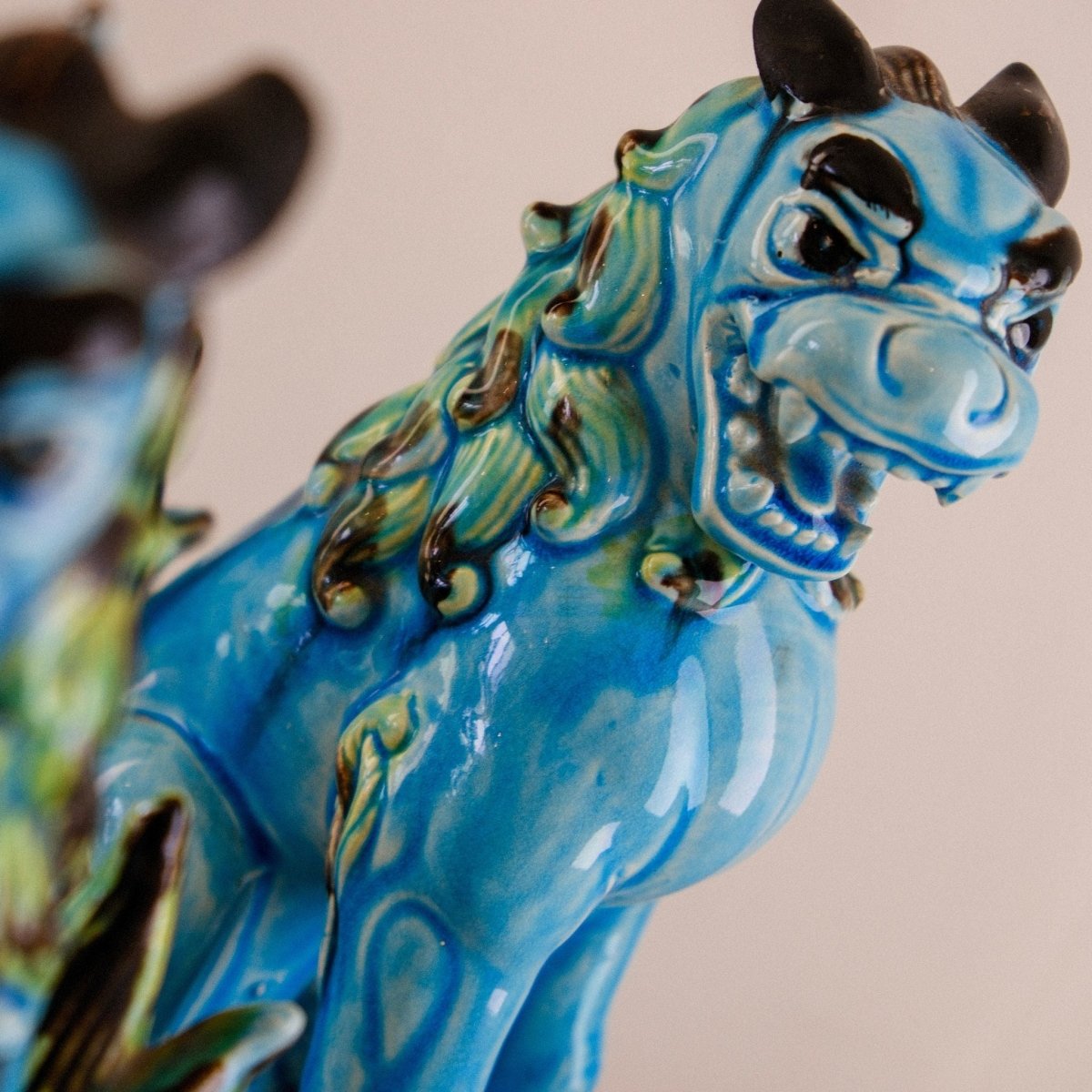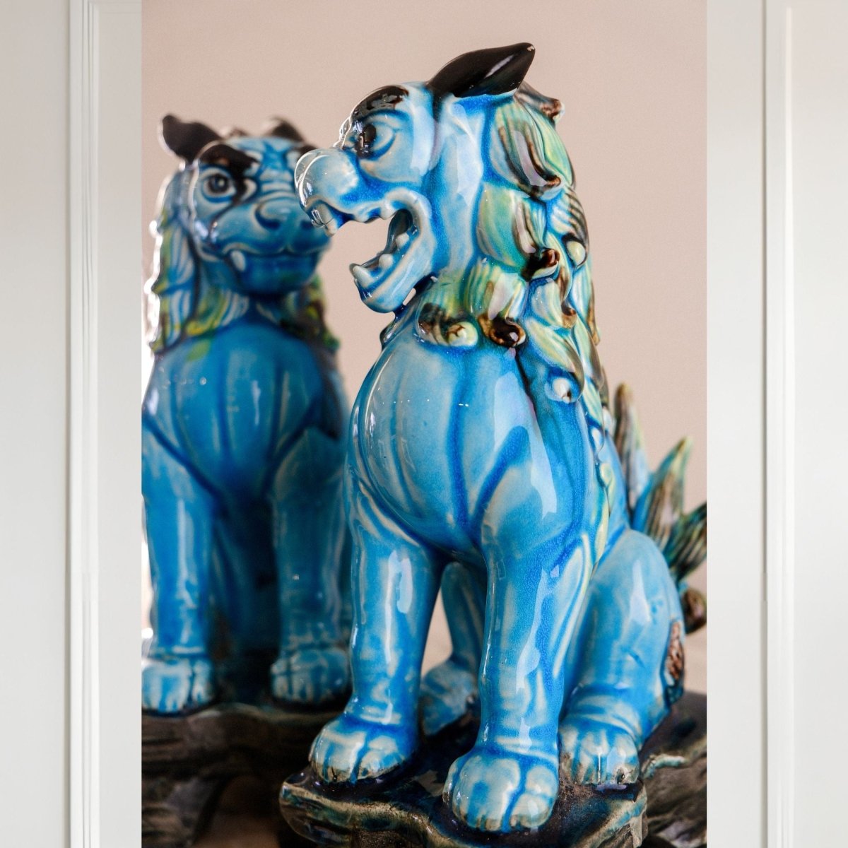 These mid-century foo dogs sit at the intersection of Asian tradition and Western mid-century design aesthetics. The turquoise glaze was hugely popular during this era, making these pieces both collectible and highly decorative.
