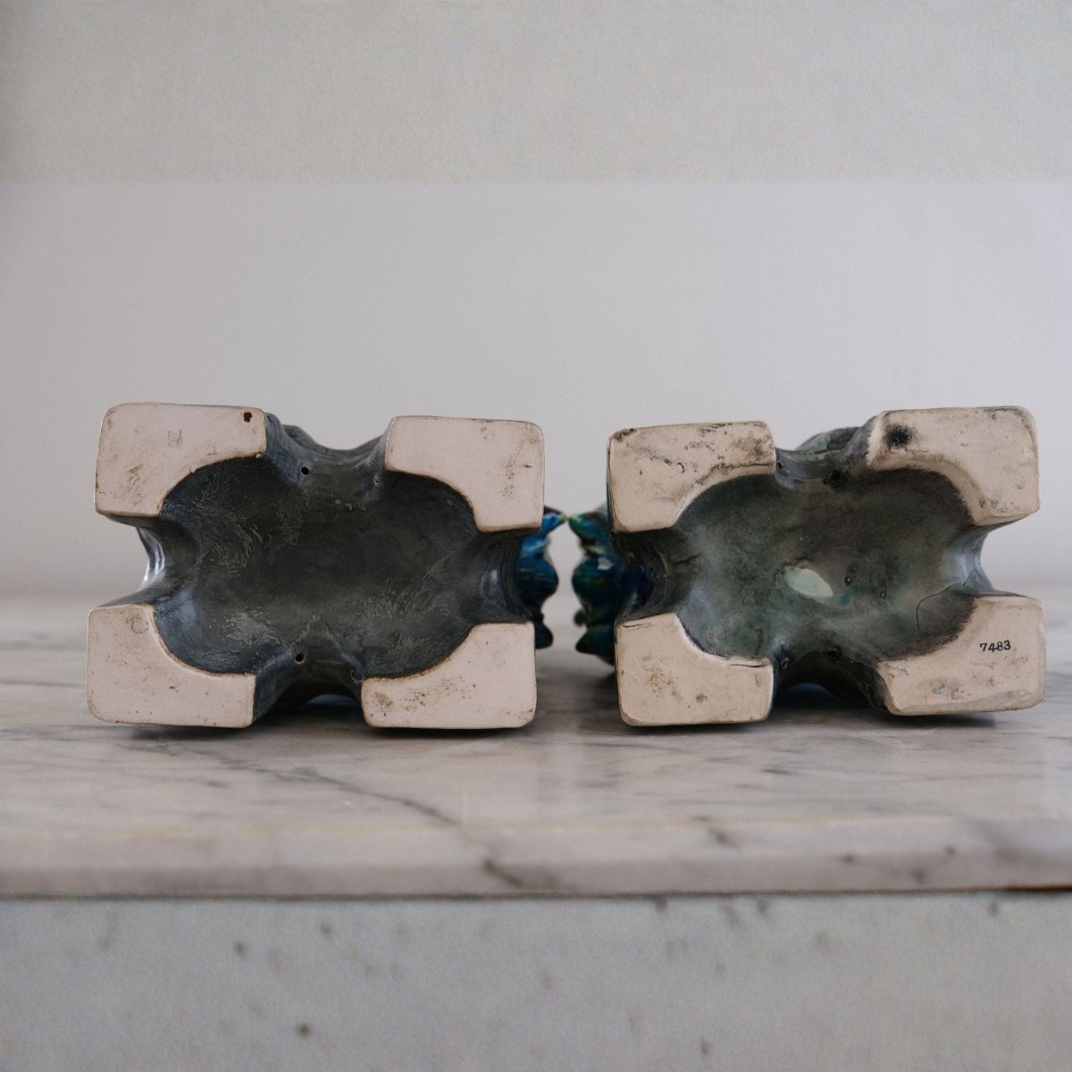 Guardian lions in traditional seated pose — male with open mouth, female with closed mouth. Vibrant turquoise ceramic with green flame detailing and decorative carved bases. Manufacturing mark "7483" on base.