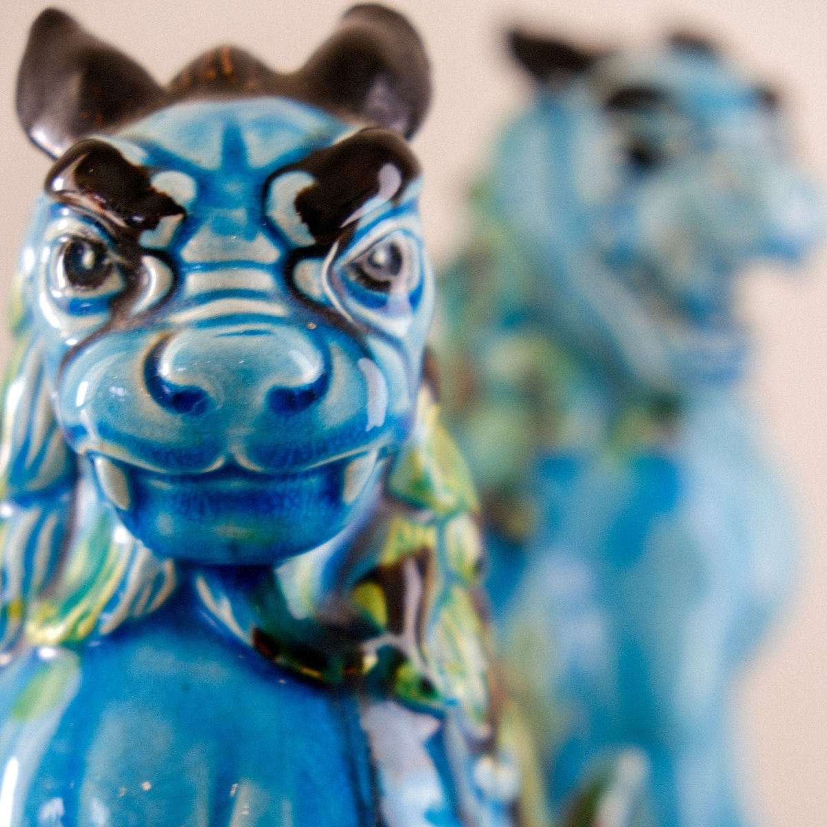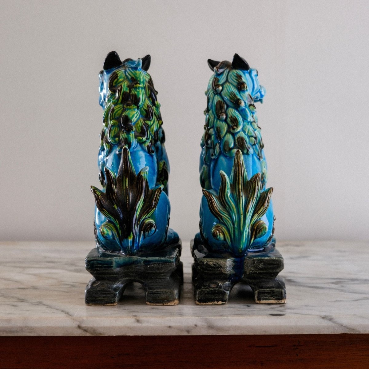 A striking pair of vintage ceramic foo dogs in distinctive turquoise and green glaze. Mid-century production, likely 1960s-1970s.