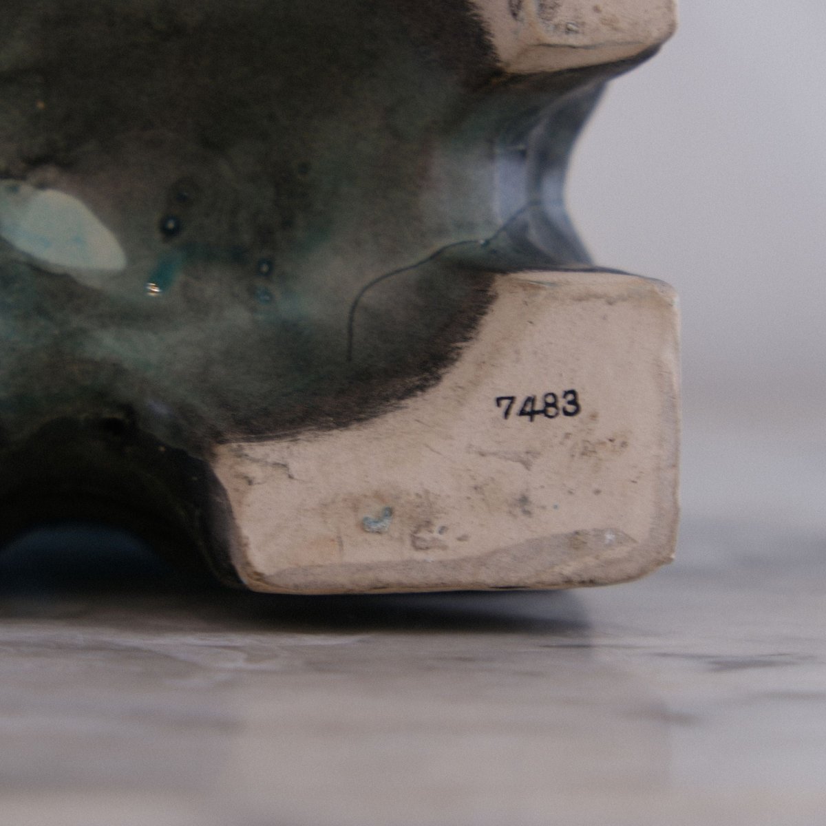 Condition: Good vintage condition. Glaze crazing throughout (expected for age, adds authenticity). Some slight flecks of black paint have flaked off the ear region of one of the statues, as pictured. Bases show age-appropriate wear.