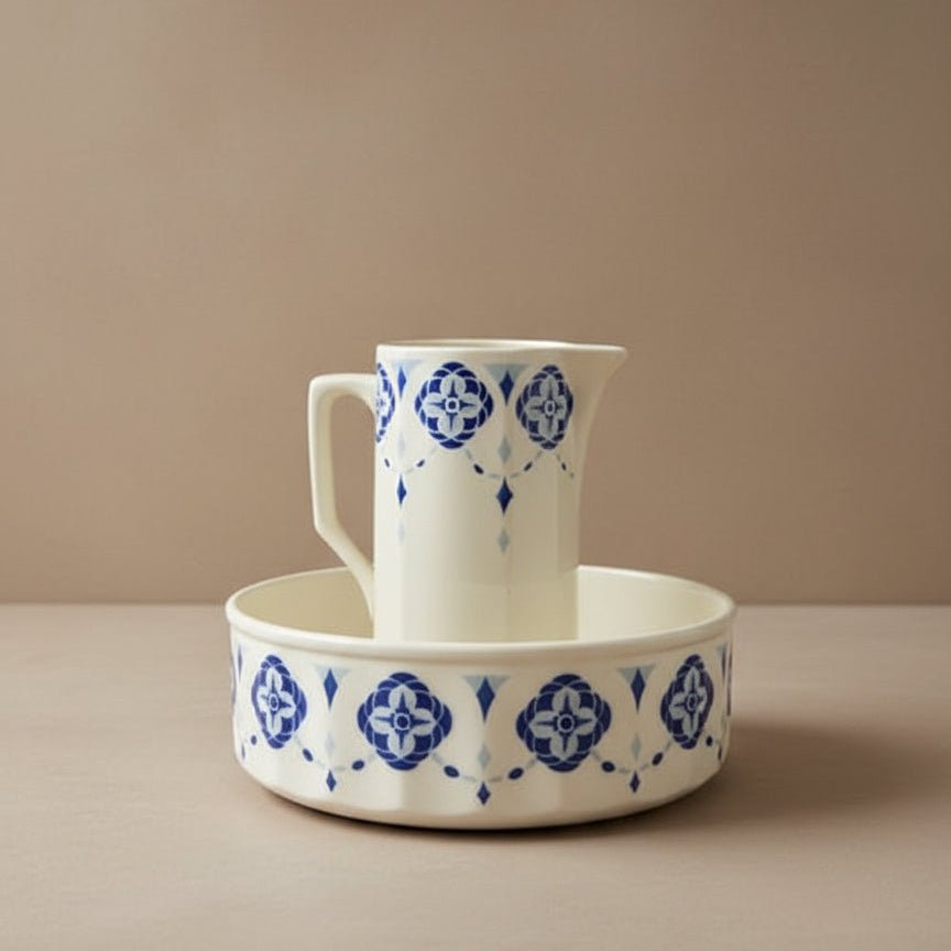 The set includes a large basin and a matching pitcher, historically used for washing in bedrooms before modern plumbing.It features a distinctive blue and white geometric and floral pattern.Dating back to the Art Deco period, these items are considered collectible ironstone or faience.