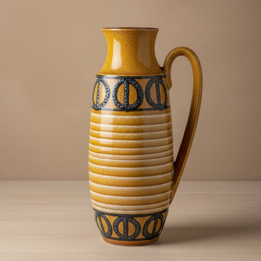 This striking West German Scheurich 408-40 vase captures the essence of 1960s ceramics with its bold design and quality craftsmanship. Handcrafted from white clay by Scheurich Keramik in Kleinheubach, it features a distinctive honey-brown glaze accented with dramatic black lava texturing and delicate white mottling. The generous proportions and sturdy handle make it a statement piece that commands attention in any room. Pristine condition with no damage—the embossed base marking confirms its authentic West German heritage. A true mid-century gem that brings vintage character and timeless appeal to modern interiors.