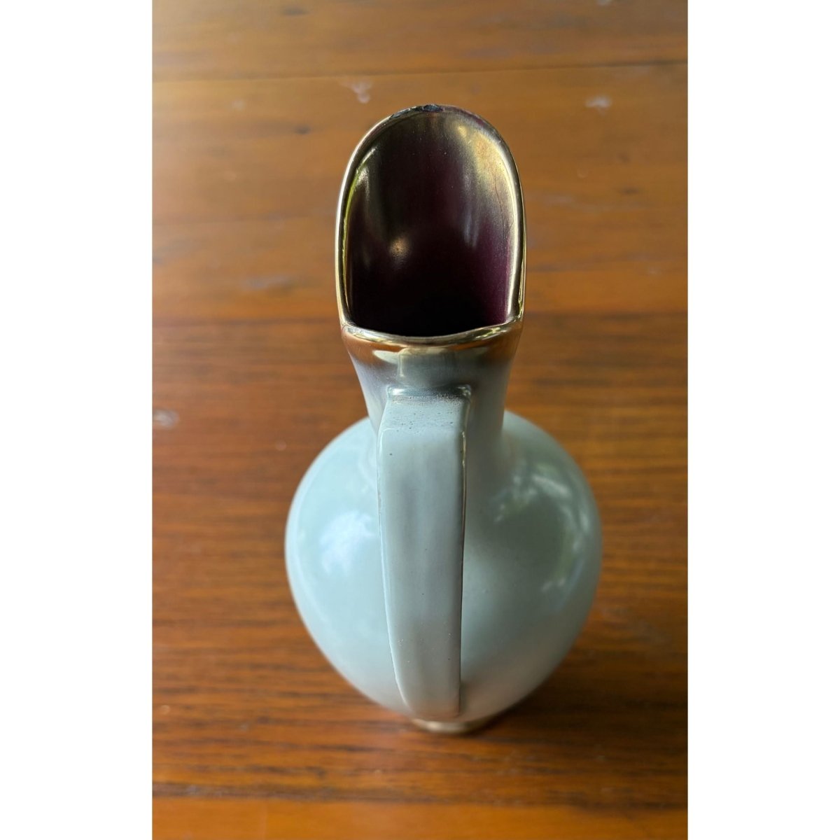 Elegant Mid Century Marei Keramik piece in dove white with gold detail on rim, handle and base