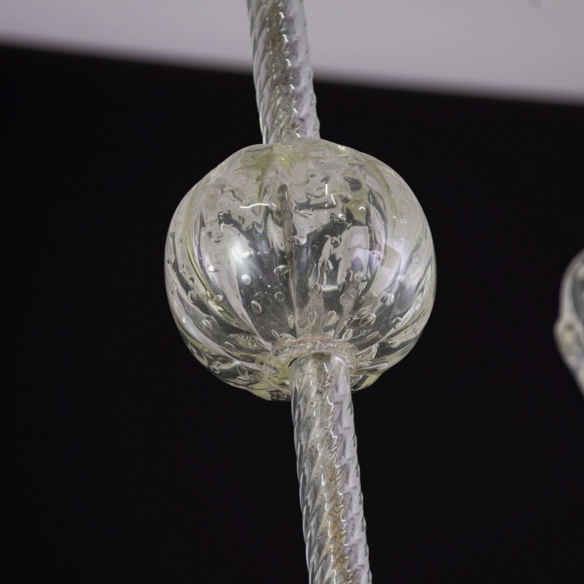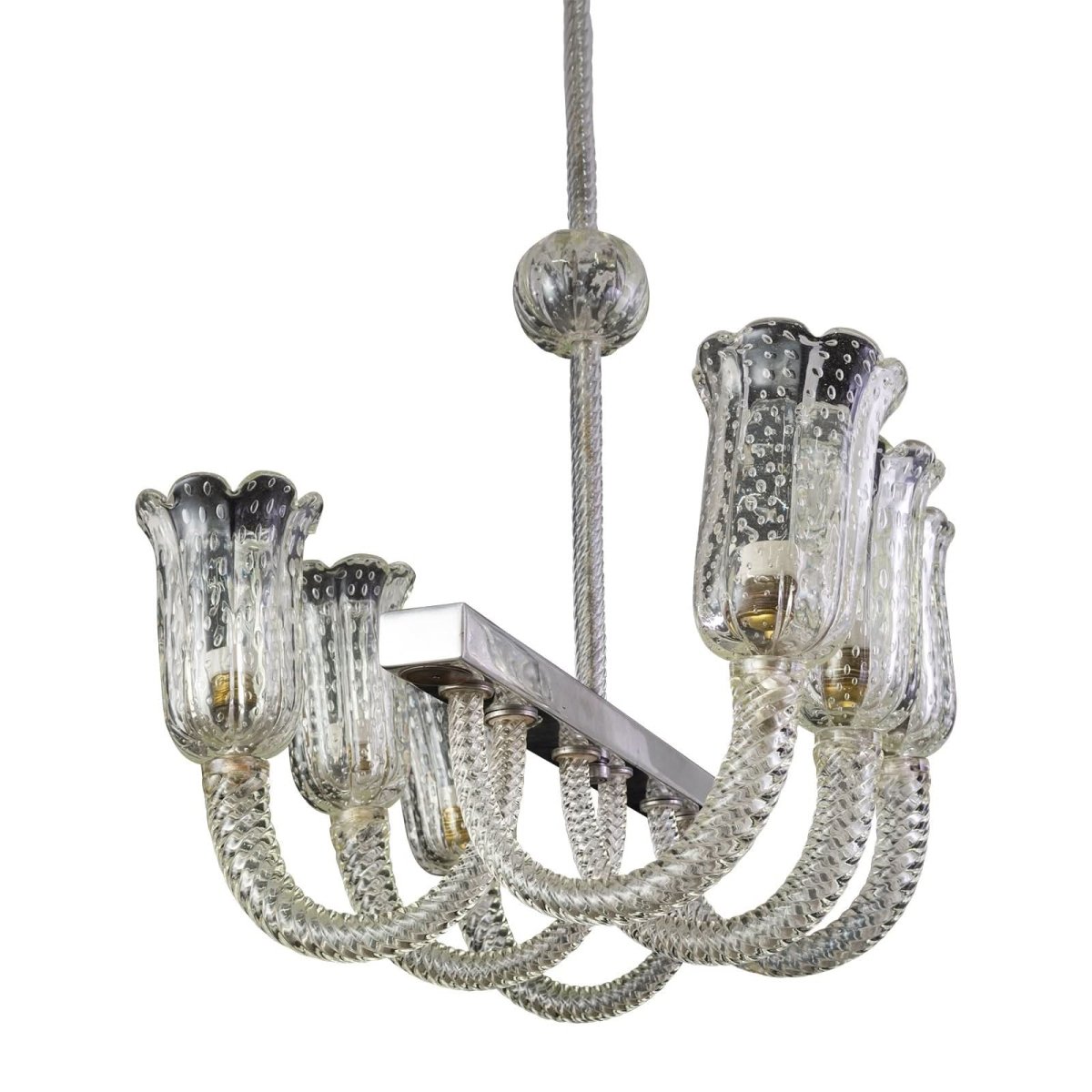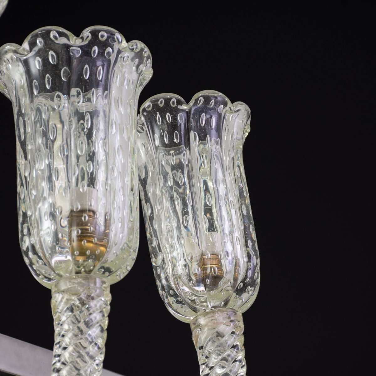 with six arms, with trumpet tops, the candle shades and rosette with bullicante detail and the arms and stem with twist decoration. The central base in chrome