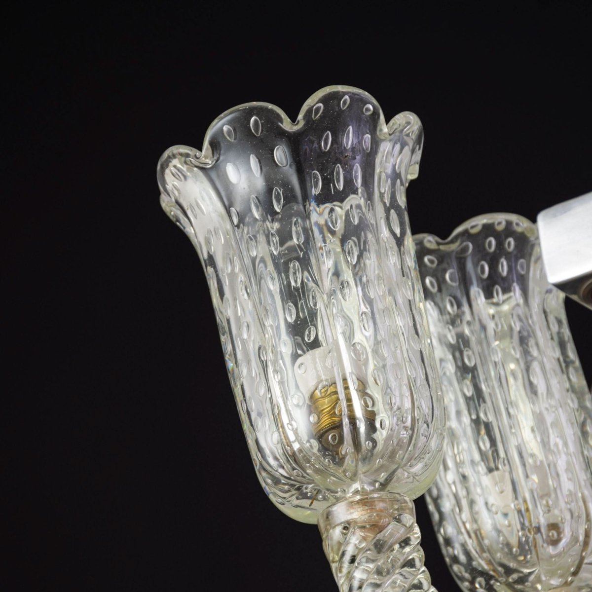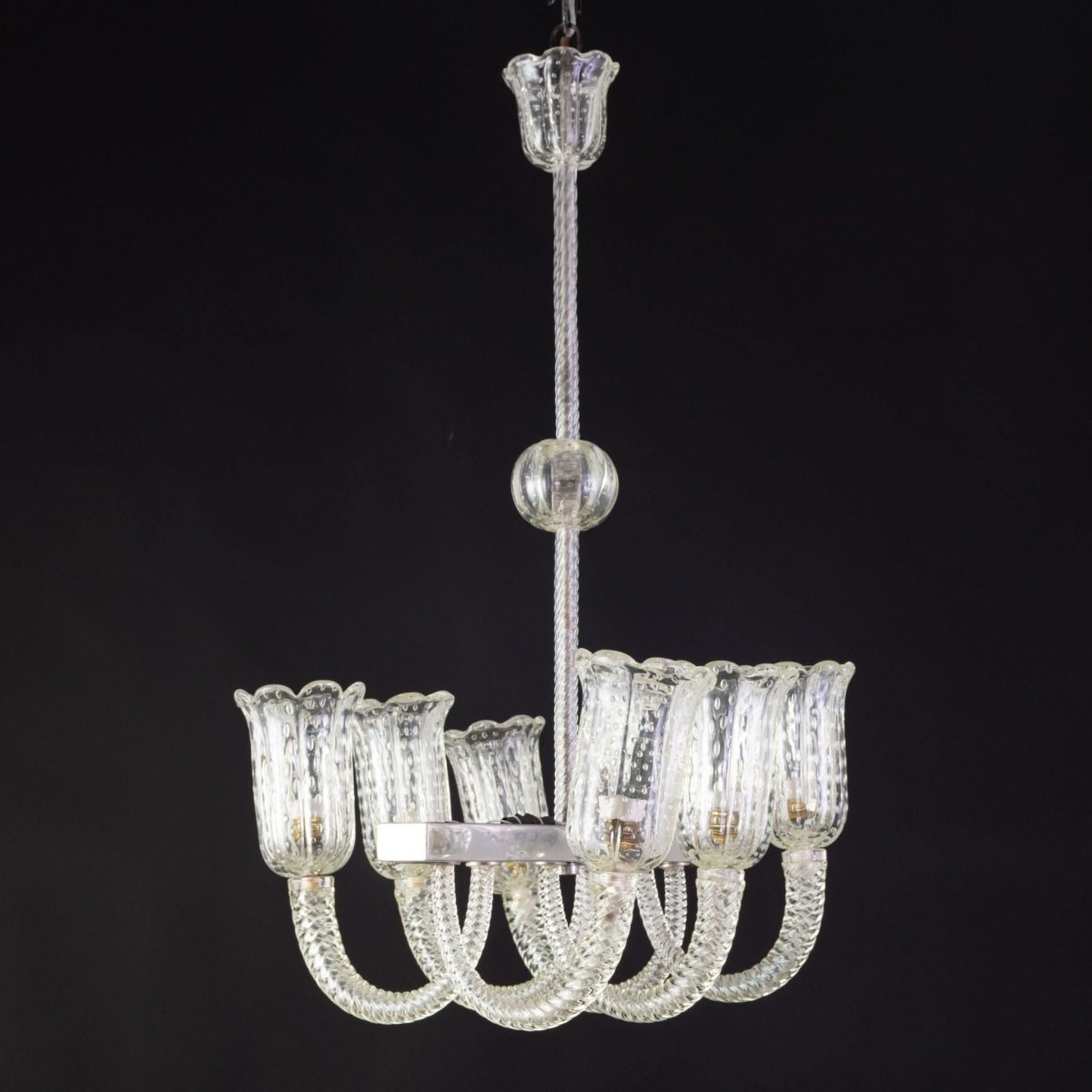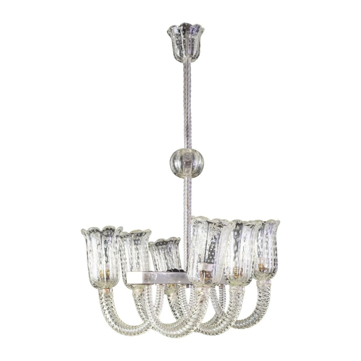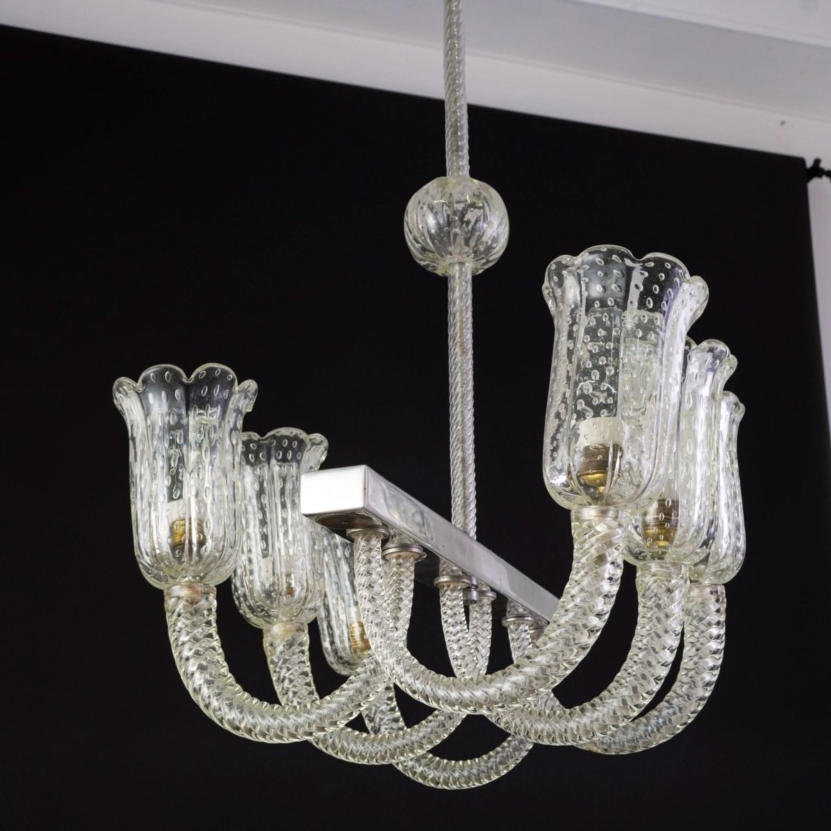 with six arms, with trumpet tops, the candle shades and rosette with bullicante detail and the arms and stem with twist decoration. The central base in chrome