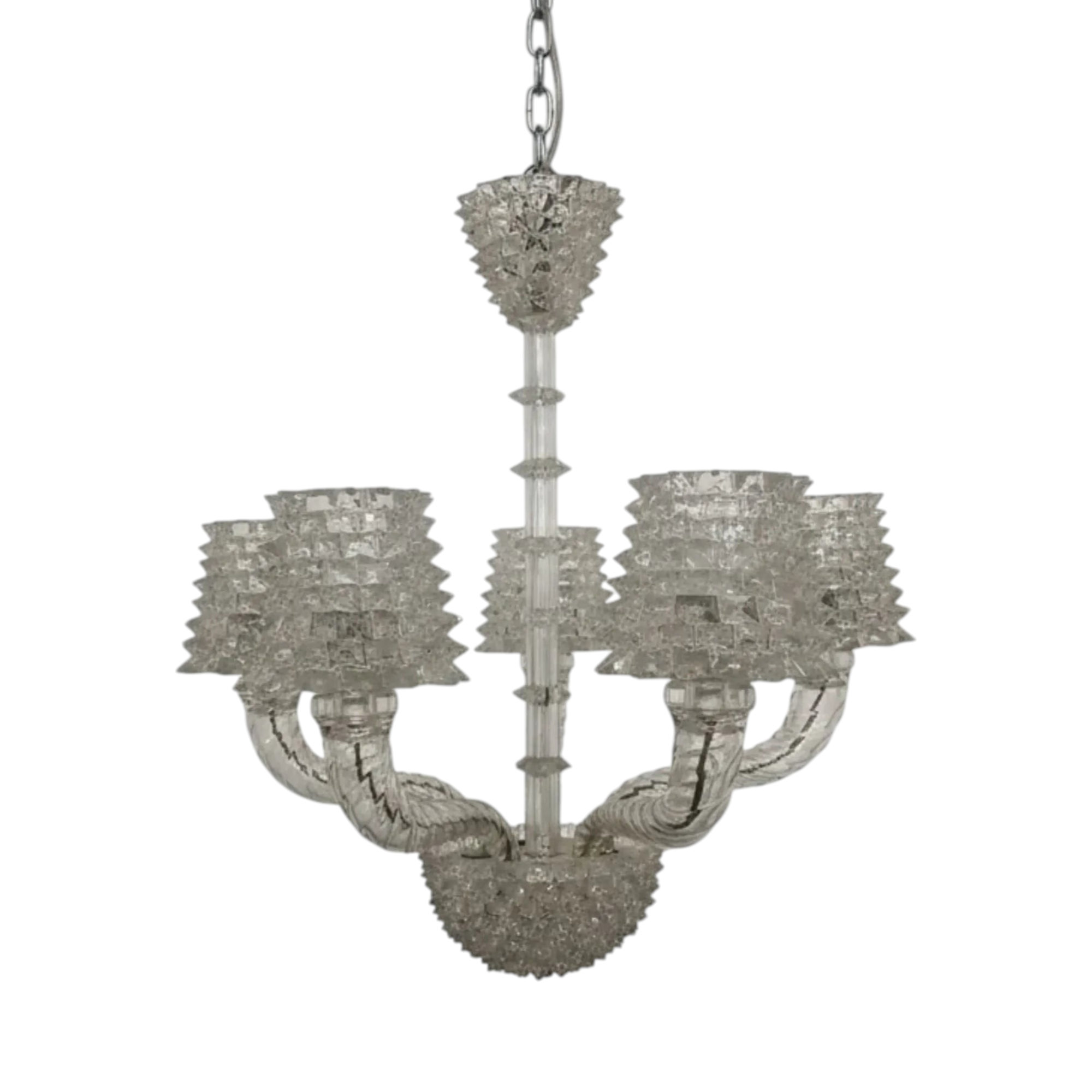 Barovier & Toso five-light chandelier in Murano glass, featuring the distinctive "rostrato", a technique invented by Ercole Barovier.