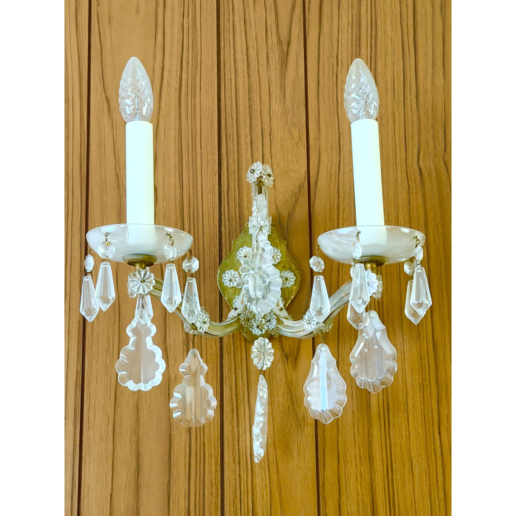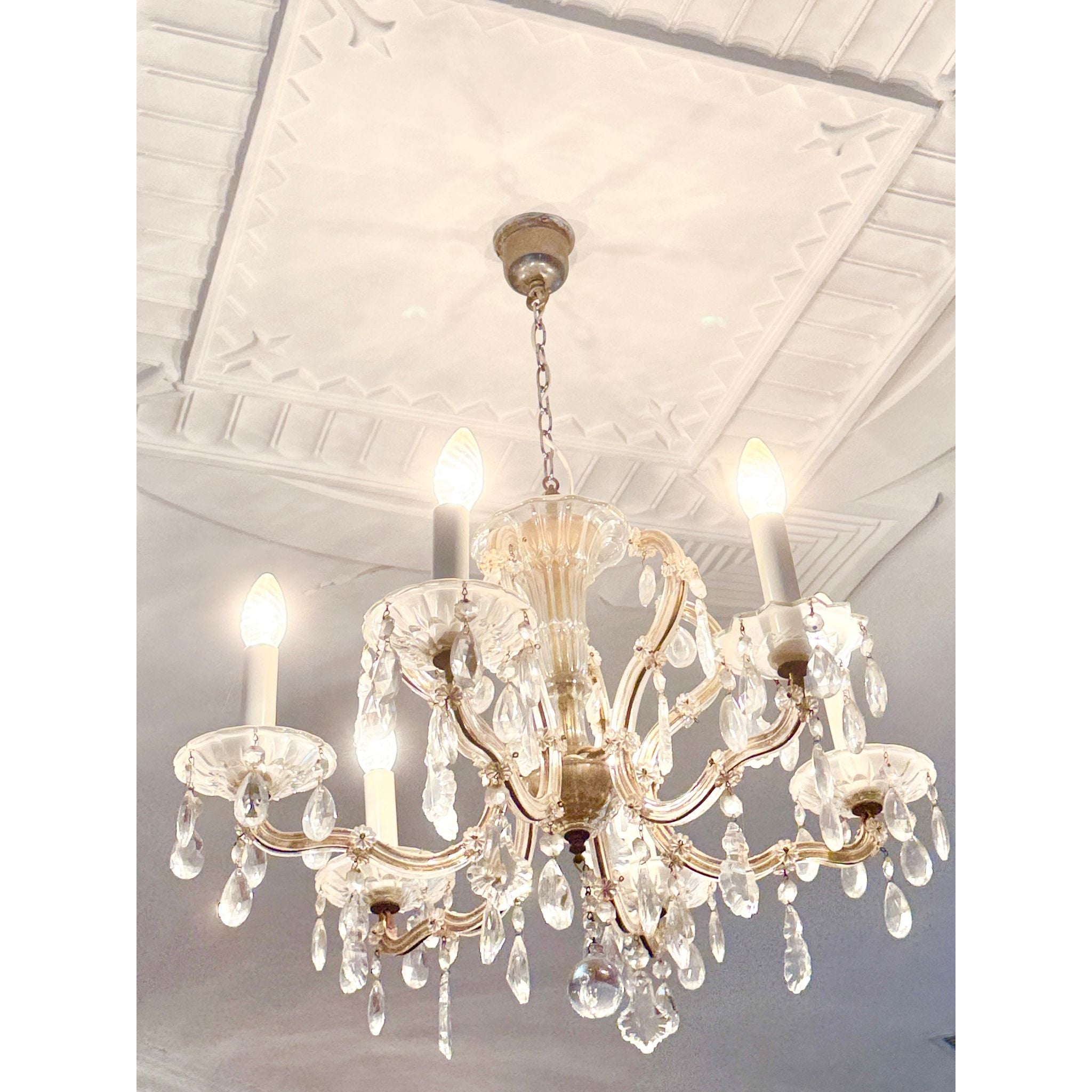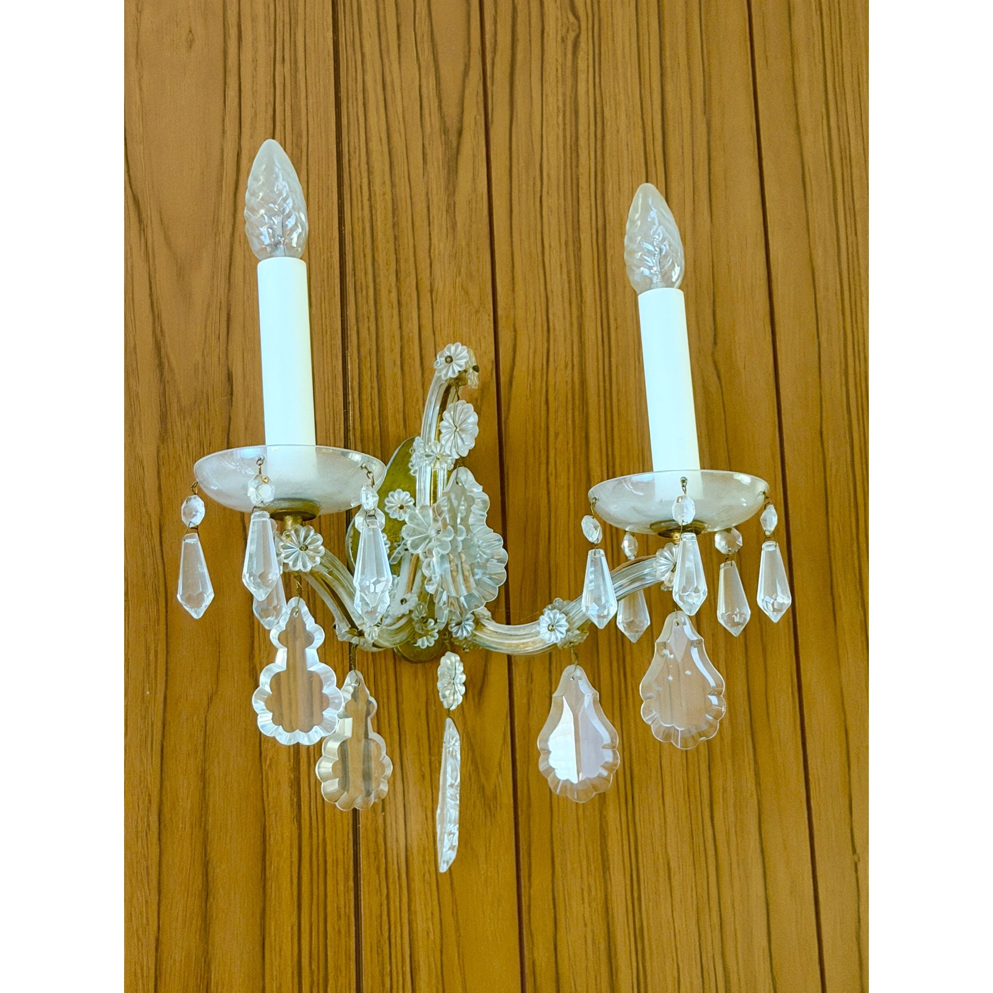 A beautiful vintage Maria Theresa style crystal chandelier with a matching pair of crystal wall sconces, ready to elevate a formal room, entry hall, dining space or period interior. The set features graceful curved arms and abundant faceted crystal drops that catch and reflect light, creating a classic, luxurious look.<\/span><\/p> The chandelier has six arms with original glass cups and a central finial. One of the glass cups on the chandelier is a slightly different shape, indicating it was likely replaced at some point — this does not detract from its overall aesthetic and function, but is noted for accuracy.<\/span><\/p> The matching wall sconces each have two arms with crystal dish cups and hanging pendants, echoing the chandelier’s style and making this a coordinated set ideal for cohesive lighting throughout a space.<\/span><\/p> Through close inspection of the detailing — the shaped crystal pendants, floral cut motifs and elegant arm profiles — this set is reminiscent of Lobmeyr Maria Theresa–style design, though specific maker marks may not be present. Maria Theresa style fixtures are inspired by the grand historic European crystal chandeliers of the 18th century and are prized in both traditional and eclectic interiors.<\/span><\/p> Very good vintage condition overall. The crystal drops and arms present beautifully with light wear consistent with age. No major cracks or missing crystals noted aside from the one replacement cup on the chandelier, which is shown in photos. Light surface wear to metal and fittings typical of genuine vintage pieces.<\/span><\/p> <\/p>Details<\/span><\/h3>