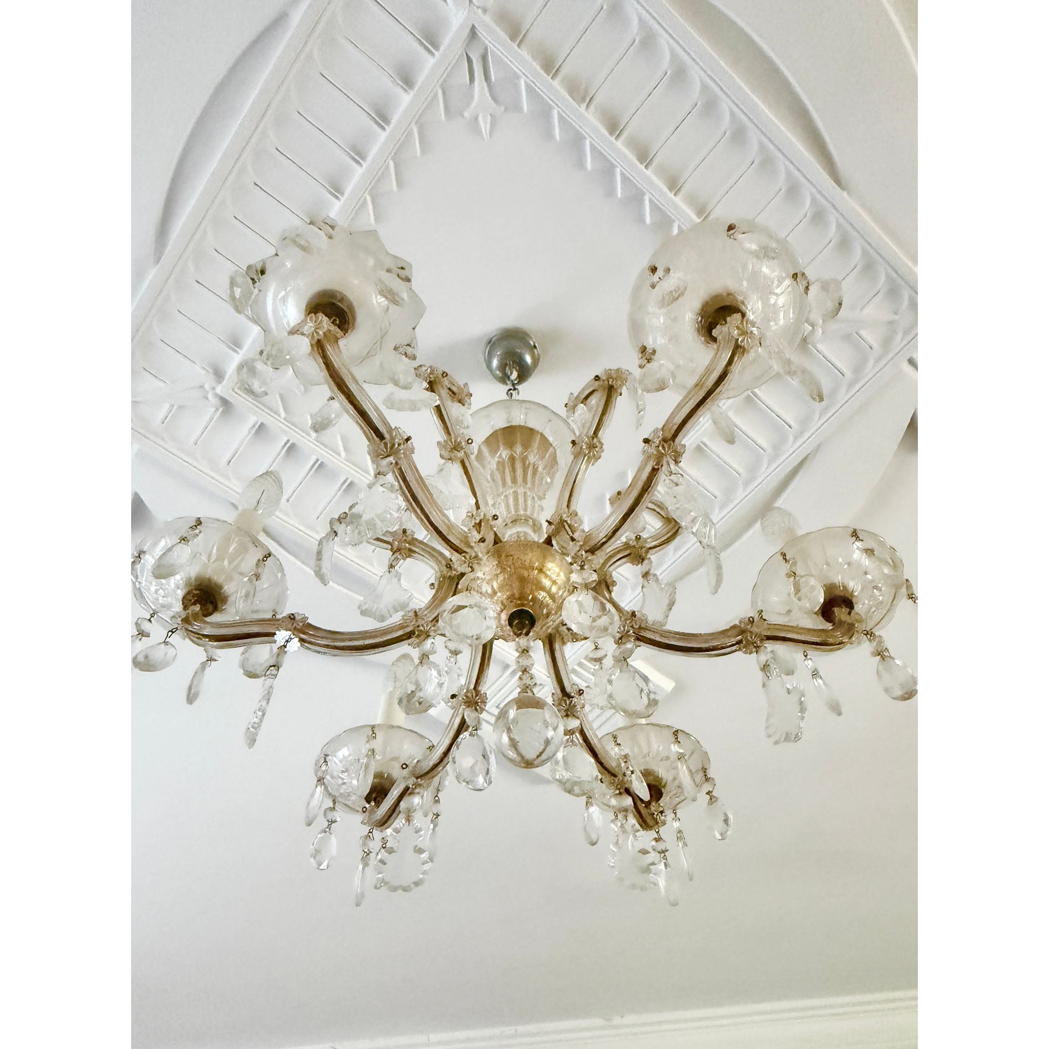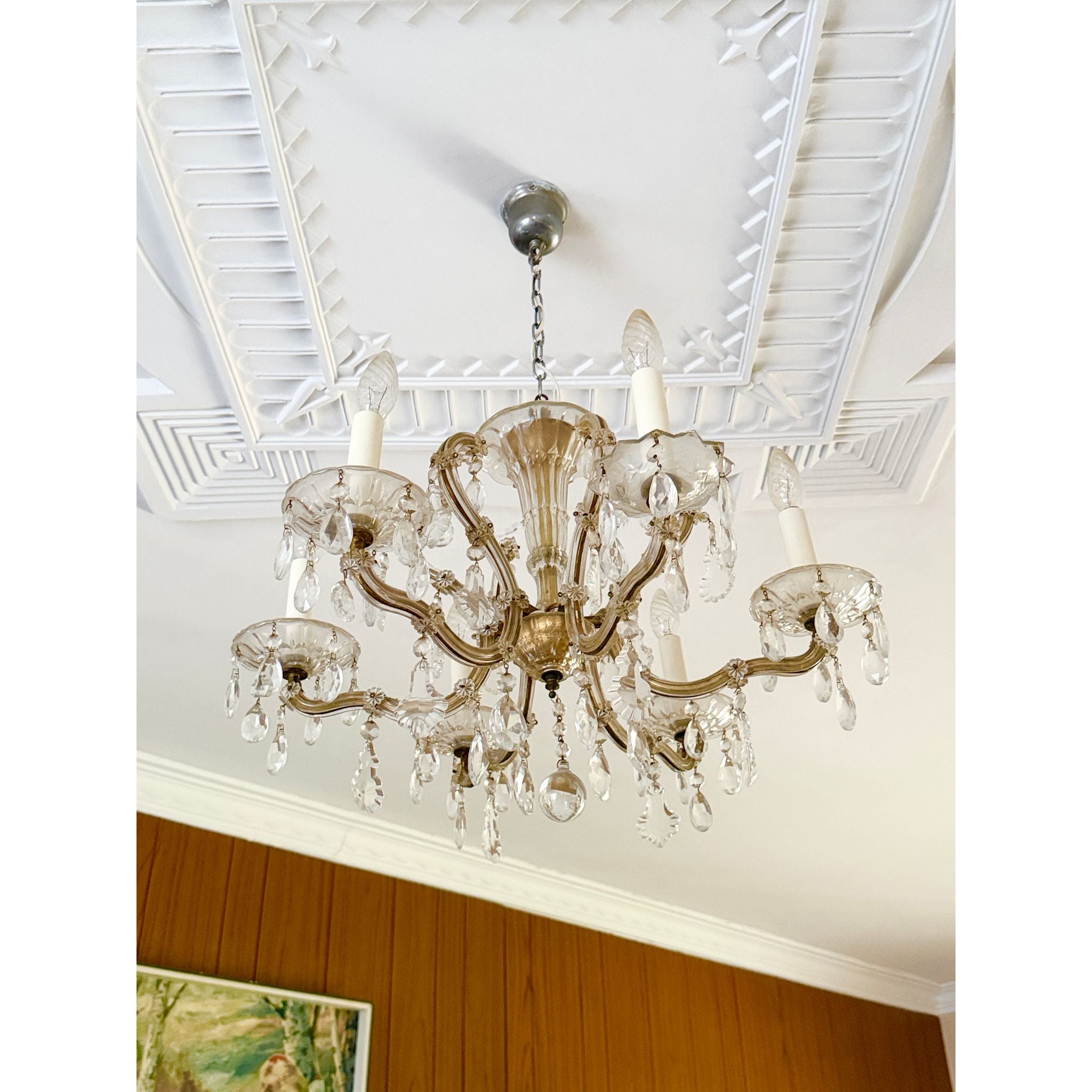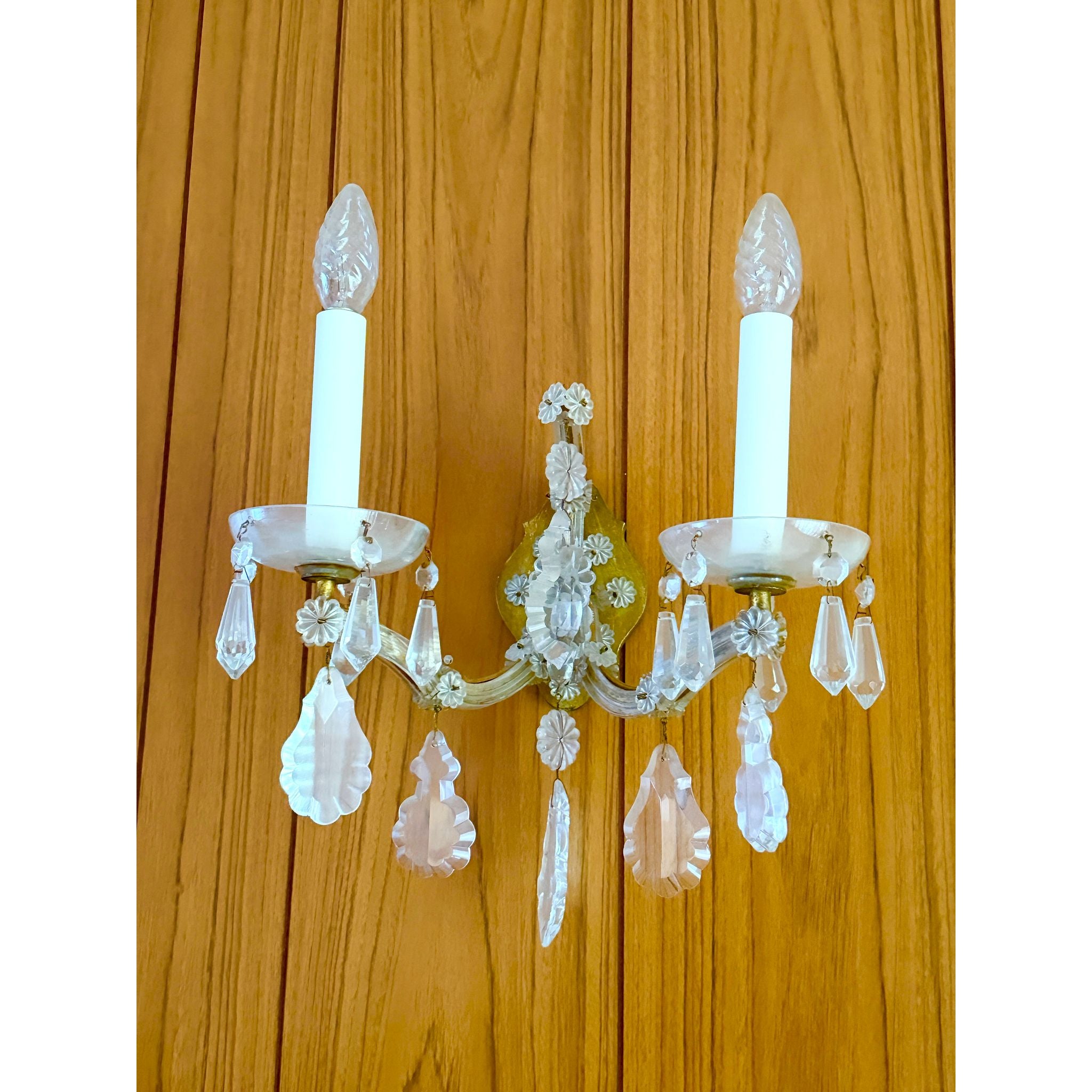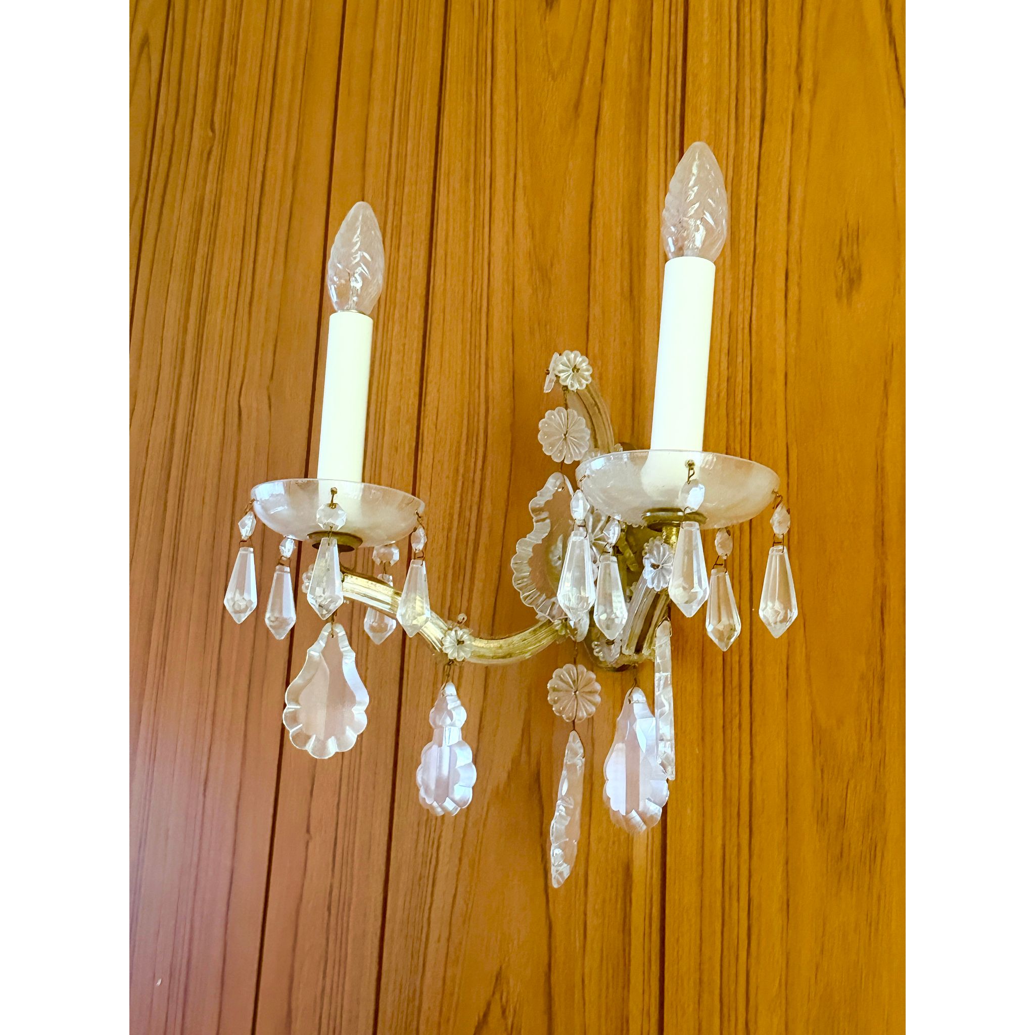 A beautiful vintage Maria Theresa style crystal chandelier with a matching pair of crystal wall sconces, ready to elevate a formal room, entry hall, dining space or period interior. The set features graceful curved arms and abundant faceted crystal drops that catch and reflect light, creating a classic, luxurious look.<\/span><\/p> The chandelier has six arms with original glass cups and a central finial. One of the glass cups on the chandelier is a slightly different shape, indicating it was likely replaced at some point — this does not detract from its overall aesthetic and function, but is noted for accuracy.<\/span><\/p> The matching wall sconces each have two arms with crystal dish cups and hanging pendants, echoing the chandelier’s style and making this a coordinated set ideal for cohesive lighting throughout a space.<\/span><\/p> Through close inspection of the detailing — the shaped crystal pendants, floral cut motifs and elegant arm profiles — this set is reminiscent of Lobmeyr Maria Theresa–style design, though specific maker marks may not be present. Maria Theresa style fixtures are inspired by the grand historic European crystal chandeliers of the 18th century and are prized in both traditional and eclectic interiors.<\/span><\/p> Very good vintage condition overall. The crystal drops and arms present beautifully with light wear consistent with age. No major cracks or missing crystals noted aside from the one replacement cup on the chandelier, which is shown in photos. Light surface wear to metal and fittings typical of genuine vintage pieces.<\/span><\/p> <\/p>Details<\/span><\/h3>